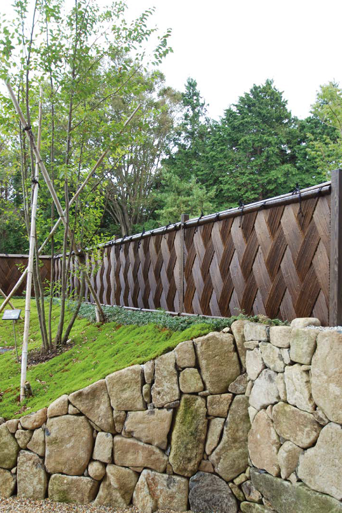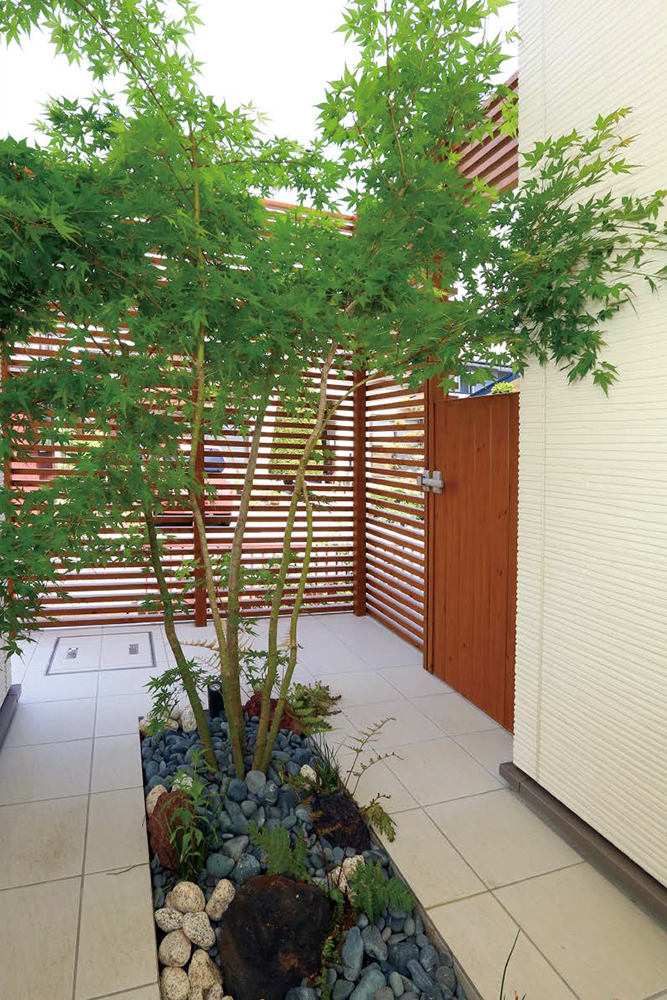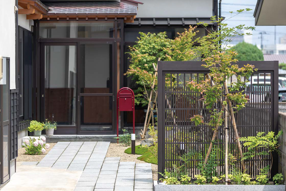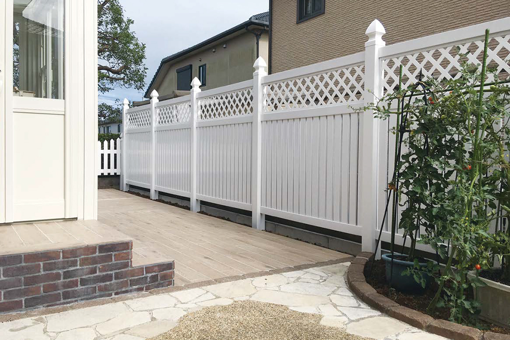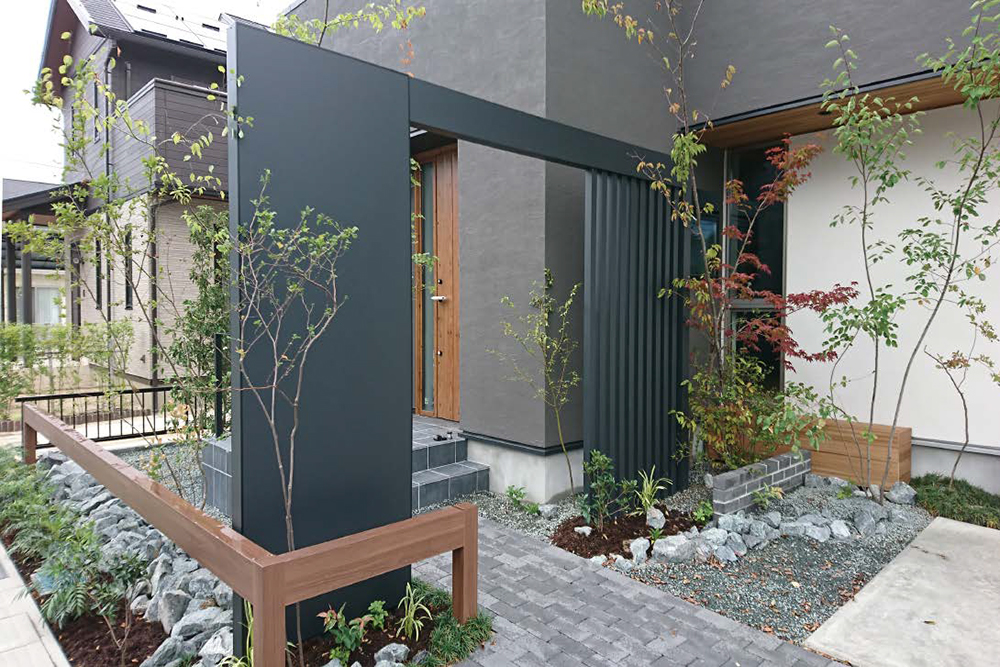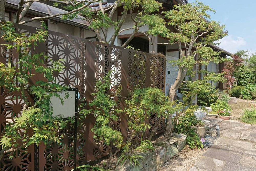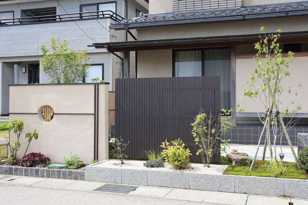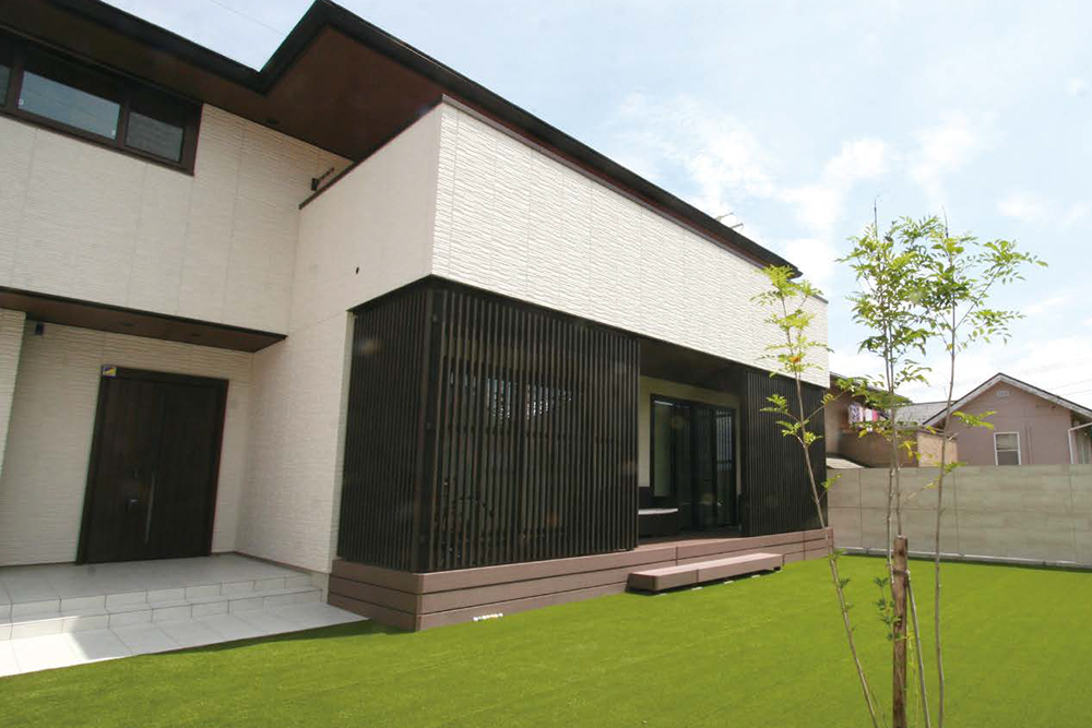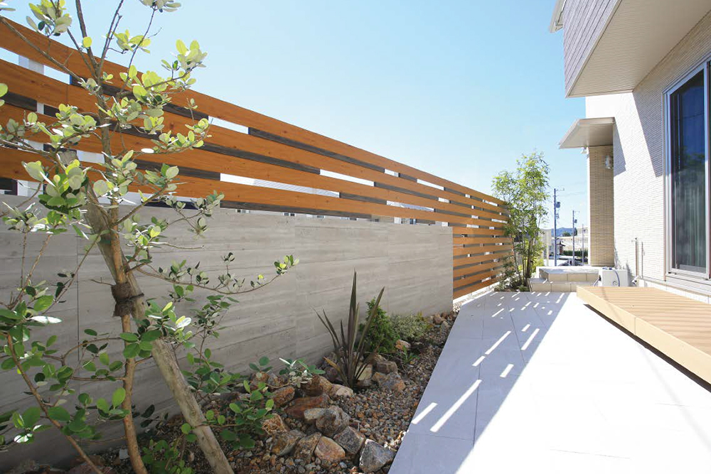 建物の側面にエバーアートウッドを取り入れ、格子デザインによる目かくし効果としての機能だけではなく、建物を引き立たせる高い意匠性も与えるエクステリアに仕上がっております。また、くり柾目のナチュルな色合いを持つエバーアートウッドが、まるで本物の木のように周囲の植栽や石材などの自然素材に違和感なく溶け込んでおり、景観と調和した美しい作品となっております。