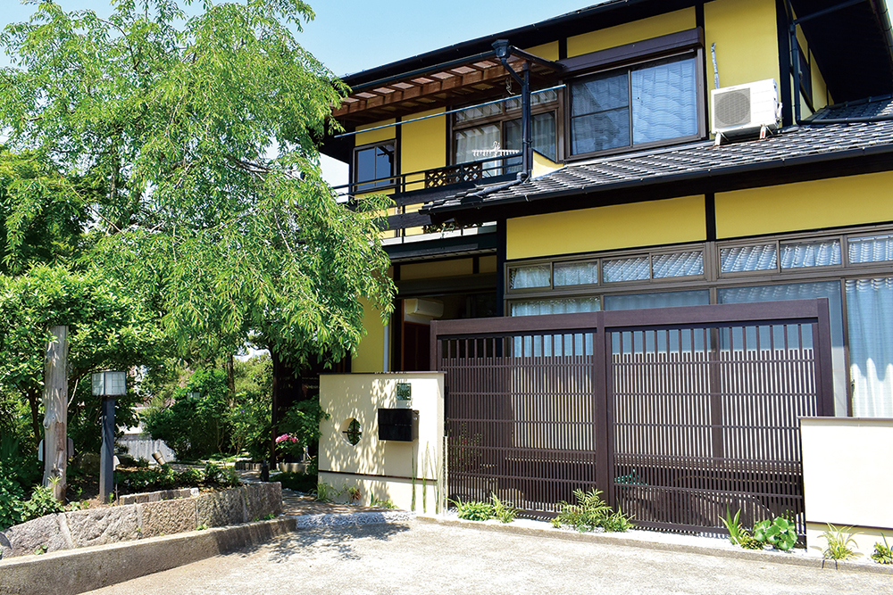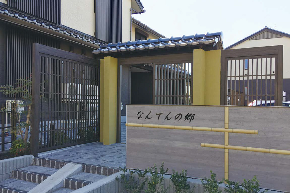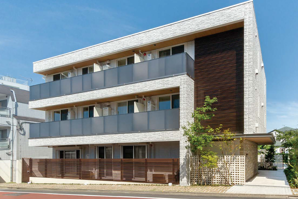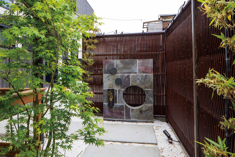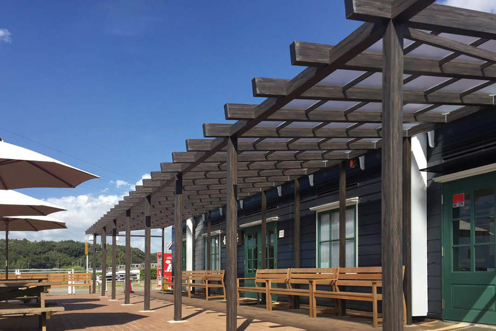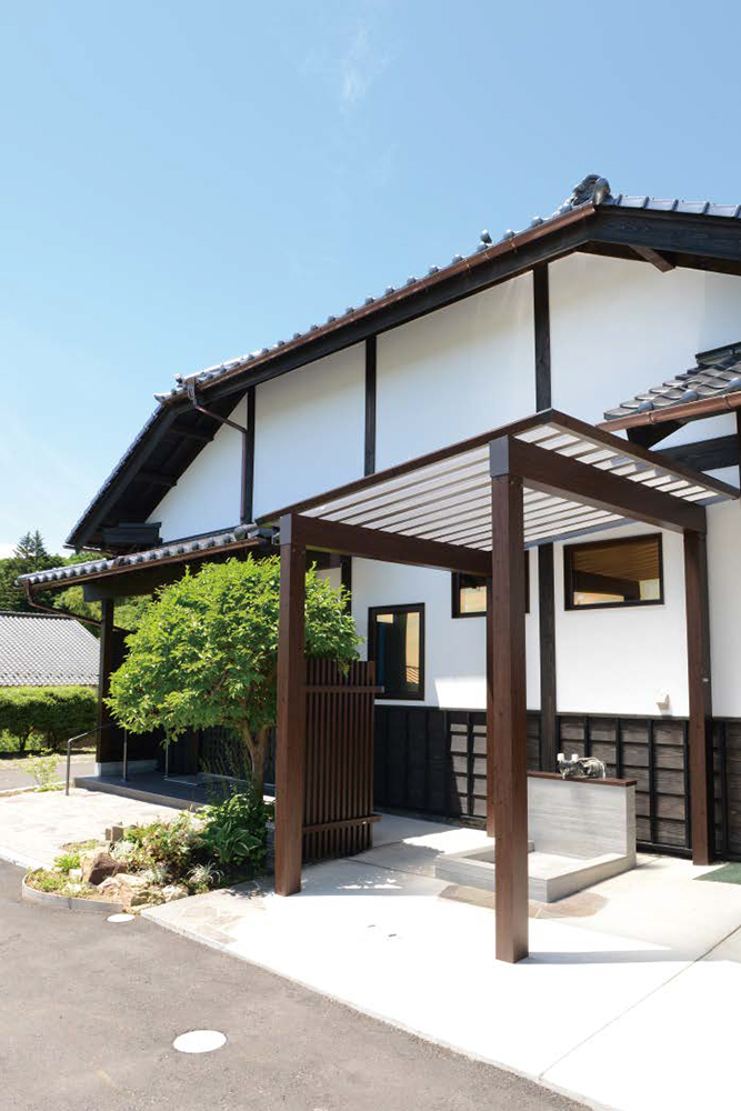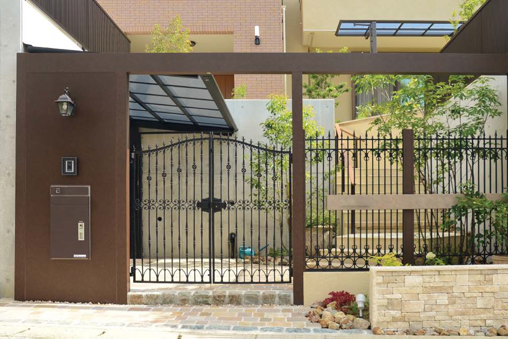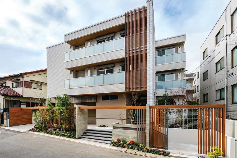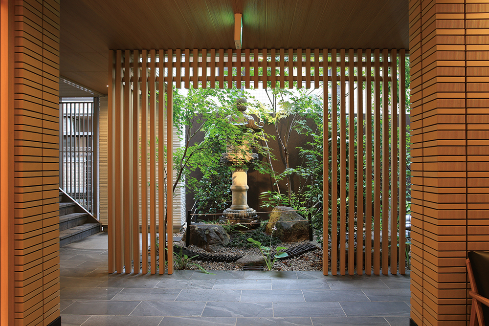 建物の側面にエバーアートウッドを取り入れ、格子デザインによる目かくし効果としての機能だけではなく、建物を引き立たせる高い意匠性も与えるエクステリアに仕上がっております。また、くり柾目のナチュルな色合いを持つエバーアートウッドが、まるで本物の木のように周囲の植栽や石材などの自然素材に違和感なく溶け込んでおり、景観と調和した美しい作品となっております。