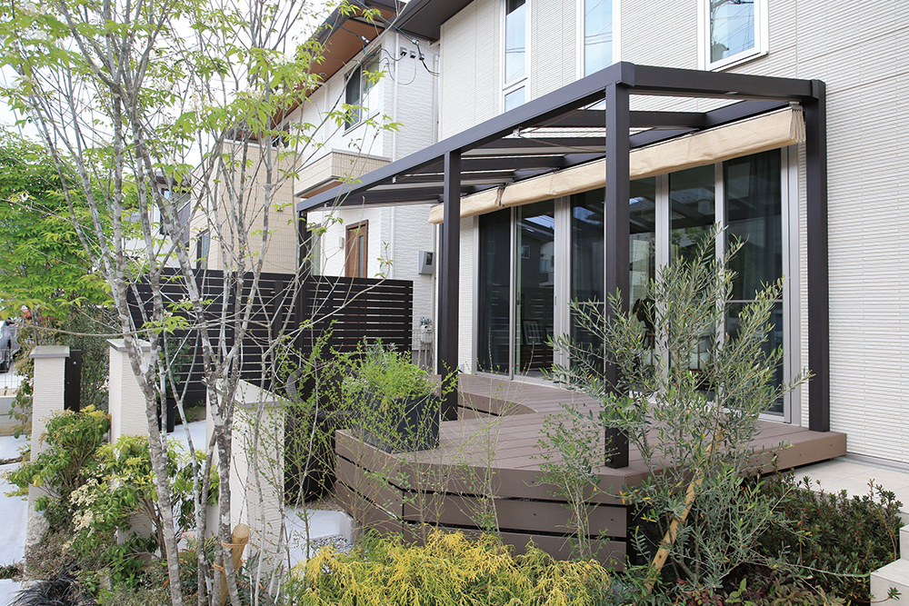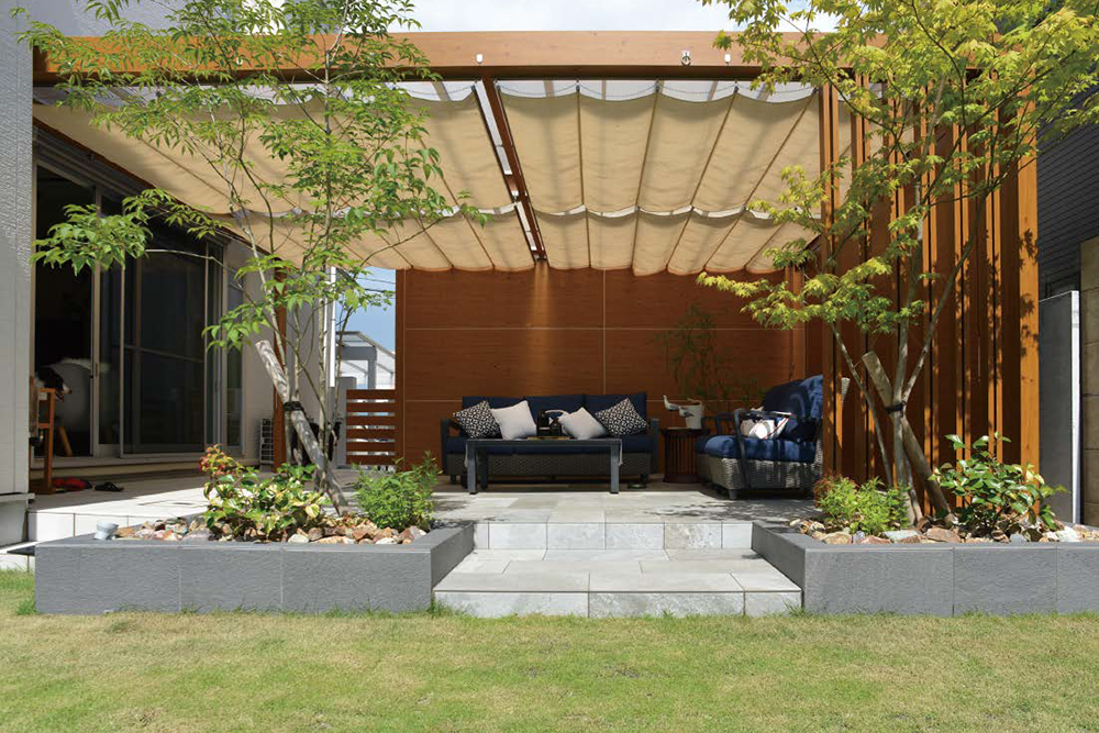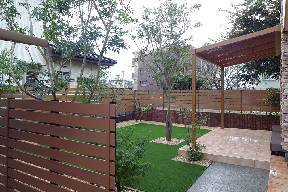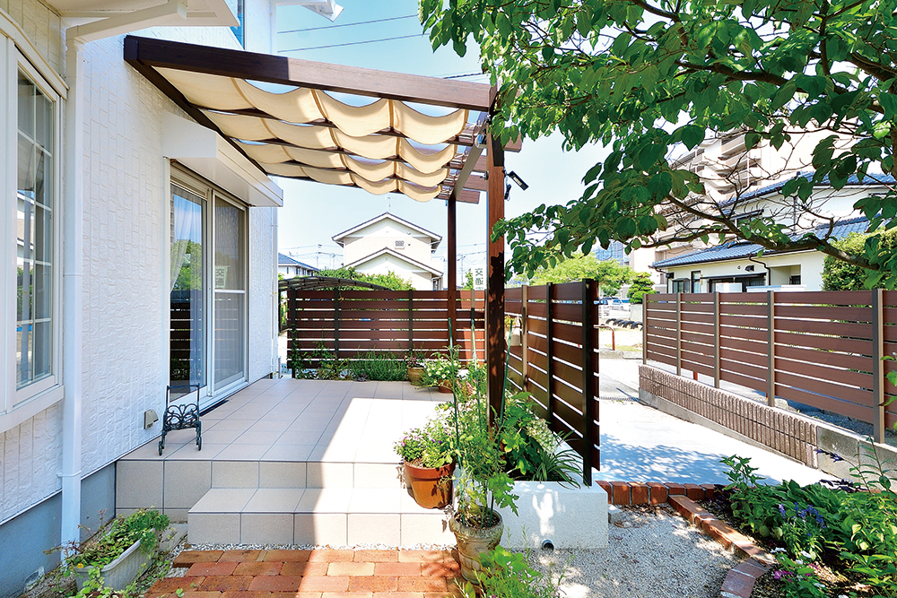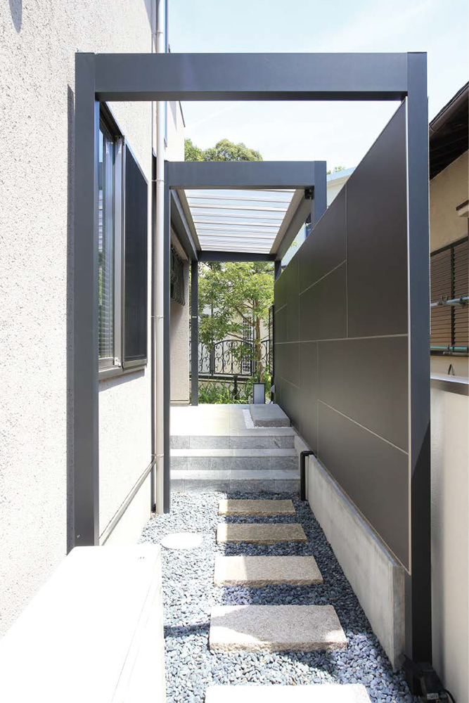 雑草が生い茂るほどに、ほとんど活用されていなかった庭に、風や光、緑を感じる心地よいテラス空間が生まれました。テラスのメインとなる部分にはポーチスカイルーフを採用。その電動ルーバーにより、日差しや風の流れを季節やその日の状況に合わせて調節できるルーフ空間に。道路側の面にはエバーアートボードで壁をつくり目かくしすることで、よりプライベートな空間を演出しております。また、ホームヤードルーフを繋げることで、庭の一部ではなく庭全体が建物と一体化し、ご家族にとっての新しい生活空間へと見事に生まれ変わりました。