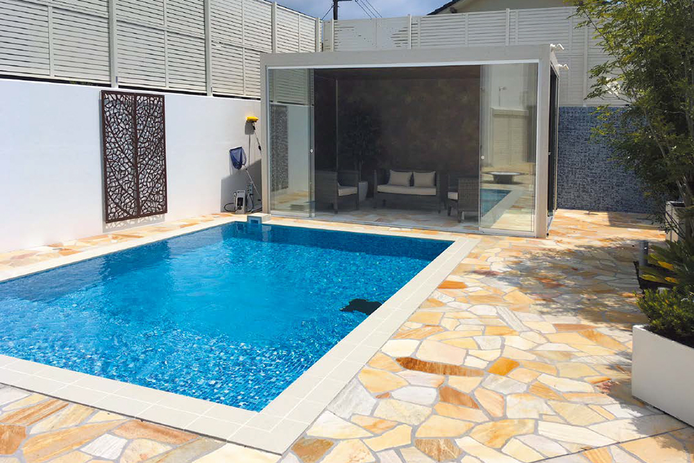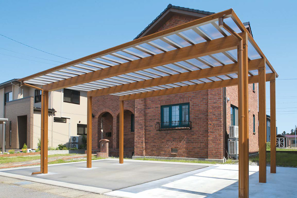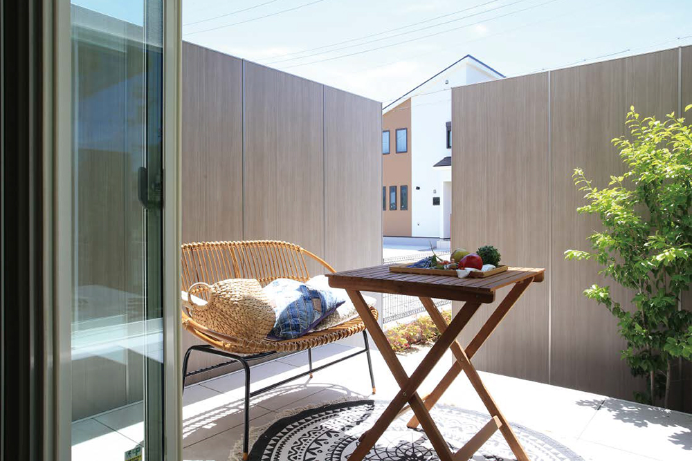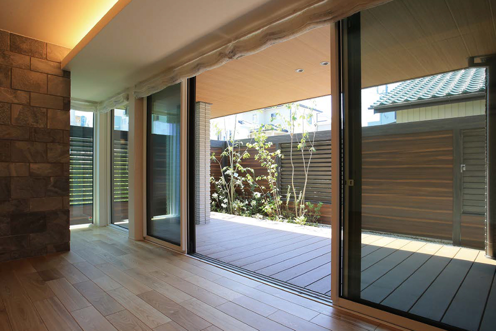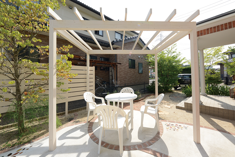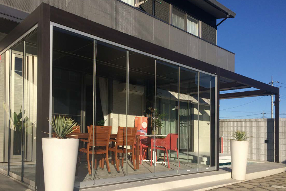 雑草が生い茂るほどに、ほとんど活用されていなかった庭に、風や光、緑を感じる心地よいテラス空間が生まれました。テラスのメインとなる部分にはポーチスカイルーフを採用。その電動ルーバーにより、日差しや風の流れを季節やその日の状況に合わせて調節できるルーフ空間に。道路側の面にはエバーアートボードで壁をつくり目かくしすることで、よりプライベートな空間を演出しております。また、ホームヤードルーフを繋げることで、庭の一部ではなく庭全体が建物と一体化し、ご家族にとっての新しい生活空間へと見事に生まれ変わりました。