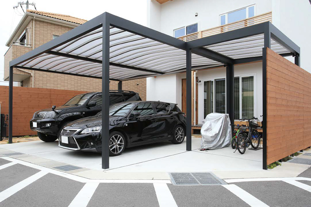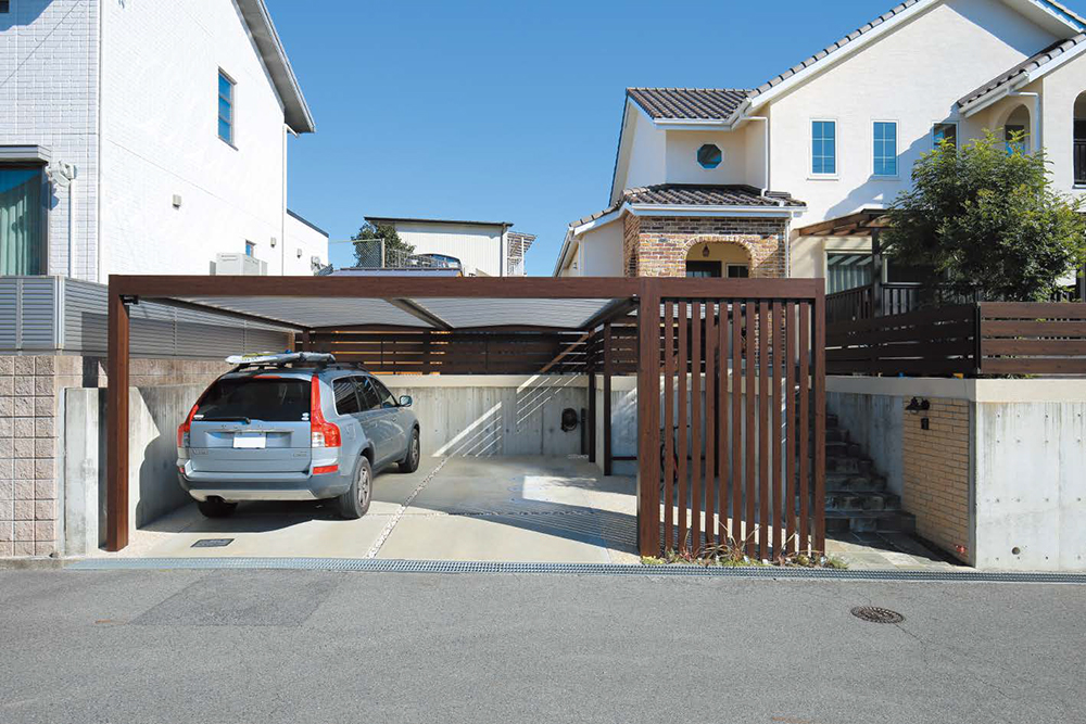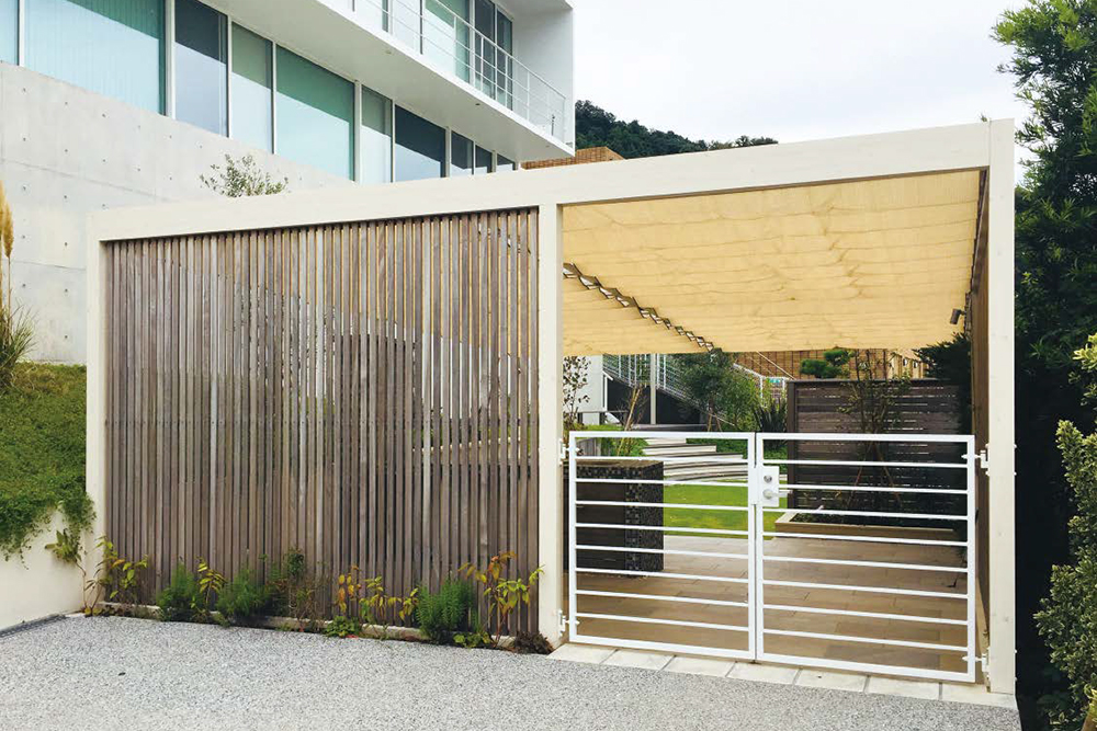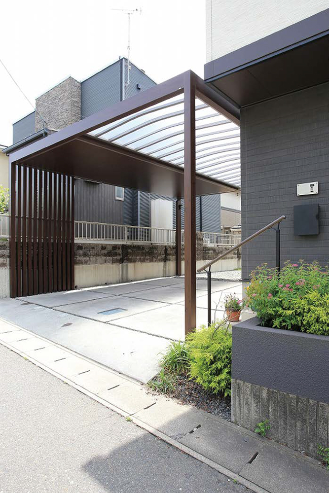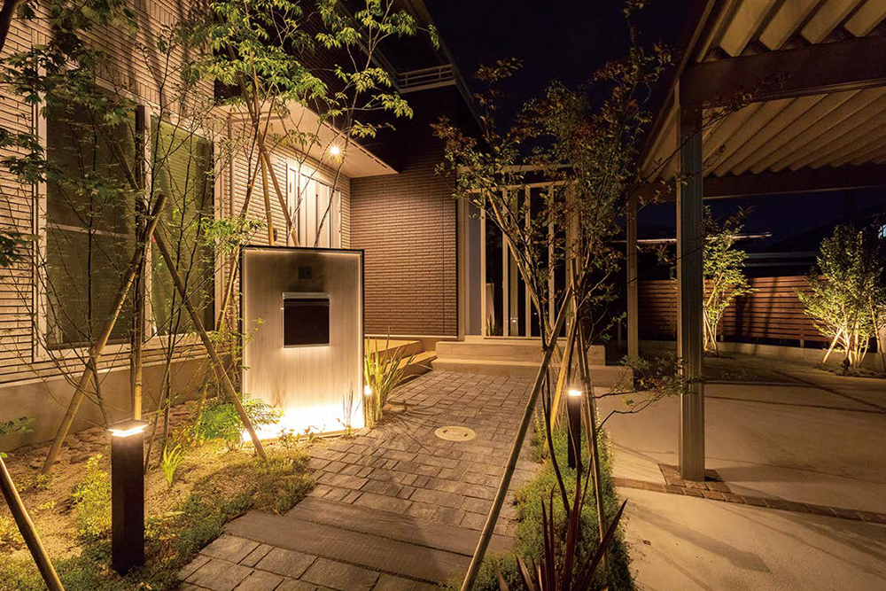 高低差のある敷地でありながらも、ホームヤードルーフカーヤードスタイルを中心に、建物に合わせた水平ラインを意識したファサードデザインにより、建物との一体感が生まれております。カーヤードスタイルの本体カラーにはマットライトグレーを採用し、全体をモノトーンな色合いでコーディネートすることで、モダンな住宅に調和するデザインに仕上がっております。また、後方には庭の目かくしを兼ねた異なる2色のスリットを設け、カーヤードに豊かな表情を与えます。夜は、天井部に設けられたダウンライトのライトアップにより空間が美しく彩られ、日中とは異なる光の演出を楽しめる作品となっております。