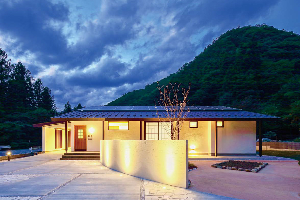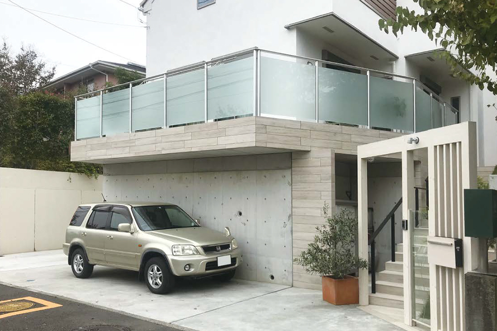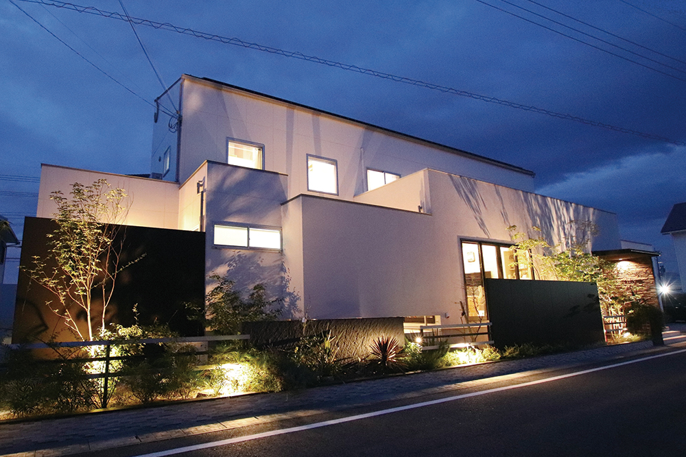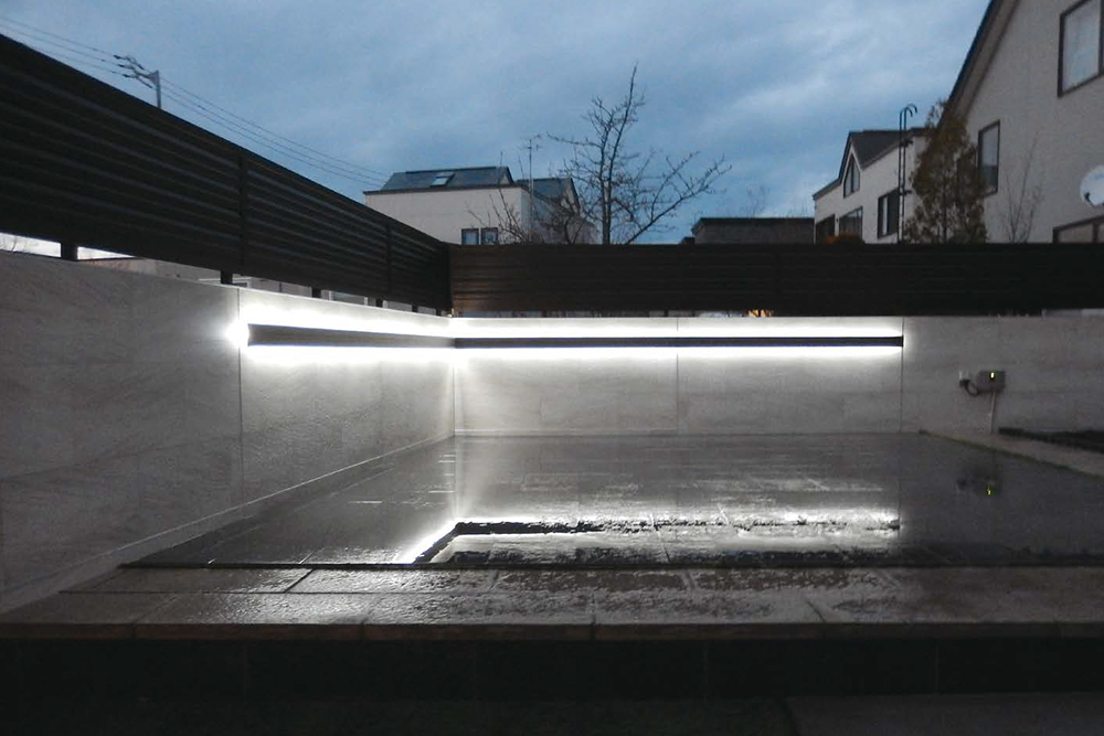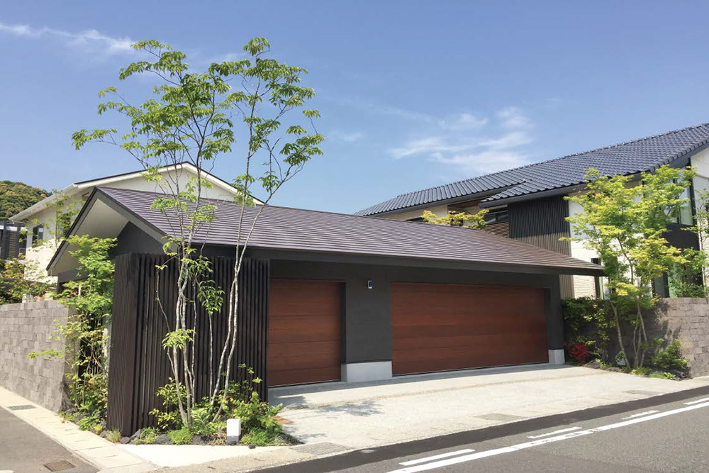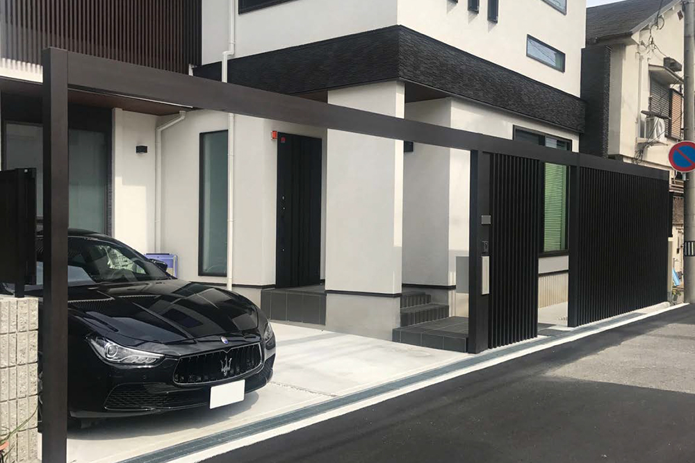 高低差のある敷地でありながらも、ホームヤードルーフカーヤードスタイルを中心に、建物に合わせた水平ラインを意識したファサードデザインにより、建物との一体感が生まれております。カーヤードスタイルの本体カラーにはマットライトグレーを採用し、全体をモノトーンな色合いでコーディネートすることで、モダンな住宅に調和するデザインに仕上がっております。また、後方には庭の目かくしを兼ねた異なる2色のスリットを設け、カーヤードに豊かな表情を与えます。夜は、天井部に設けられたダウンライトのライトアップにより空間が美しく彩られ、日中とは異なる光の演出を楽しめる作品となっております。