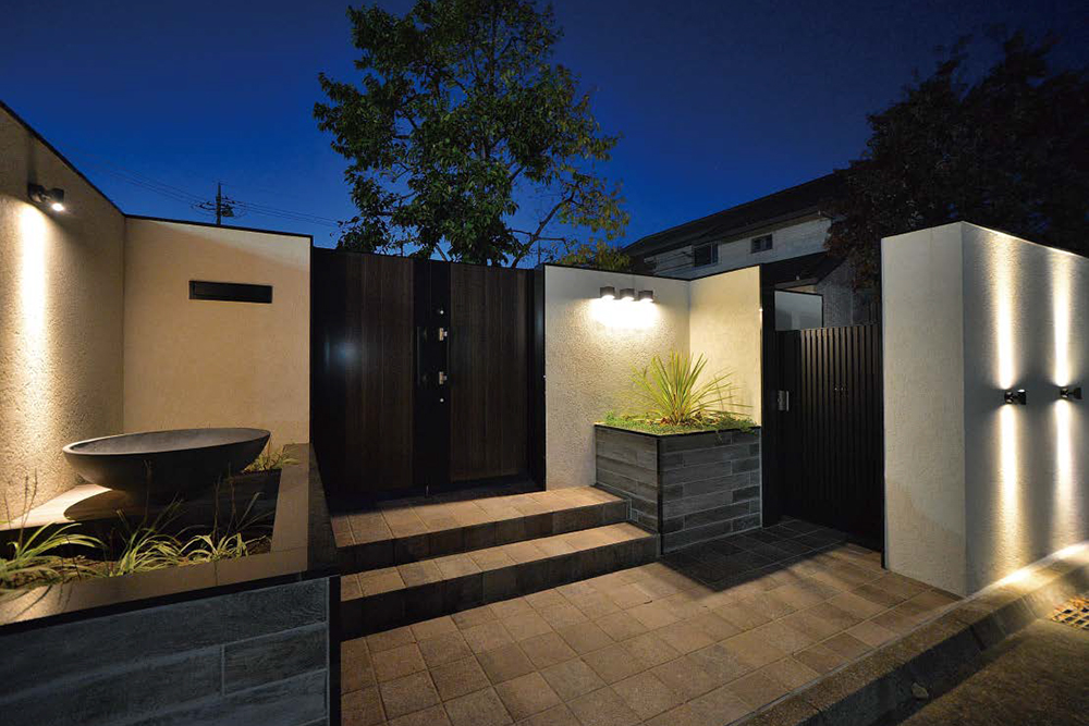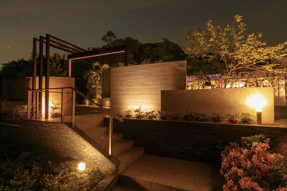 植栽などの自然素材を活かしたナチュラルな空間に、それぞれの素材に合わせた光を配置することで、夜でも植栽の緑や門袖の素材感を感じることのできるデザインに仕上がっております。樹木に対しては下からライトアップすることで1本1本の植栽が美しく浮かび上がり、幻想的な雰囲気に。明るすぎない落ち着いた照明計画で夜の街並みに優しく溶け込み、心地よい空間に仕上がっております。