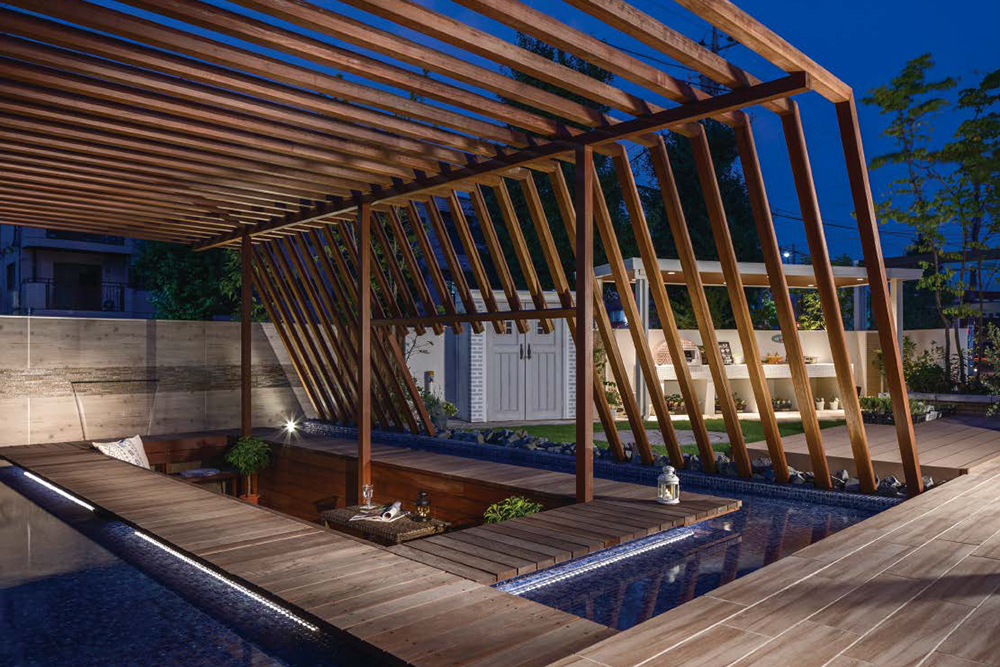 屋上に設けられた独立した離れ。そこはヴィンテージ調による落ち着いたスタイルで、個性が光る空間。ホームヤードルーフシステムの開放的なバーカウンターだけでなく、オールグラスポーチを隣接することで、用途の異なる2つの空間が生まれます。壁面のレンガに合わせて、天井部にエバーアートボードを貼り付けることで、テイストを損なわずにデザイン性を高めます。離れの手前には、空間と調和するように選び抜かれた色彩豊かな植栽を配置することで、ゆったりと寛ぎながら自然を堪能できます。空間全体までこだわりを持たせつつ、統一感ある寛ぎの部屋に仕上がっております。
