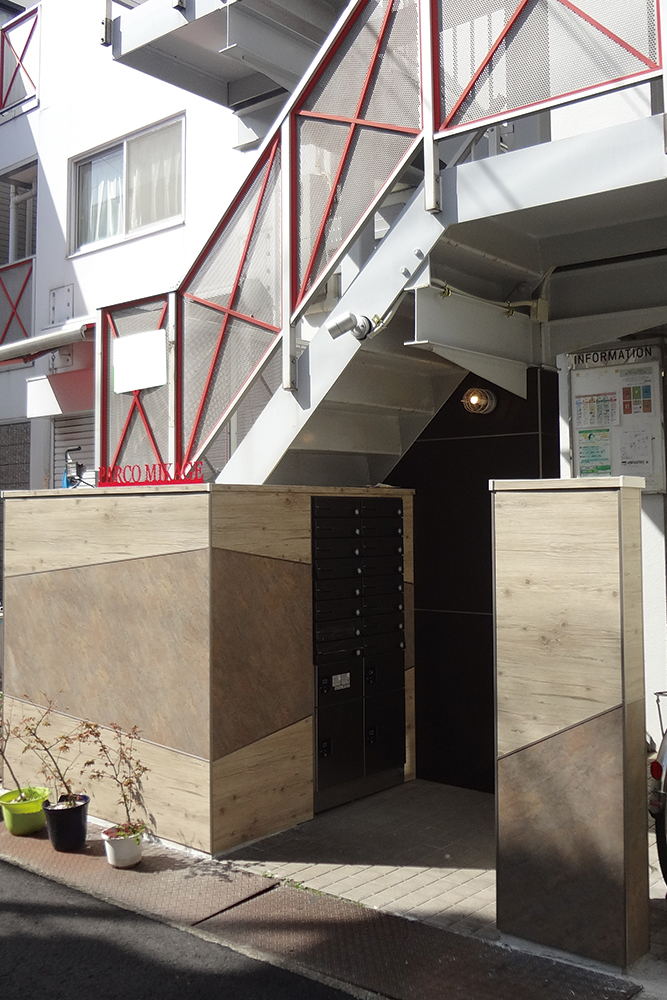 集合住宅にあるエントランスの壁面化粧材としてエバー竹林ボードを使用。竹林ボードの本物さながらの質感と表情が空間に深みを与え、味わい深い和の趣を醸し出します。夜は左右の壁面で異なる灯りの演出により、それぞれの素材が魅せる立体感のある陰影を巧みに活かし、奥行きのある光の表情が生まれております。昼と夜で異なる表情を魅せるエントランスは、住まう人にとって心地よい空間になっているのではないのでしょうか。