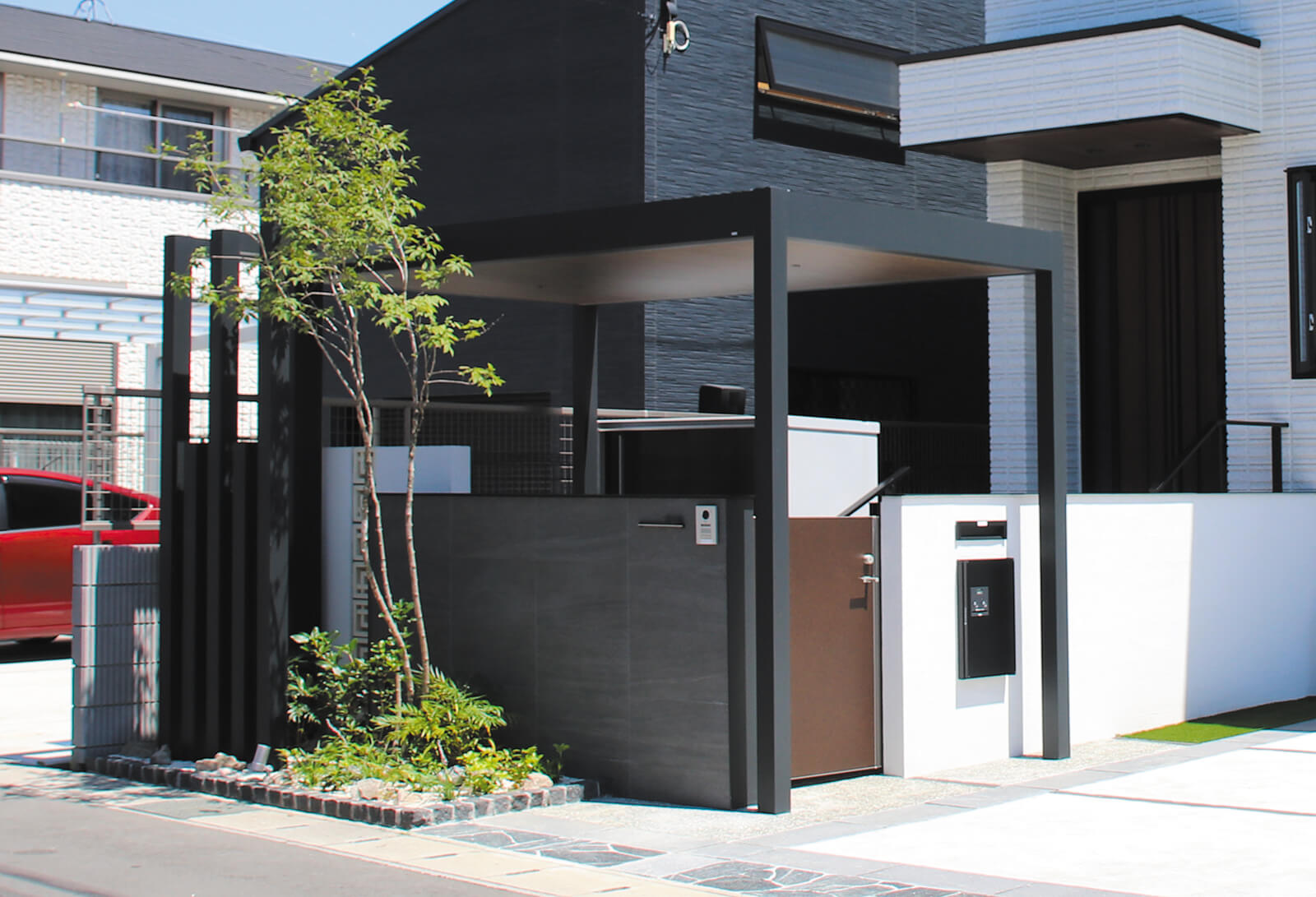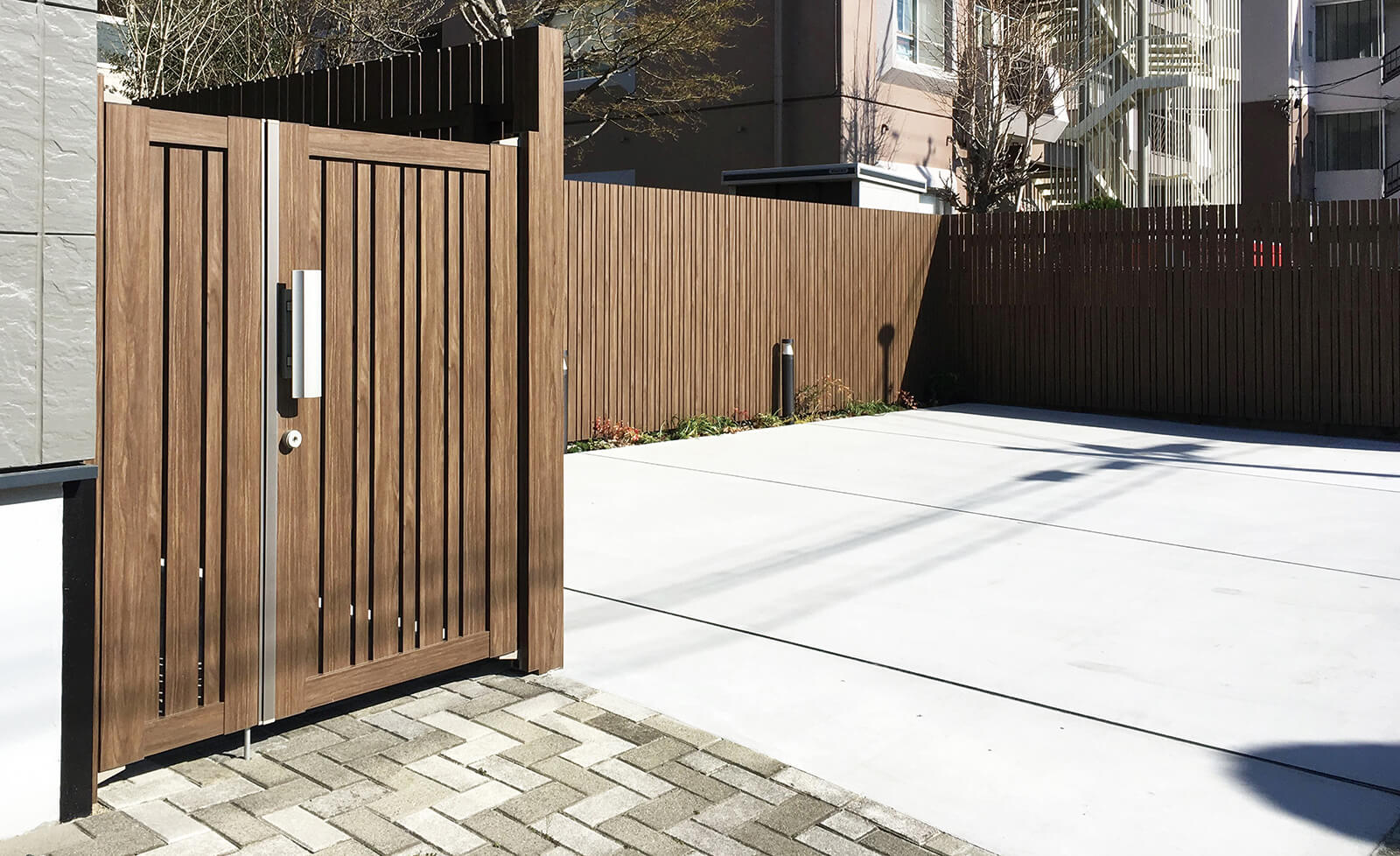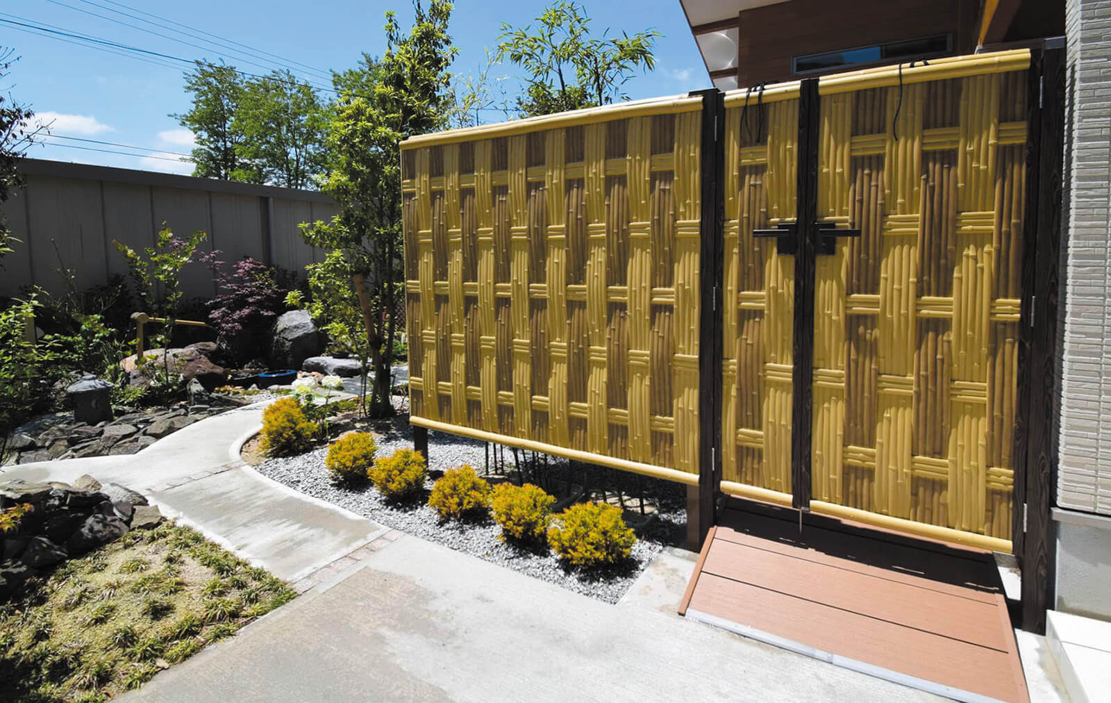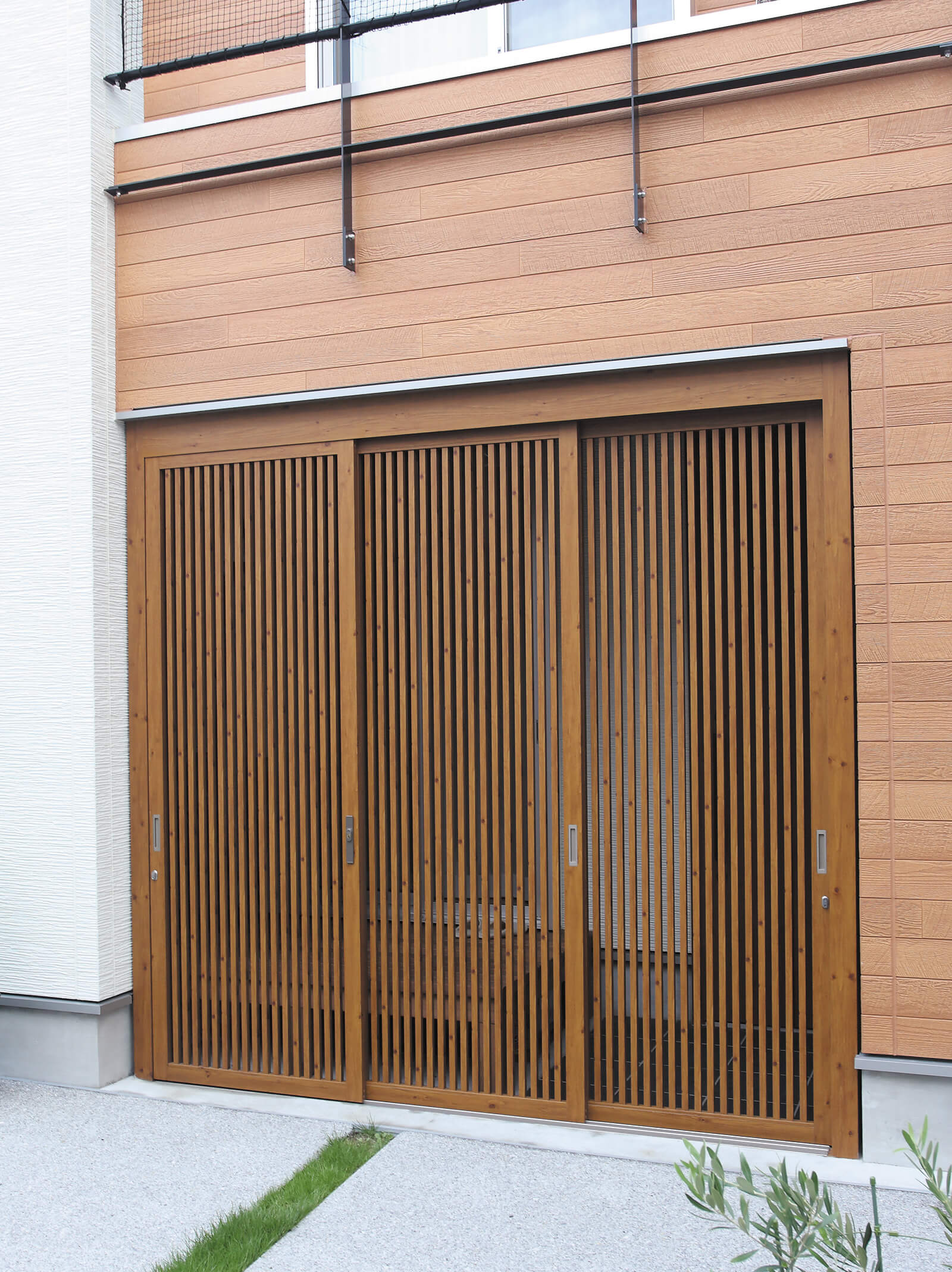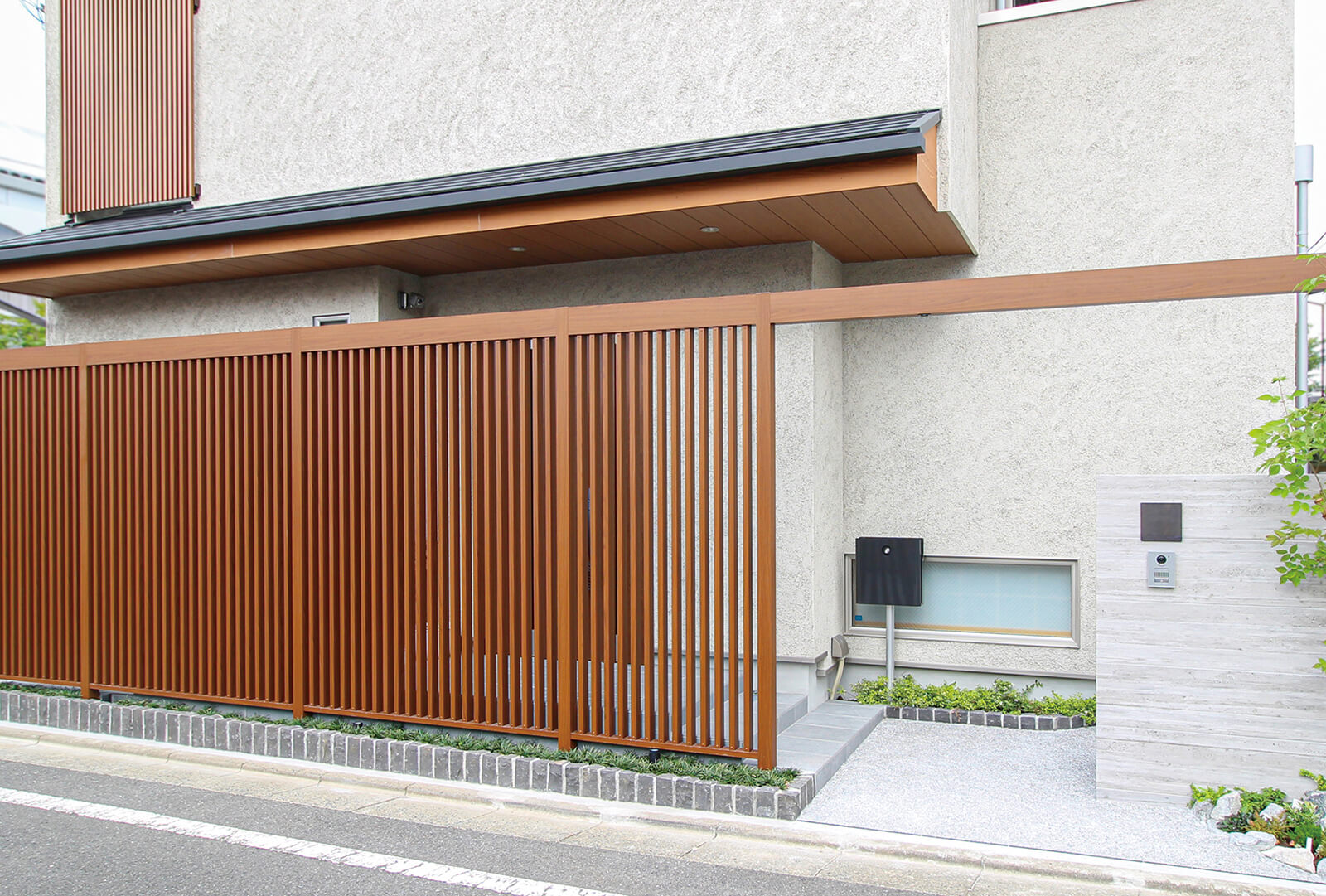 美しい木目柄のフレームが緑と白い建物にマッチした心地の良いエントランス。門構えとなる3つのフレームが連続することで立体感と奥行き感を創出し、アプローチを大きくみせることができます。敷地の境界部分には縦のラインが美しいスリットデザインを採用し、植栽と組み合わせることで程よく目かくしの役割を果たします。風通しも良く、爽やかなアプローチは訪れる人達を気持ちよくお出迎えし、良い印象を与えます。