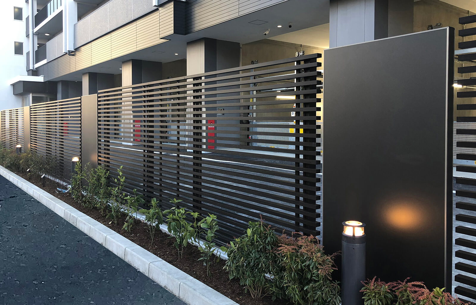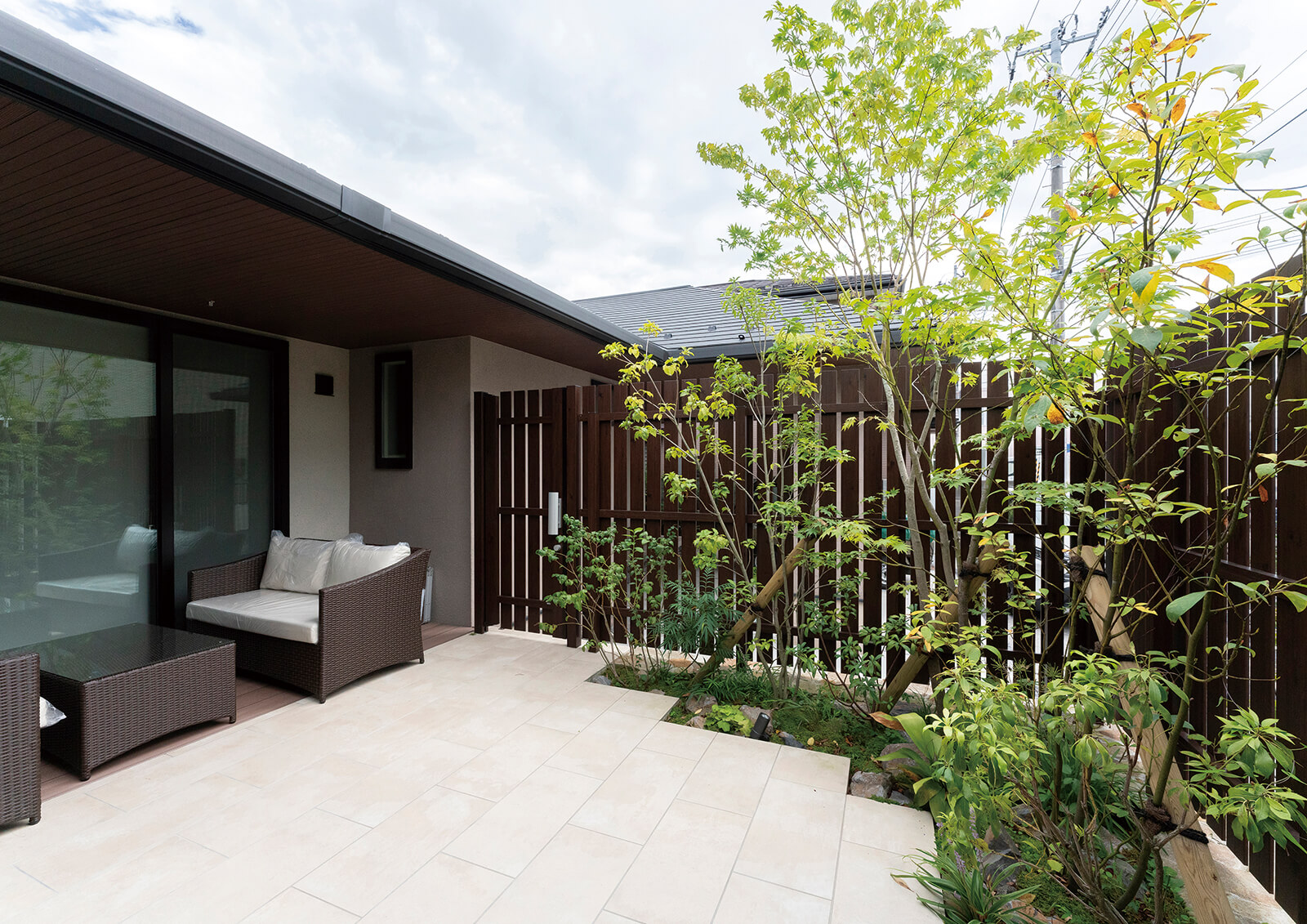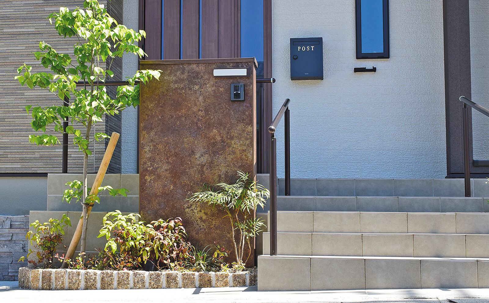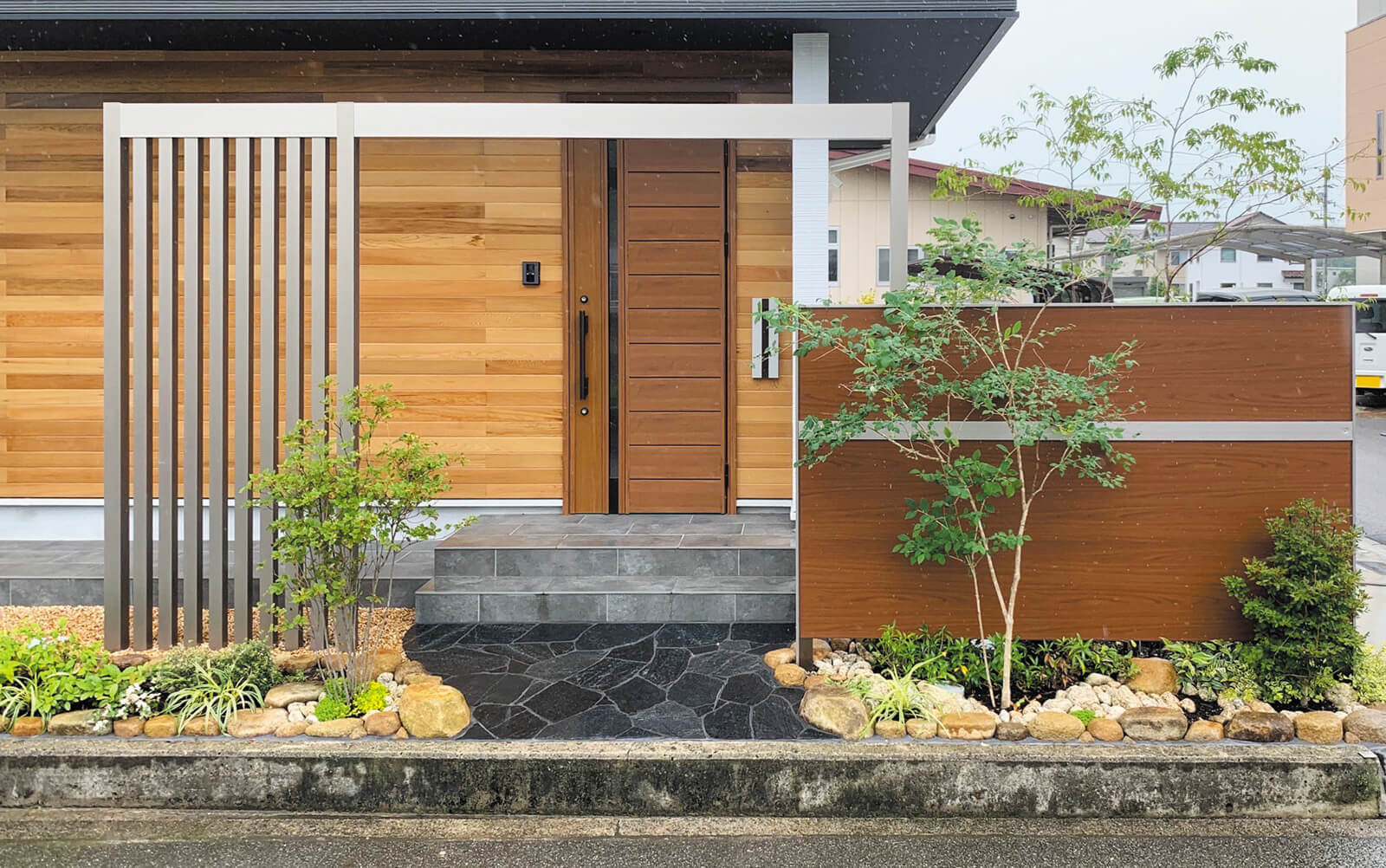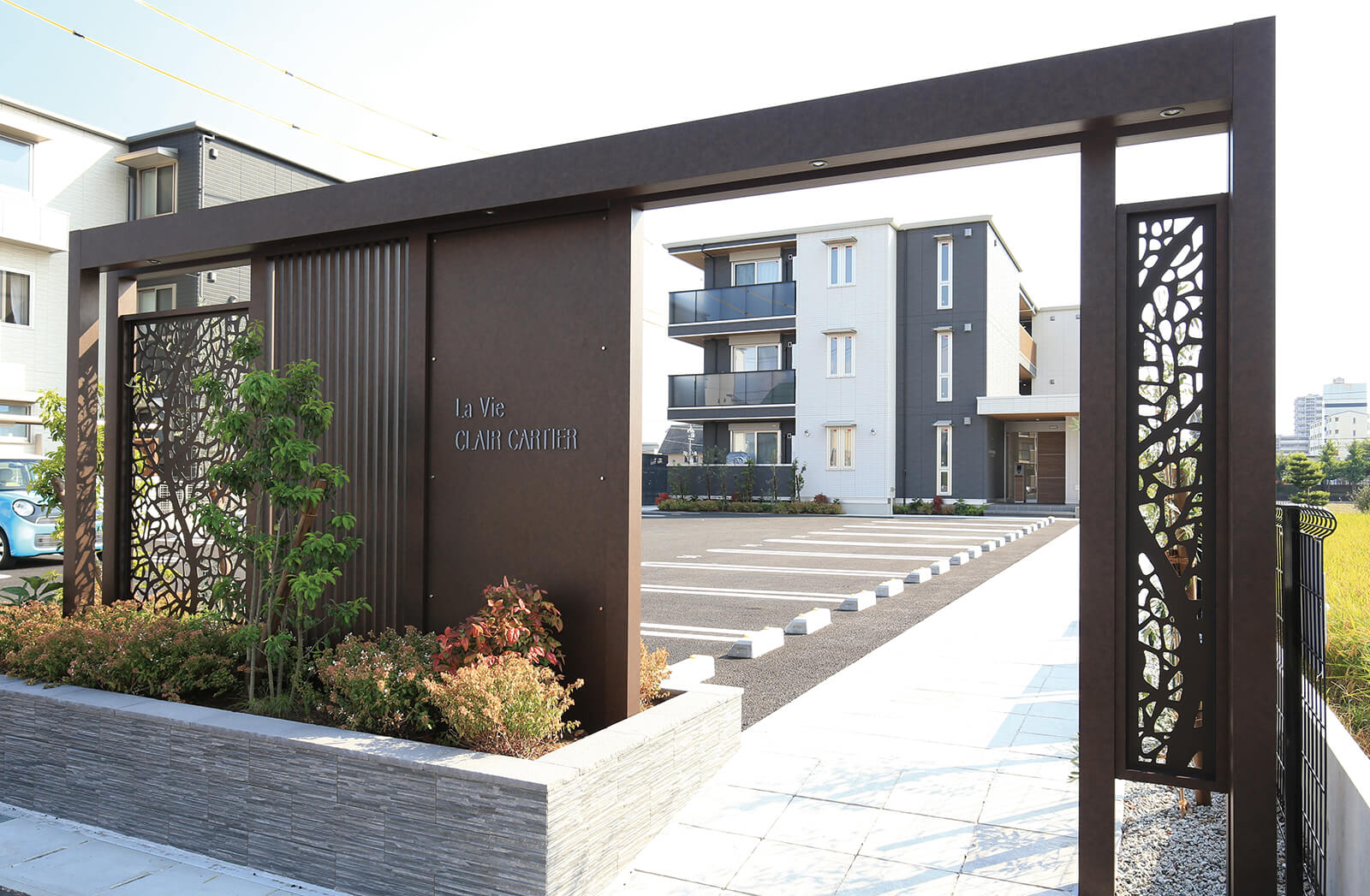 美しい木目柄のフレームが緑と白い建物にマッチした心地の良いエントランス。門構えとなる3つのフレームが連続することで立体感と奥行き感を創出し、アプローチを大きくみせることができます。敷地の境界部分には縦のラインが美しいスリットデザインを採用し、植栽と組み合わせることで程よく目かくしの役割を果たします。風通しも良く、爽やかなアプローチは訪れる人達を気持ちよくお出迎えし、良い印象を与えます。