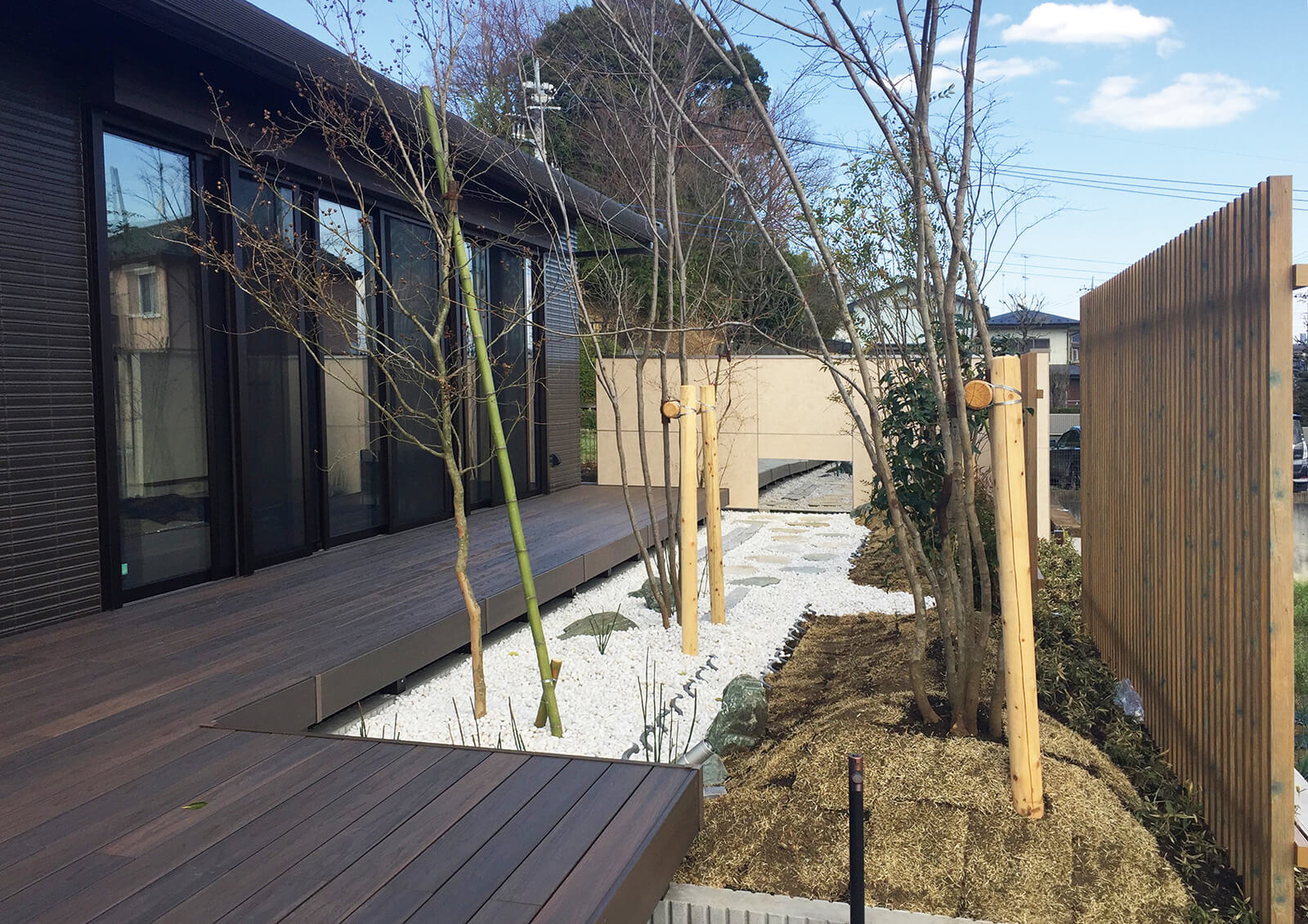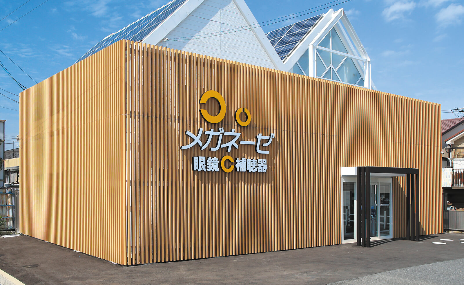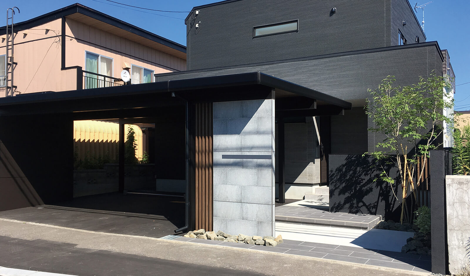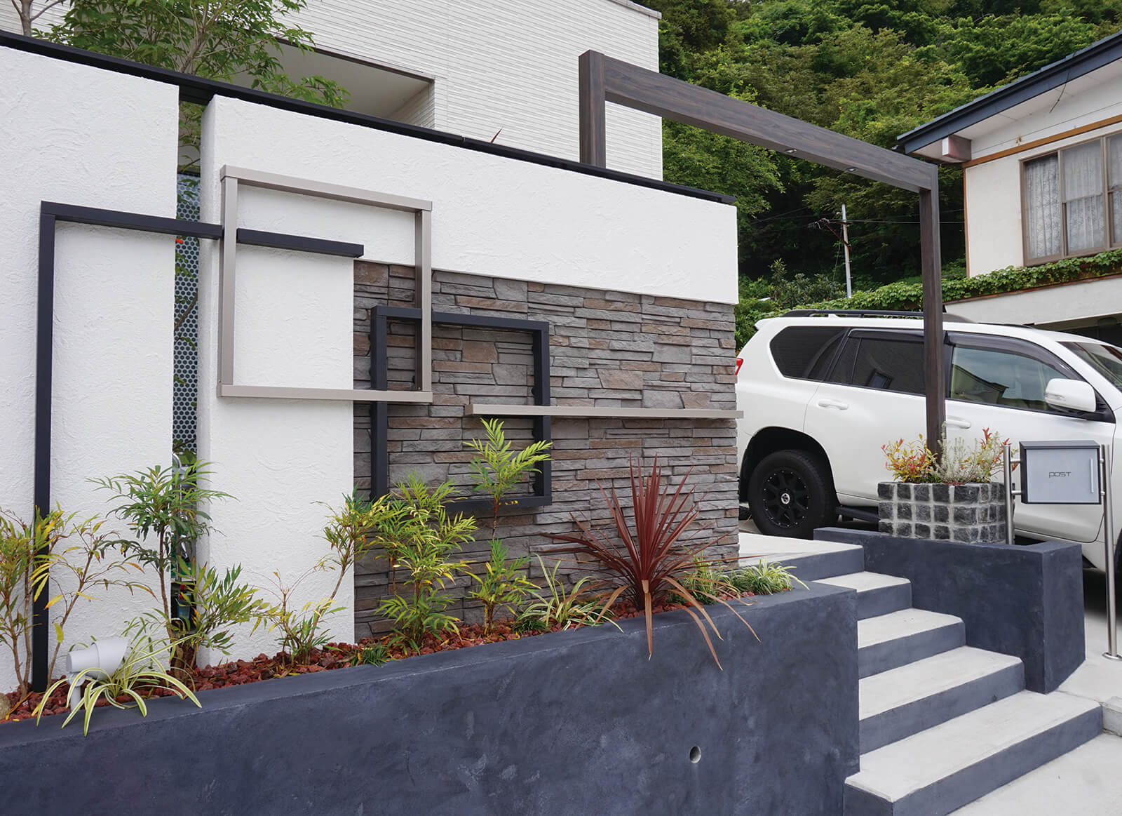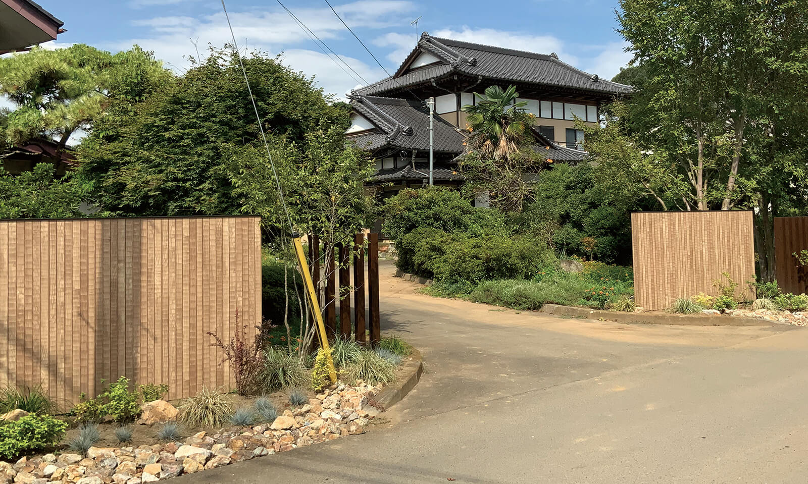 美しい木目柄のフレームが緑と白い建物にマッチした心地の良いエントランス。門構えとなる3つのフレームが連続することで立体感と奥行き感を創出し、アプローチを大きくみせることができます。敷地の境界部分には縦のラインが美しいスリットデザインを採用し、植栽と組み合わせることで程よく目かくしの役割を果たします。風通しも良く、爽やかなアプローチは訪れる人達を気持ちよくお出迎えし、良い印象を与えます。