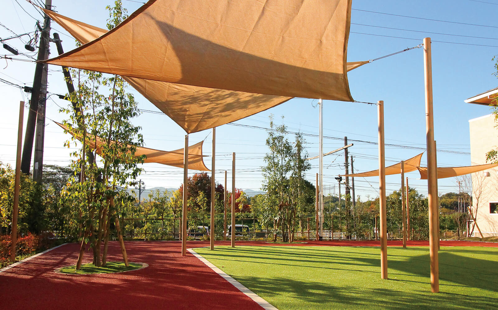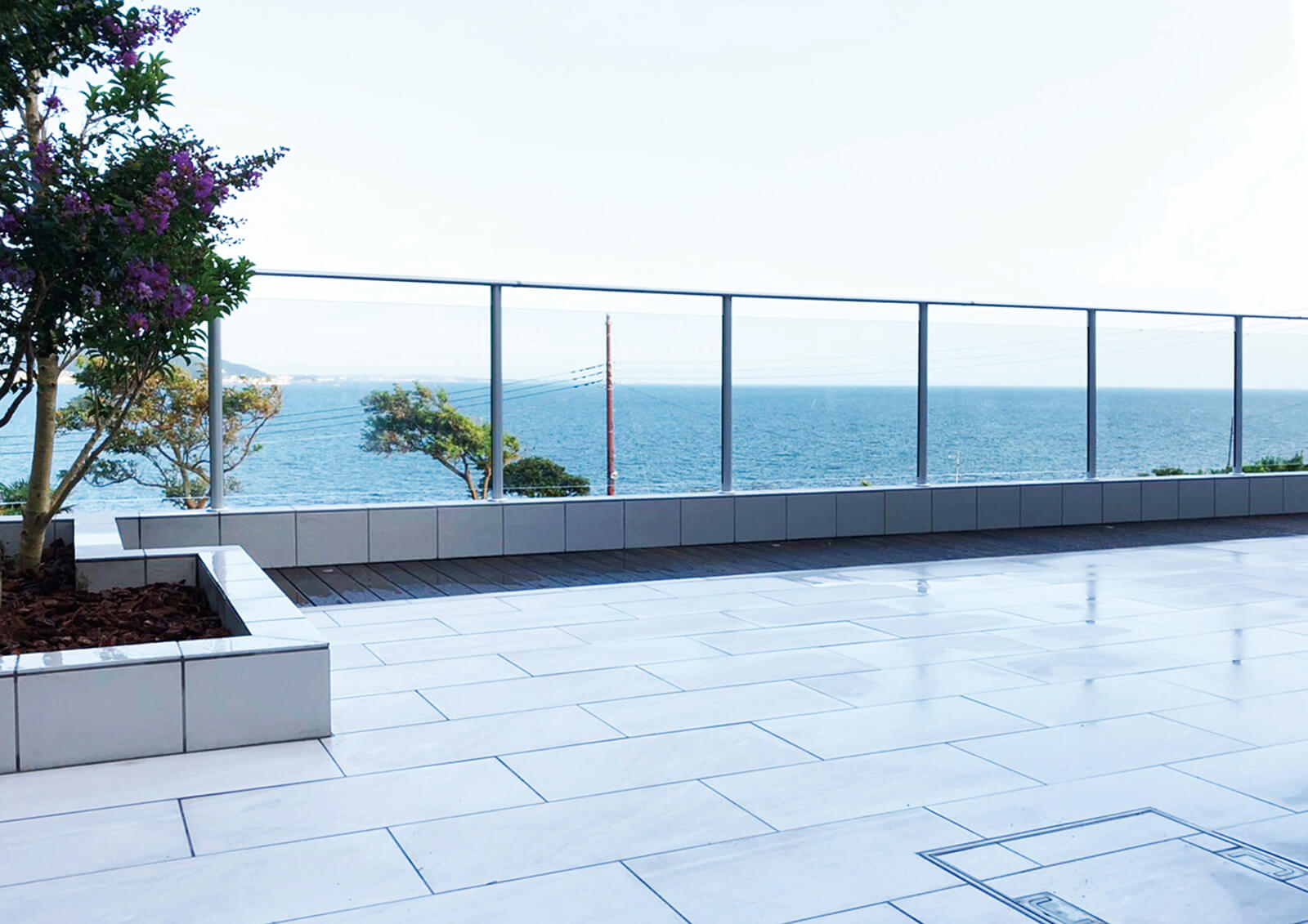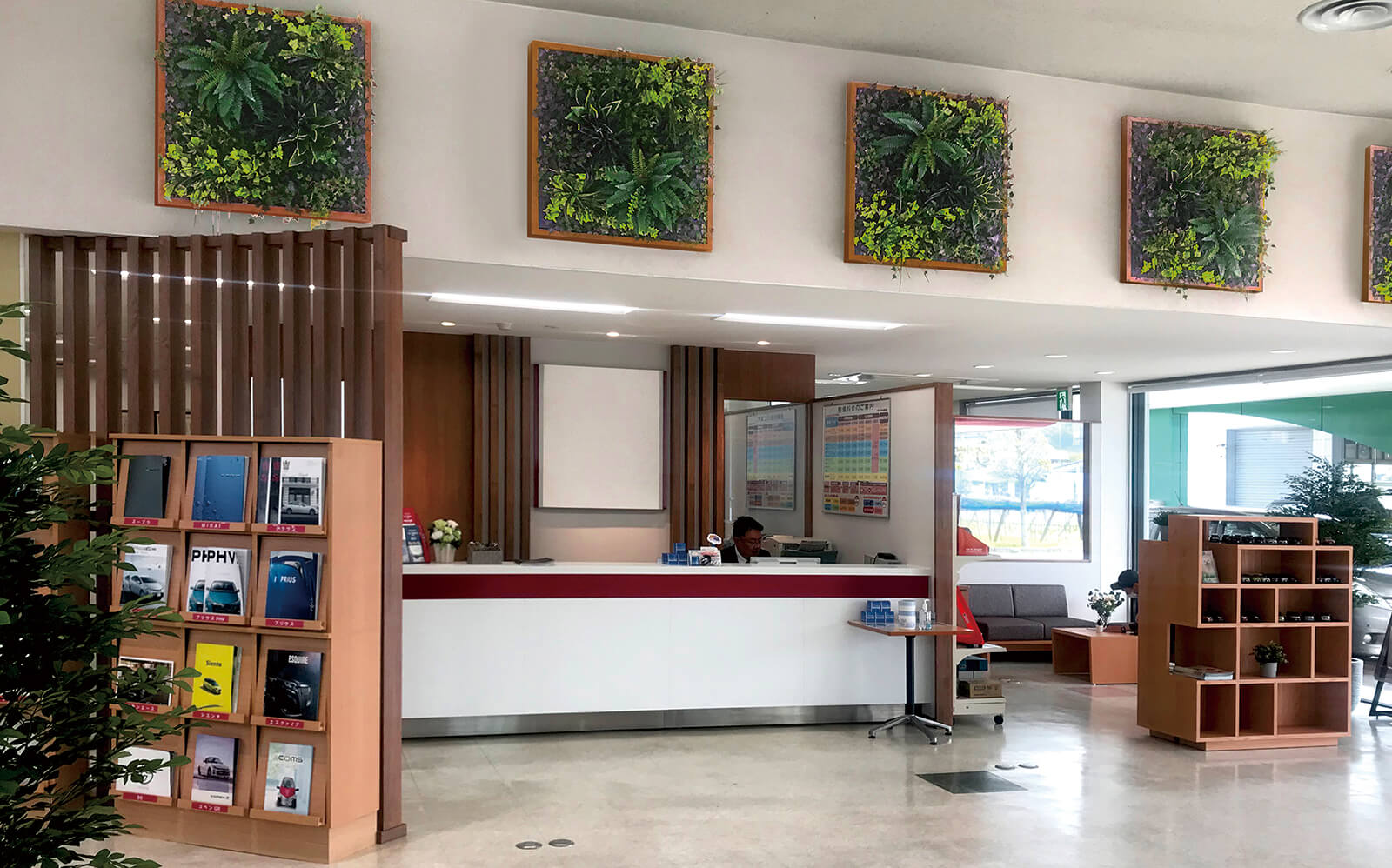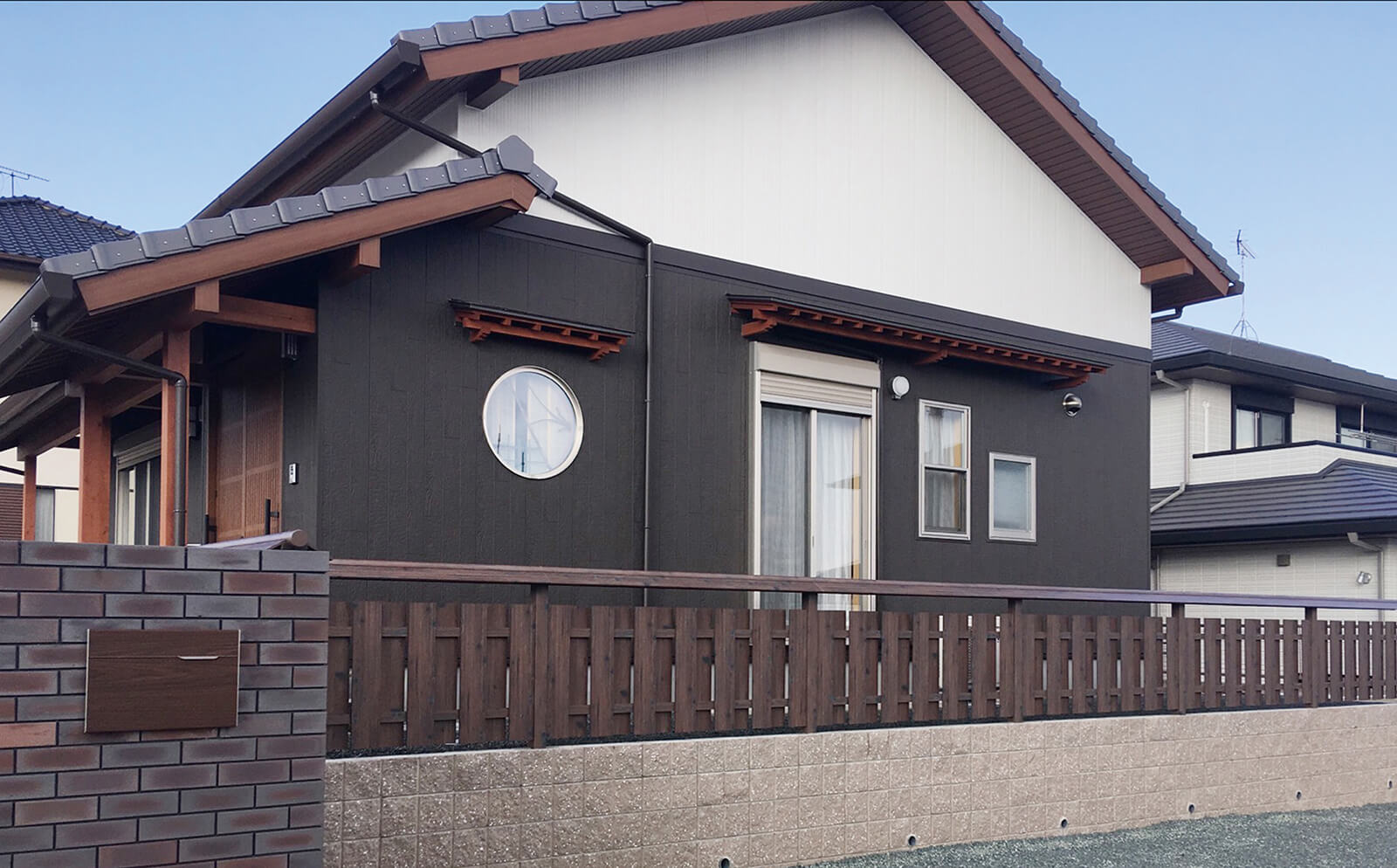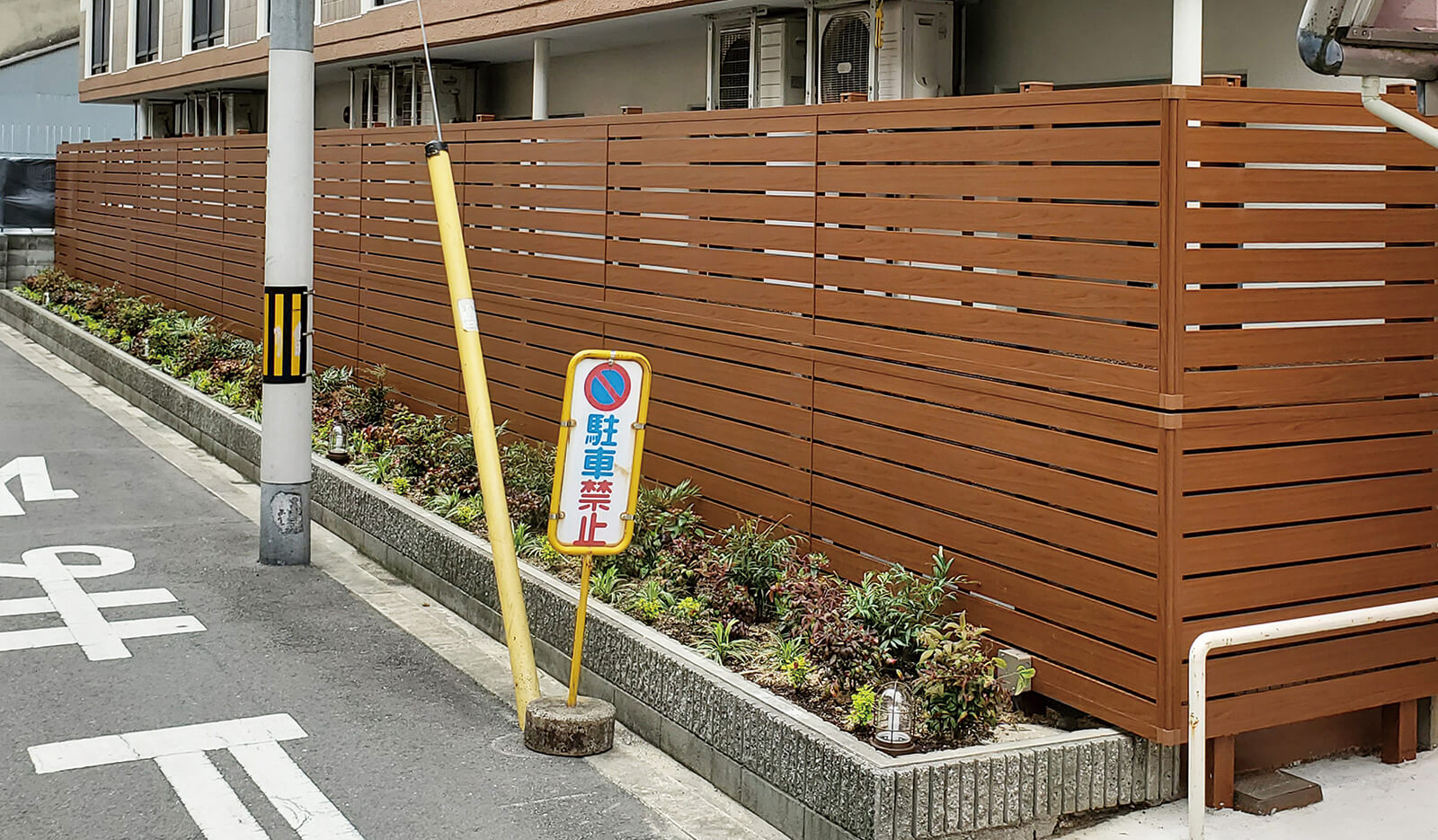 美しい木目柄のフレームが緑と白い建物にマッチした心地の良いエントランス。門構えとなる3つのフレームが連続することで立体感と奥行き感を創出し、アプローチを大きくみせることができます。敷地の境界部分には縦のラインが美しいスリットデザインを採用し、植栽と組み合わせることで程よく目かくしの役割を果たします。風通しも良く、爽やかなアプローチは訪れる人達を気持ちよくお出迎えし、良い印象を与えます。