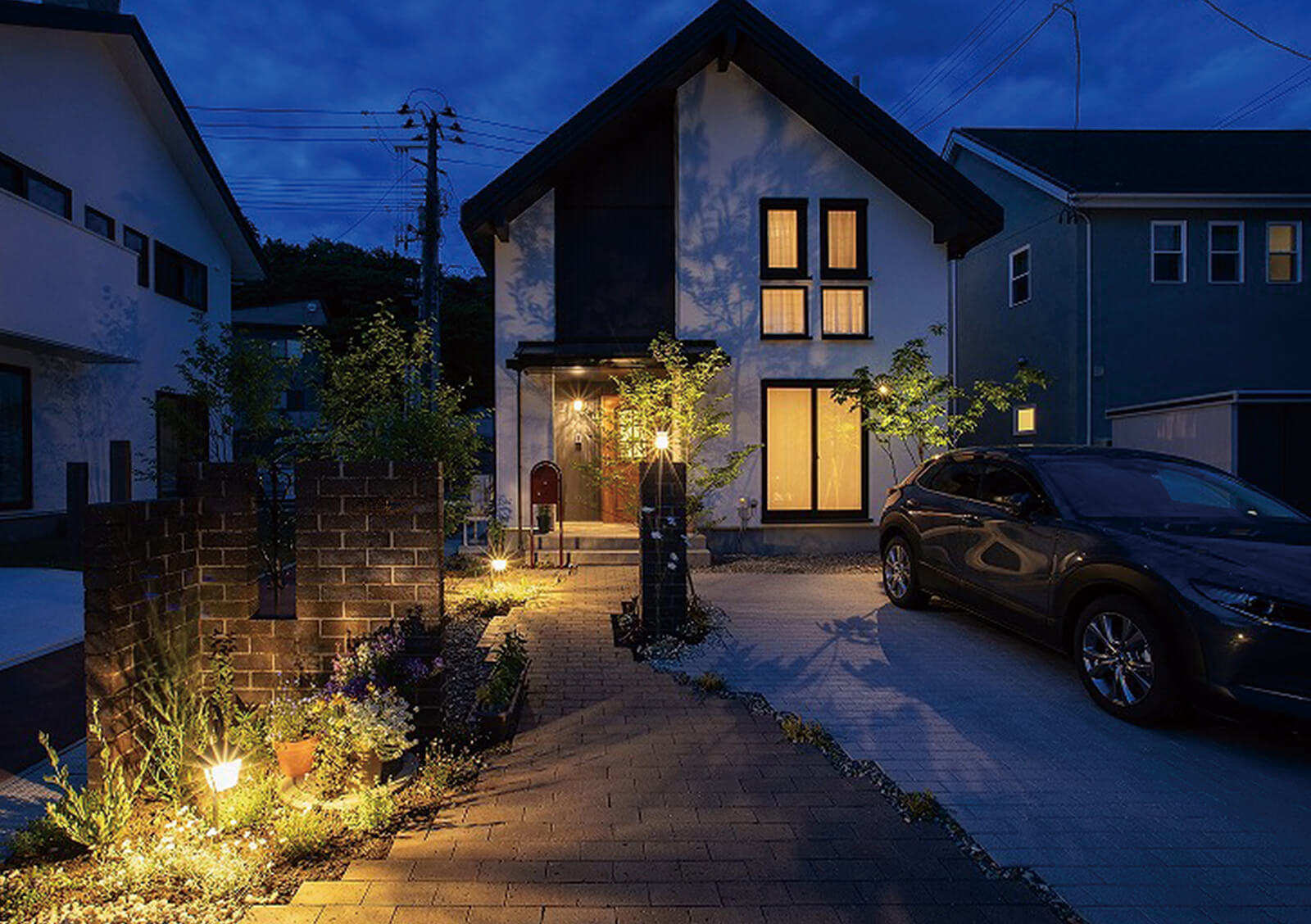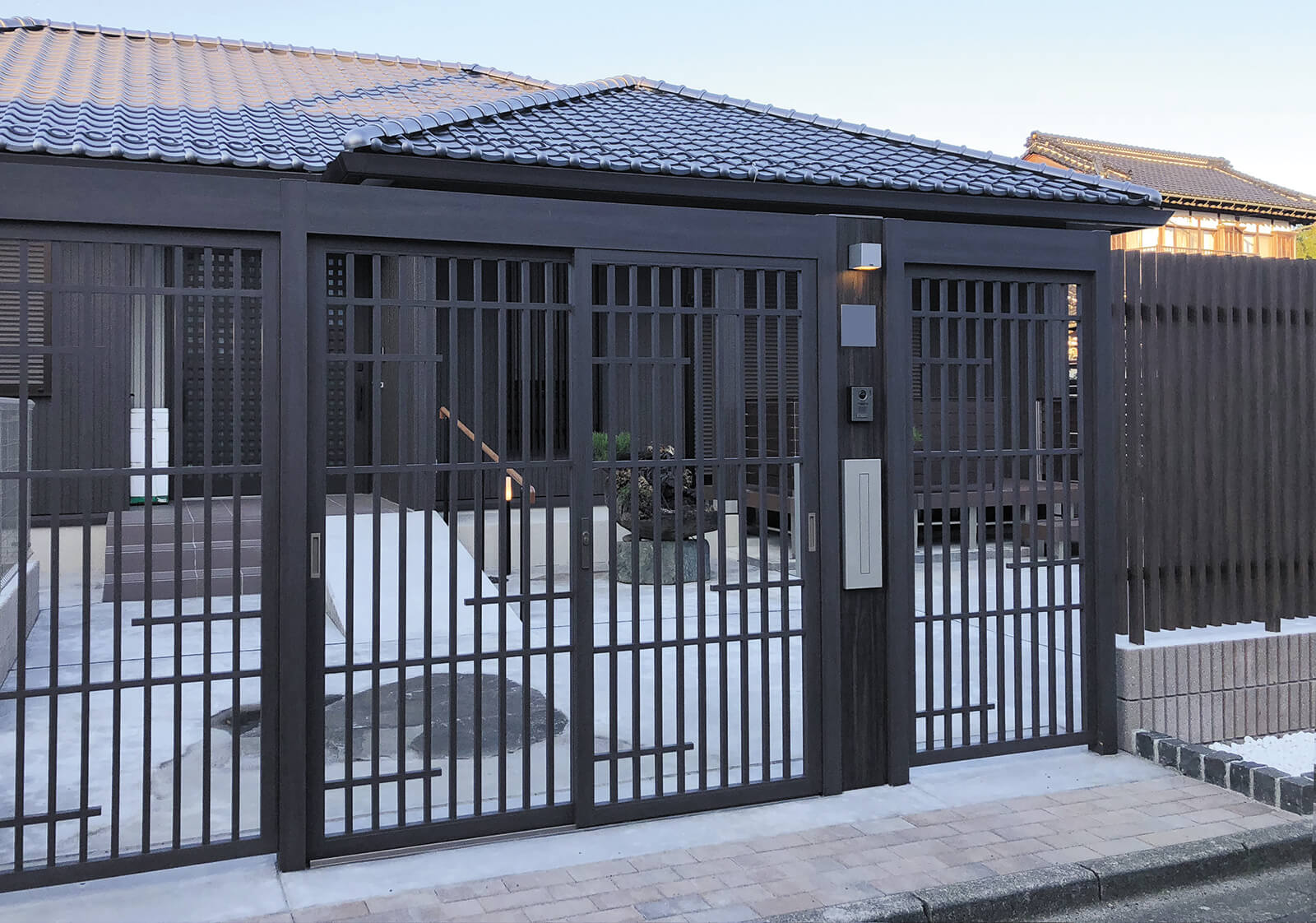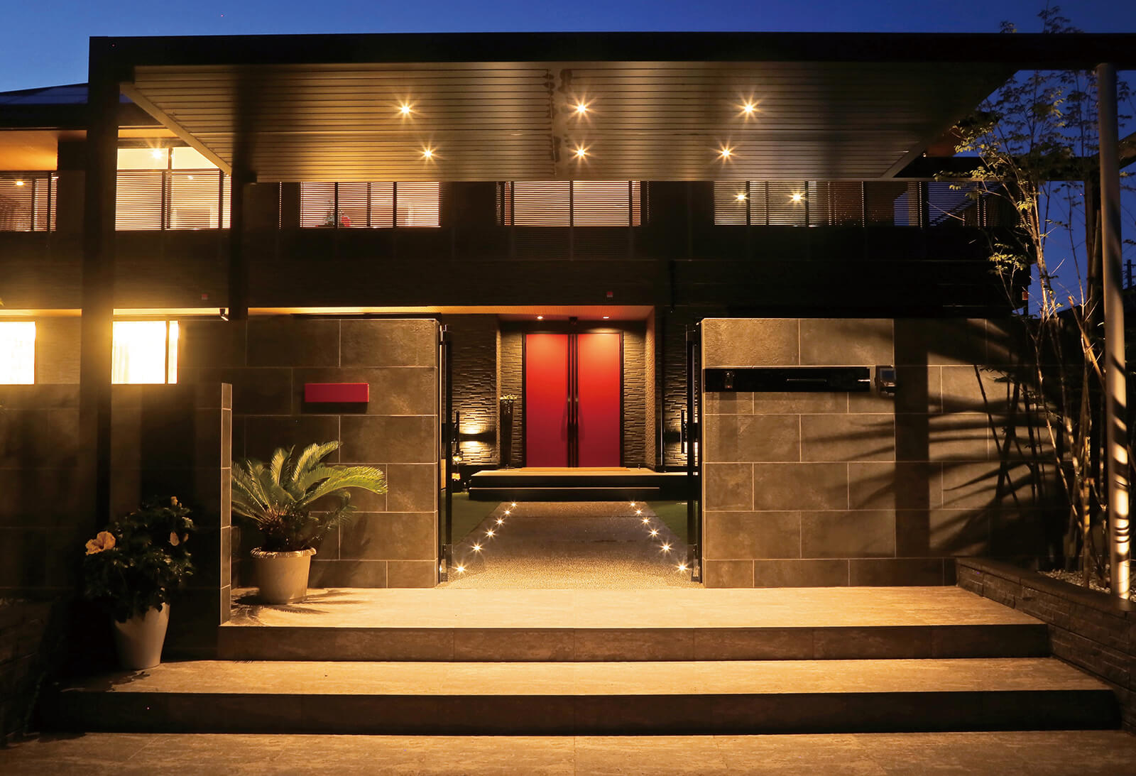 家の外観と調和したカラーを使用し、全体的に落ち着きのあるまとまったアプローチとなっていますが、クロスしたフレームデザインが見る人にインパクトを与えます。エバースクリーンによるスリット状の目かくしが程よく外部からの視線を遮り、室内での暮らしをより快適に。フレームに埋め込まれたライト(ライティングフェイス)により、夜はさらにダイナミックで美しい光のファサードとなりました。美観、防犯、安全性などお家の顔として必要な機能を兼ね備えながら、昼と夜でガラッと表情が変わるオリジナリティ溢れるエントランスとなりました。