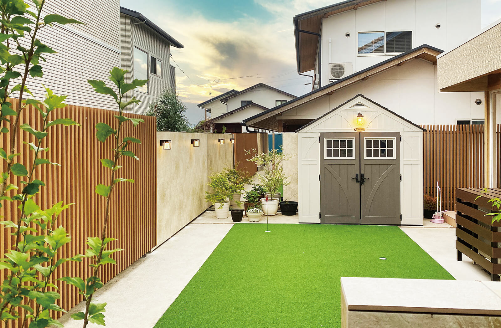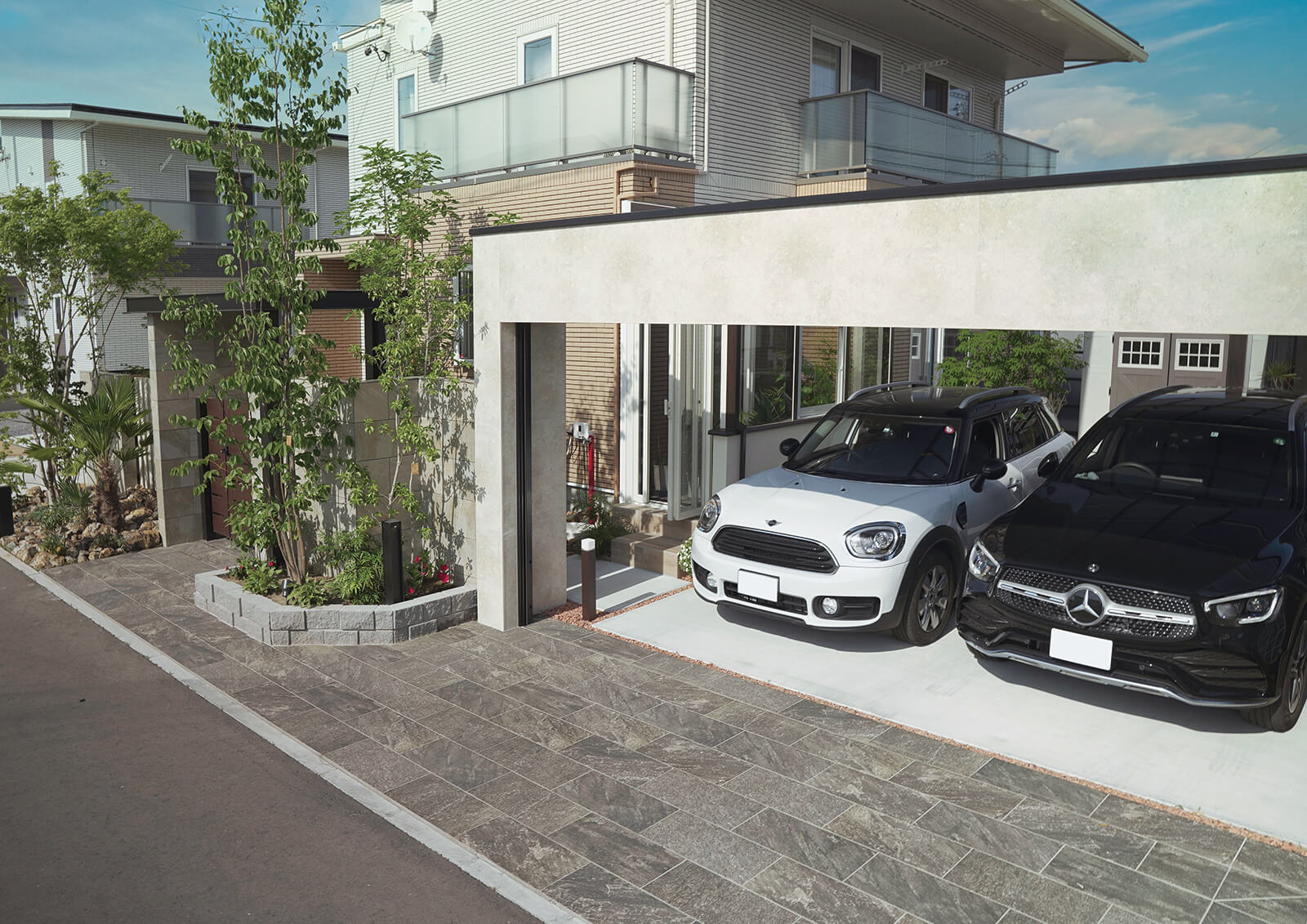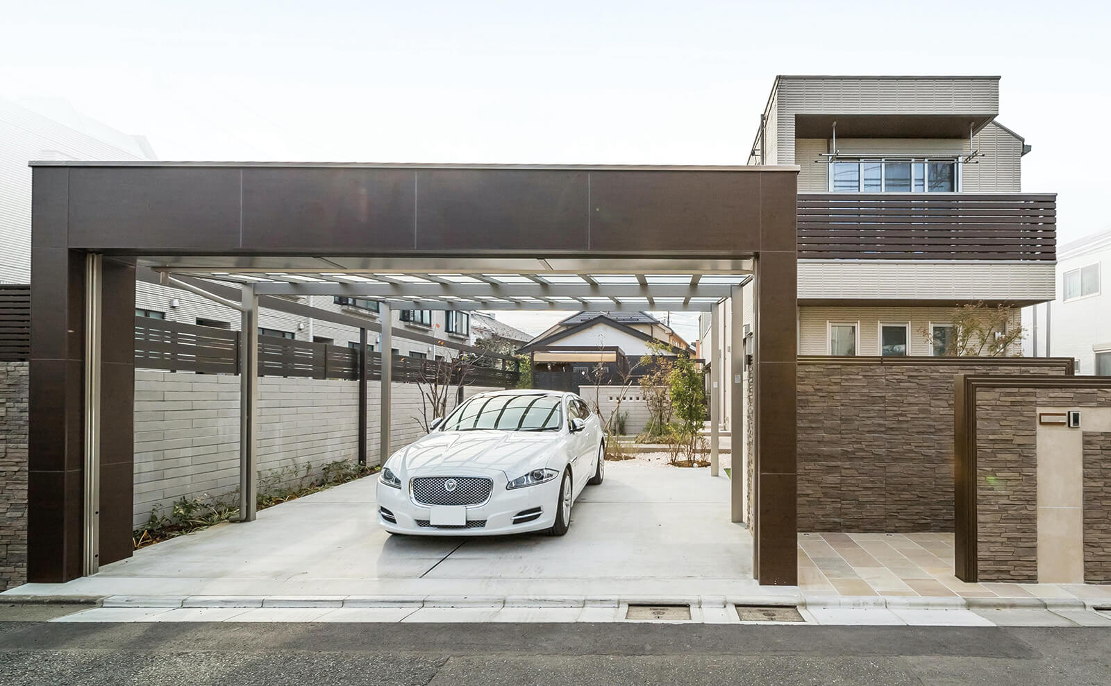 ファサードや建物のデザインともバランスの取れたカーヤード。重厚感のある黒色のフレームに、内側を赤褐色が美しい木目調のエバーアートボードにすることで上質で温かみも感じられる車庫まわりに。後部に可動ルーバーフェンスを取付けることで、庫内が明るく、風通しも良い空間となっています。すっきり納まる埋め込み型のミニフラットライトで、夜の景観もスタイリッシュに魅せることができます。内天井に施されたライトが、まるでショーケースのように美しく車をディスプレイ。主張しすぎないシックなカーヤードに仕上がりました。