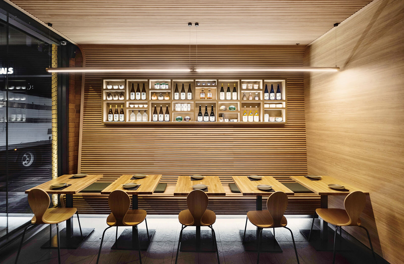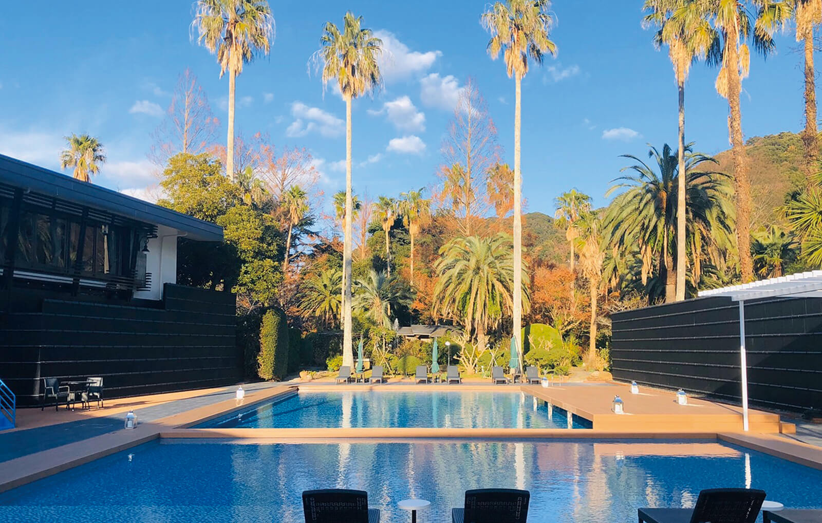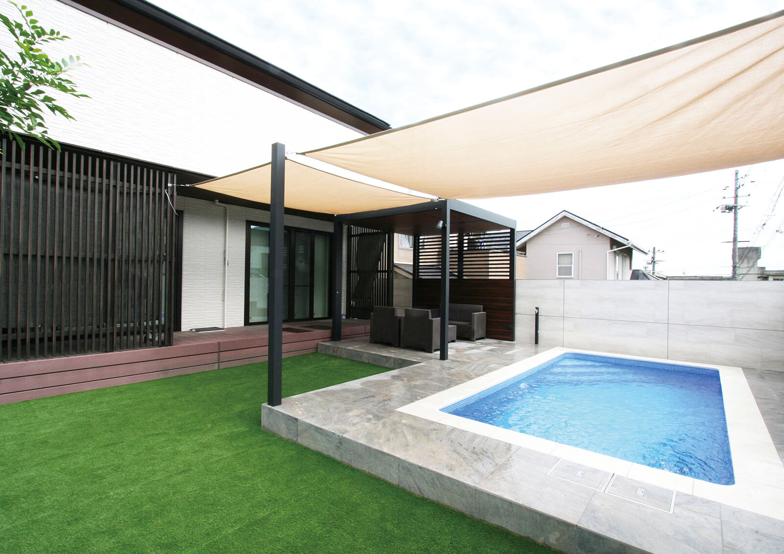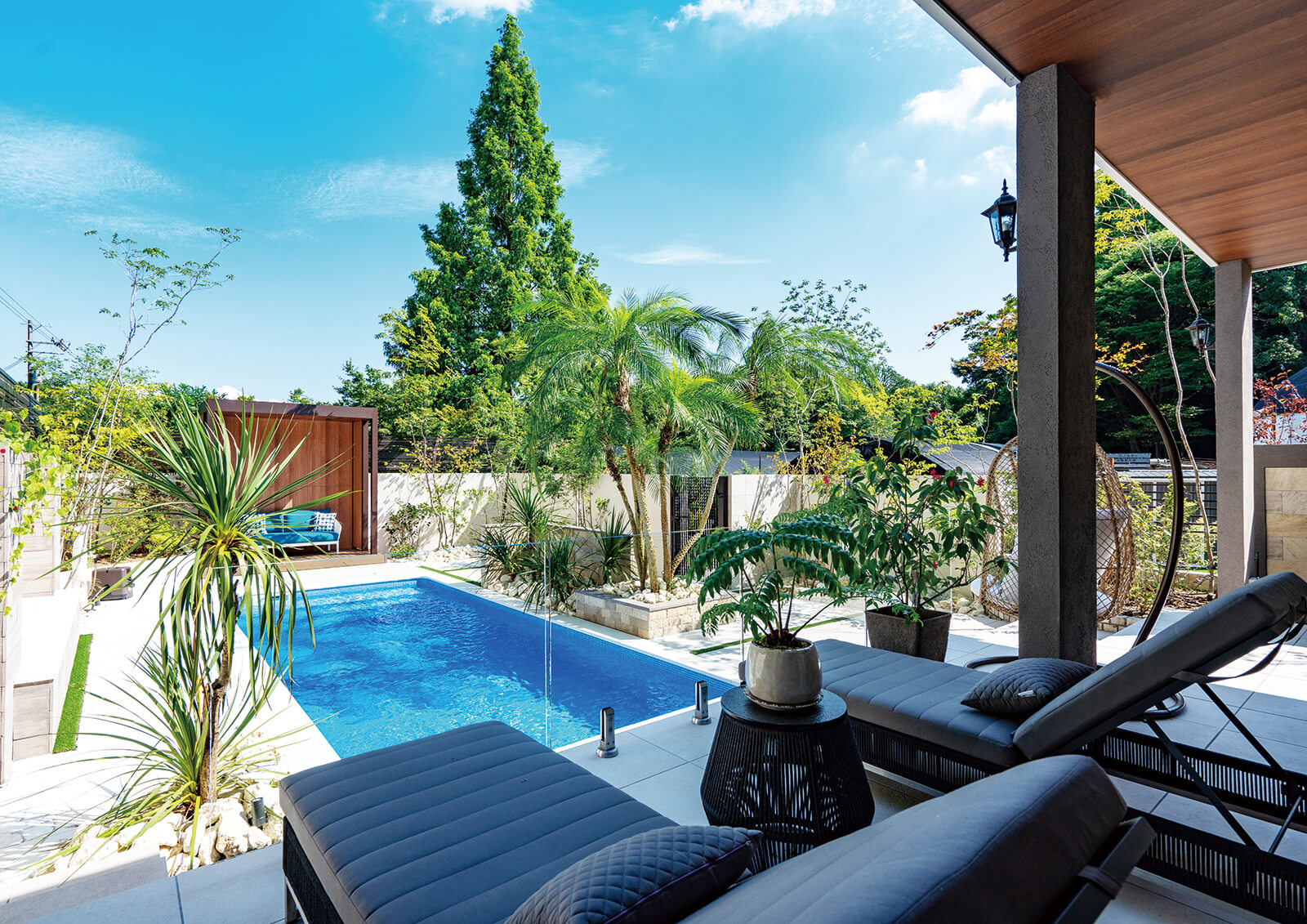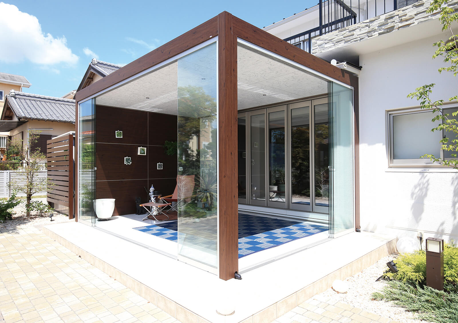 ホームヤードルーフの内天井を見上げると、太陽の光を取込むスリットデザインと、四角形の白いパネルモチーフが他にはない空間のアクセントとして存在感を放ちます。内天井のカラーはくり柾目を使用することで安心感や落ち着きをもたらす優しい雰囲気に。フレームはマットブラックで空間全体を引き締めます。独自の天井デザインと植栽を程よく取り入れることで圧迫感を感じさせない広々とした空間を演出。素材感の違うファニチャーや柄をうまく取り入れることで遊び心もあり、楽しいひとときを過ごせる作品となりました。
