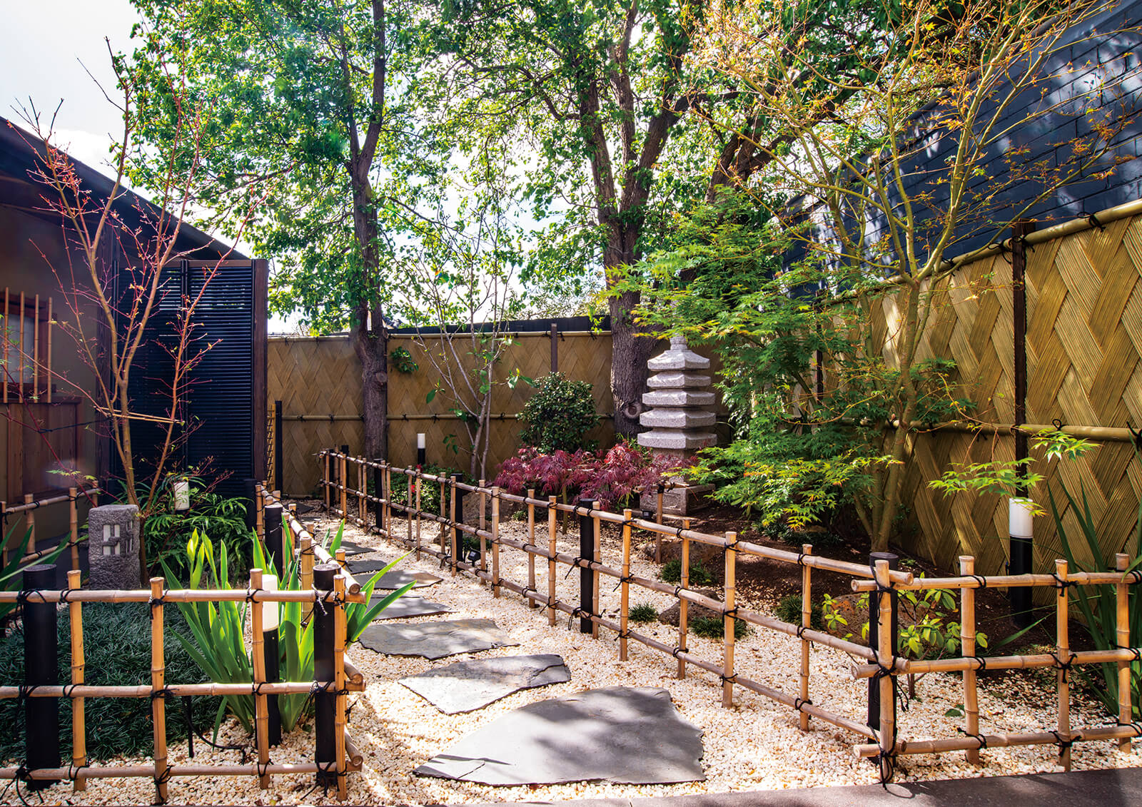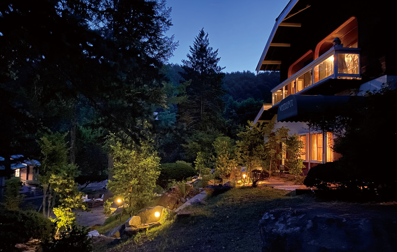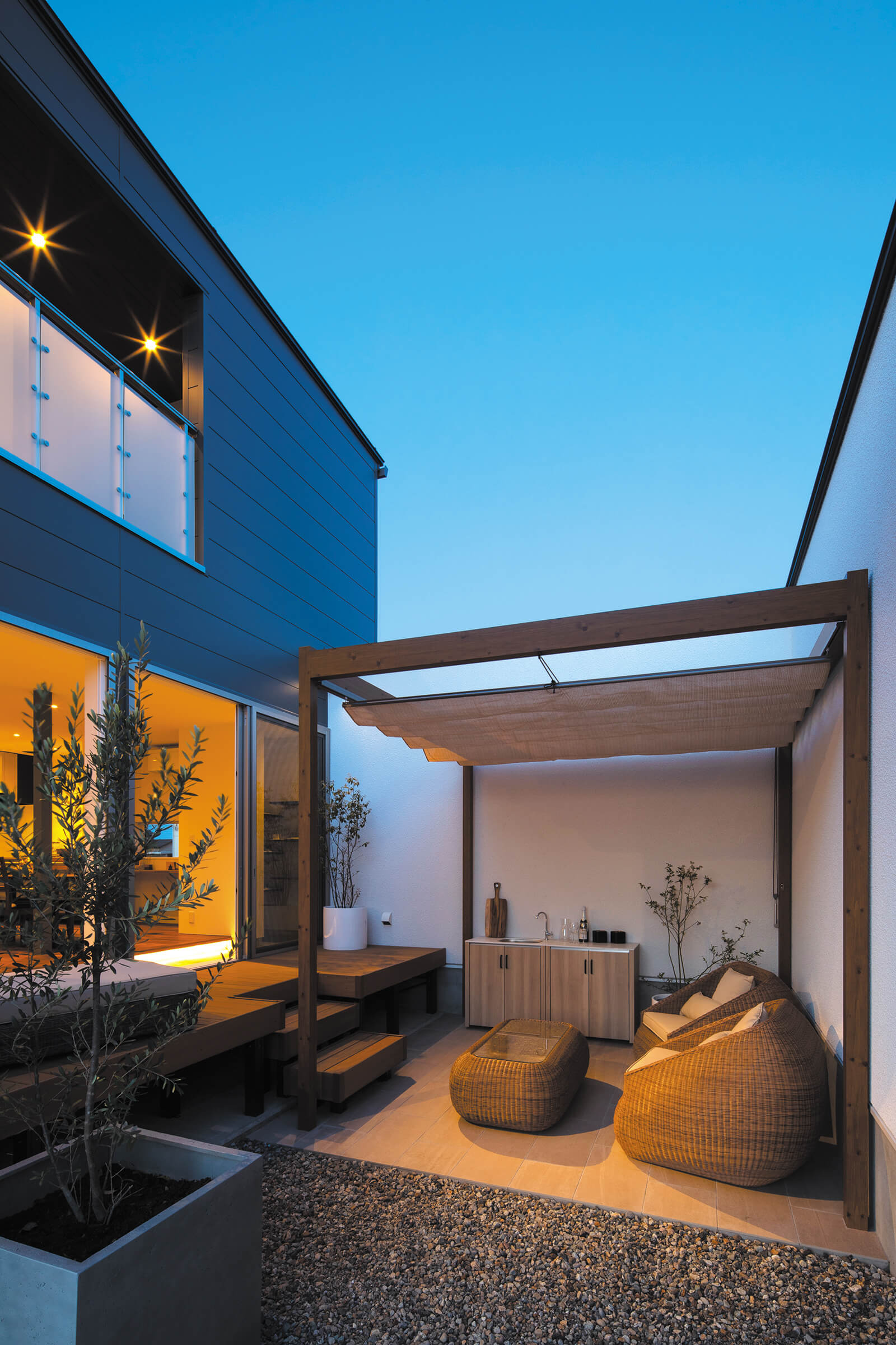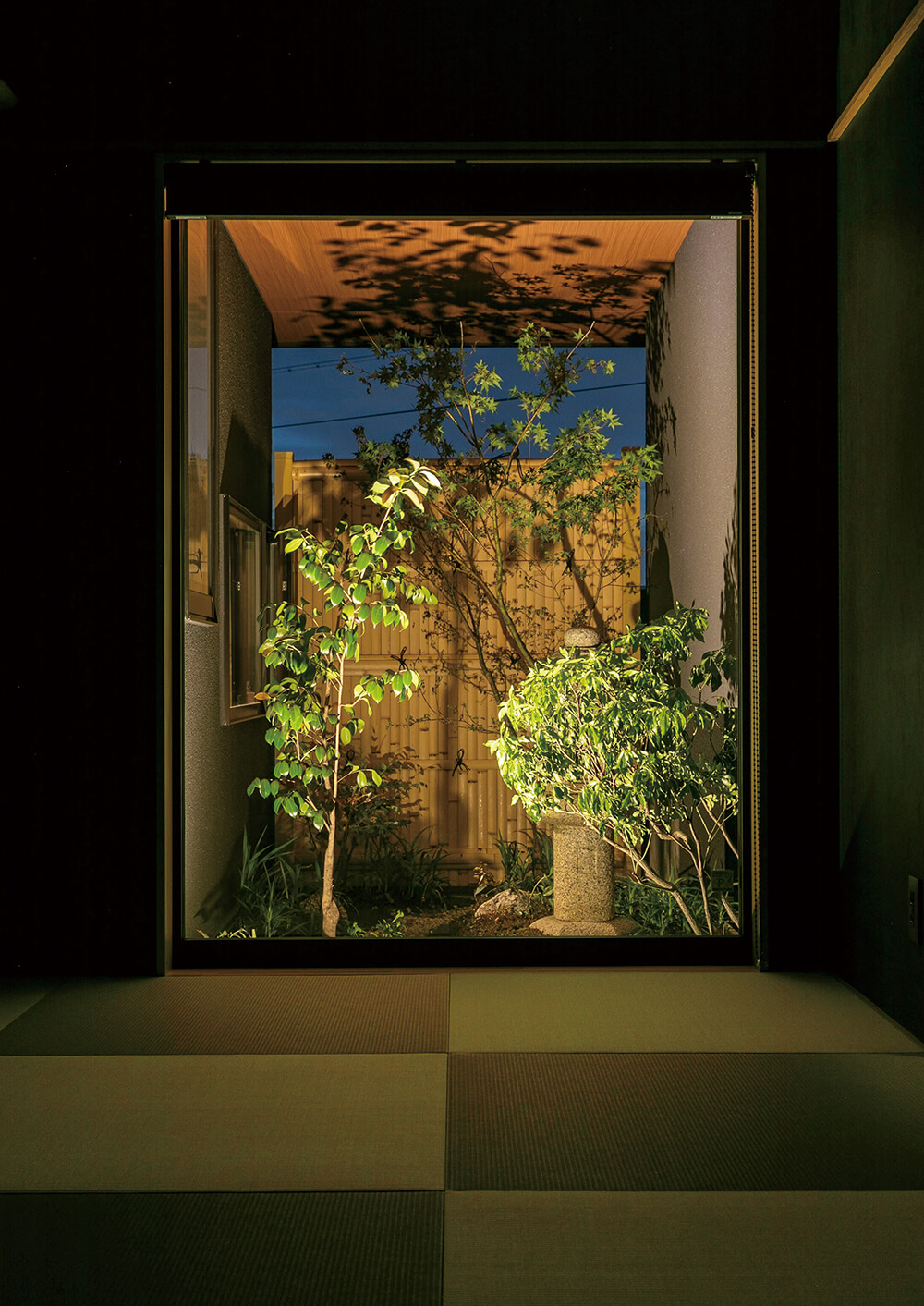 大きな中庭にホームヤードルーフシステムのルーフ空間が広がる「もう一つの部屋」。天井部の光を取り込むすき間デザインと他にはないパネルのモチーフが意匠性を高めています。ローボルトレールペンダントライトを高さ違いで設置することでリズミカルな印象を与えつつ、しっとり落ち着きのある光が上質な空間を演出。カジュアルとフォーマルの中間のバランスをとった居心地の良いアウトドアリビングが誕生しました。竹の庭にはDe-SPOTスプレッドライトの緑色の光で、竹の色味をより鮮やかに照らし、癒しの時間を提供します。室内のどの部屋からの眺めも美しく、住まい全体の価値を高めるお庭は日常をプレミアムにしてくれる空間となりました。