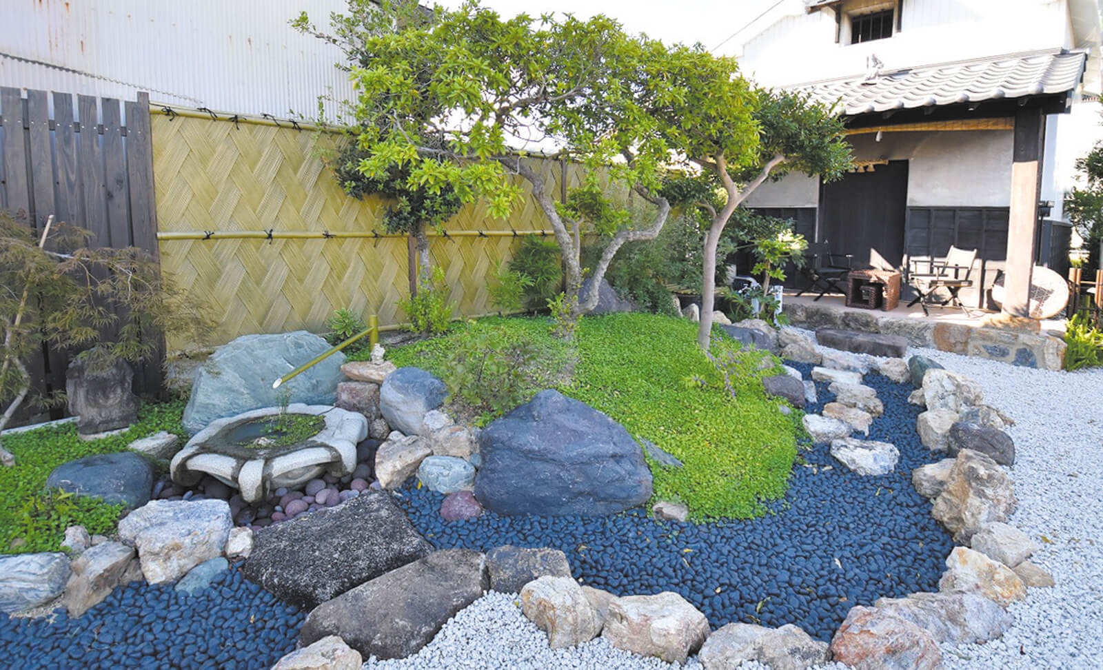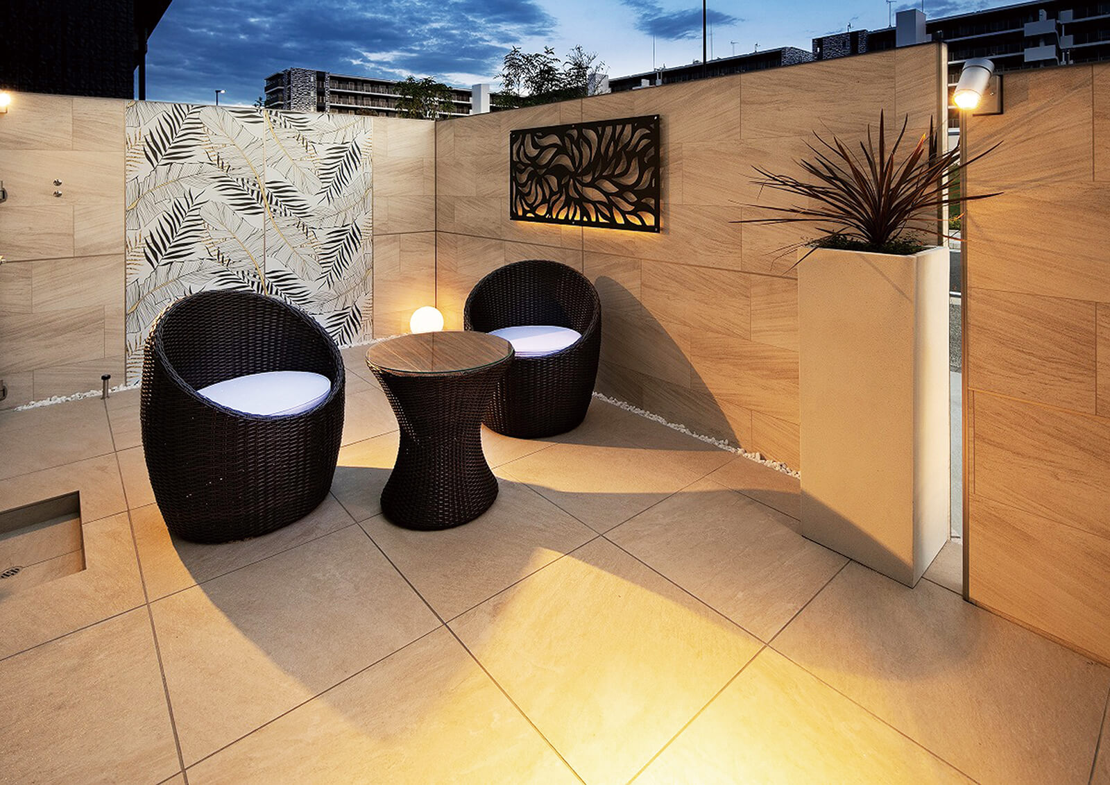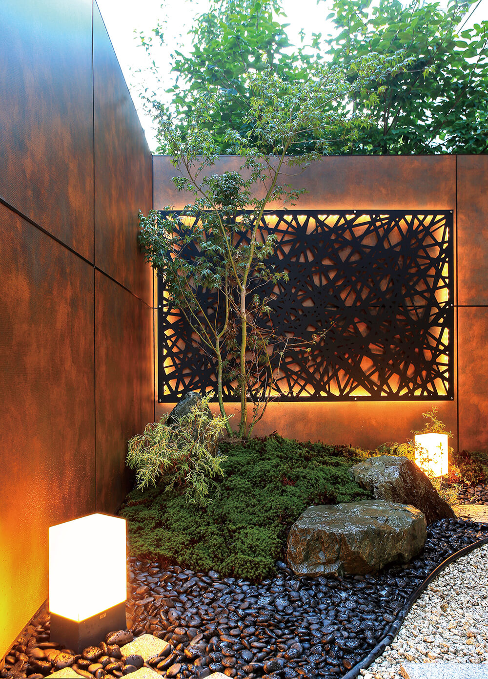 エバーアートボードで囲われたお庭は日常の喧騒を忘れさせてくれる、心落ち着く空間に。壁面に等間隔でライトアップをすることで、光のラインが浮かび上がり、モダンで幻想的な空間を表現できます。深みのあるメタルなブラウンカラーと植栽の自然のグリーンの対照的な素材の組み合わせが相まって、コントラストの美しさが際立つお庭となっています。構成はシンプルながらも植栽と石材が引き立つ風情のある雰囲気は見る人の心を惹きつけます。