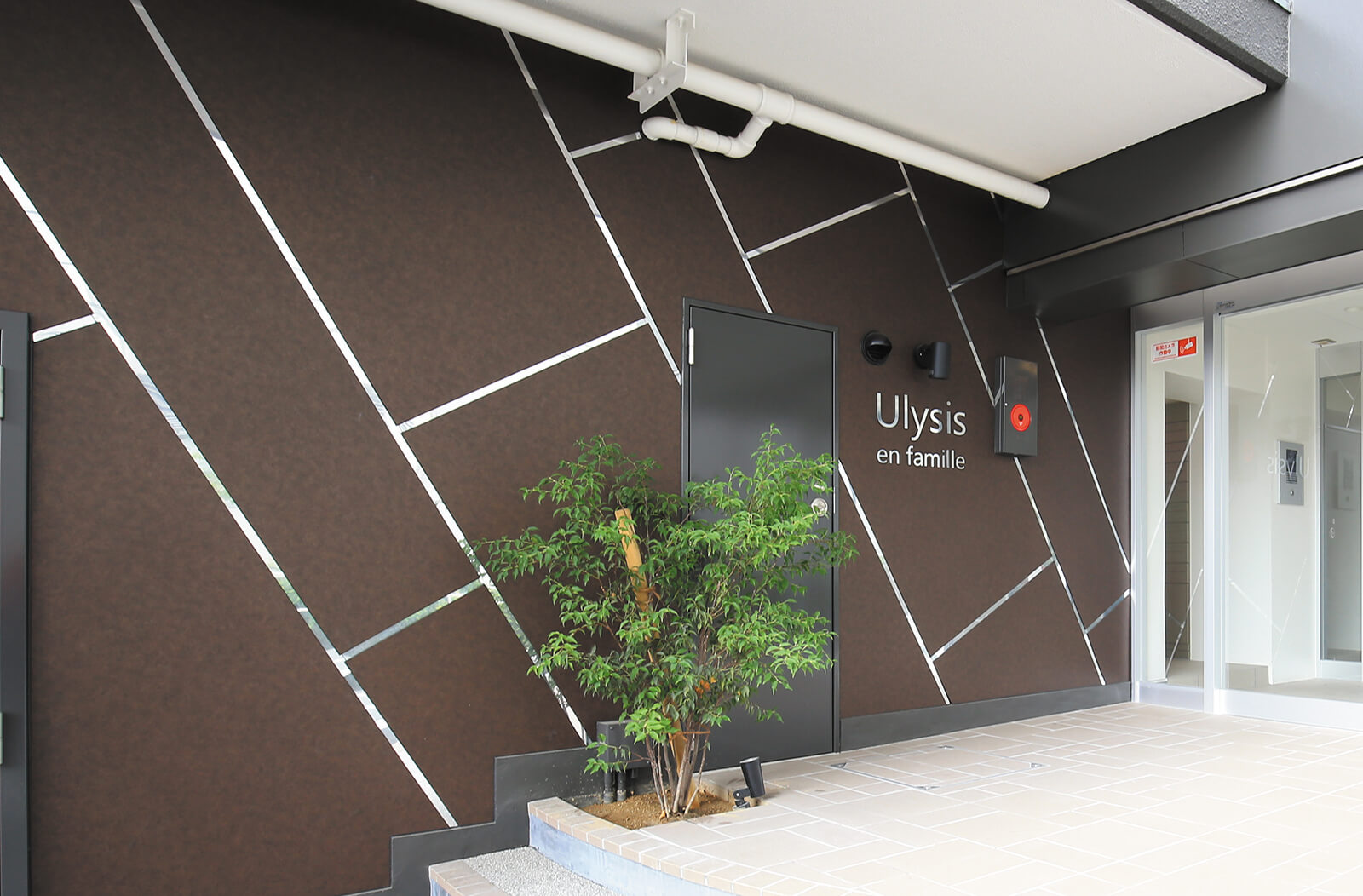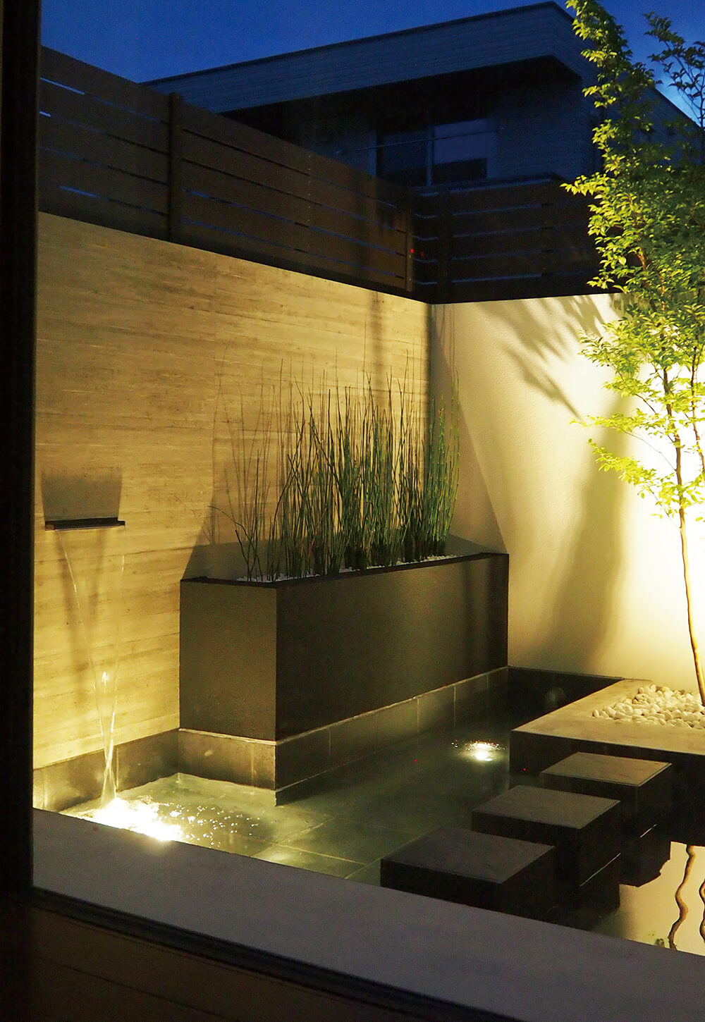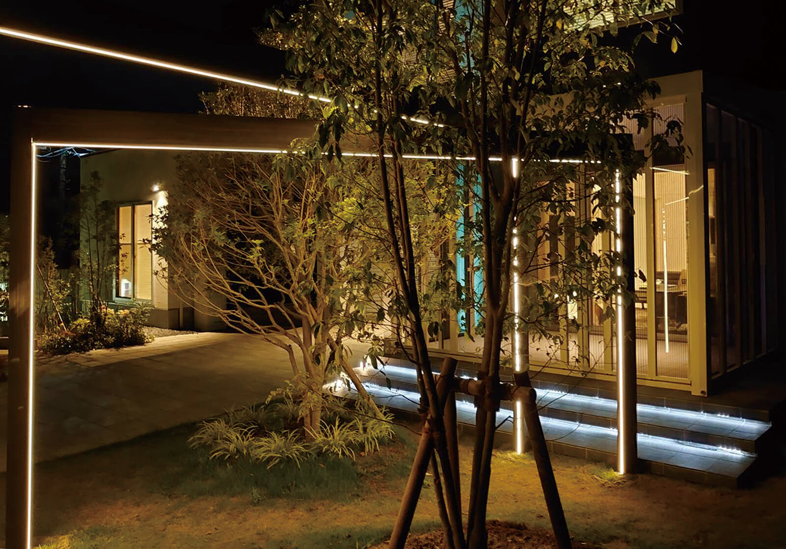 階段蹴込み部分に設置されたシャープな光のラインが、入居者や訪問者を建物の中へ導いてくれます。大きなシンボルツリーはガーデンアップライトで照らし上げることで、夜の植栽を美しく彩り、外構の主役となる存在感を放ちます。また植栽の影が建物に投影された「シャドーライティング」は夜にしか見ることができないアートなデザイン。景観として美しいのはもちろん、帰宅を温かく迎えるアプローチに仕上がりました。