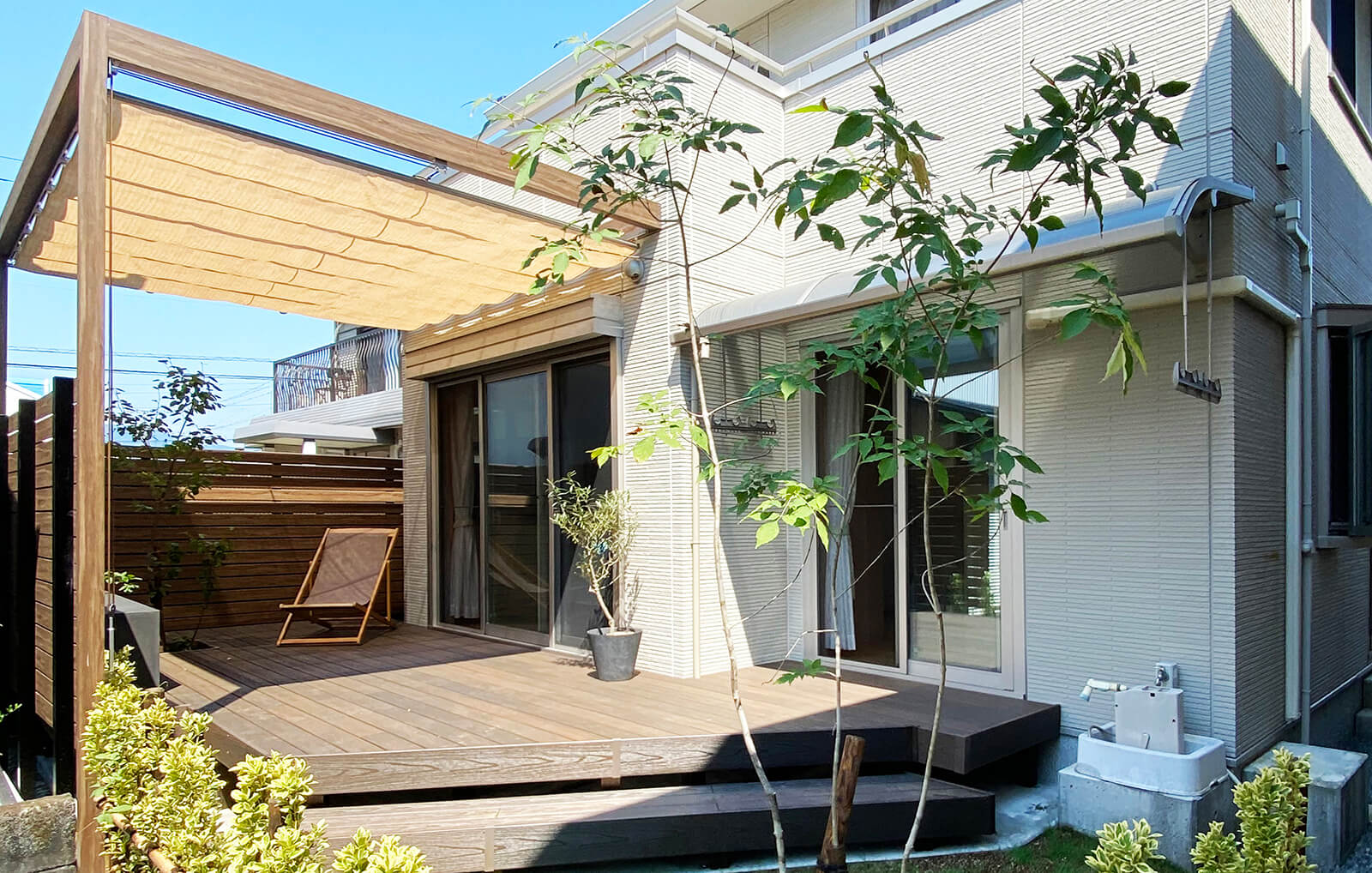 リフォーム前は過ごせるお庭として活用されていませんでしたが、ウッドデッキを設置することで家と庭、そして家族を繋げるお庭に生まれ変わりました。天然木素材のウッドデッキ「タンモクアッシュ」は木のぬくもりと高級感のある美しい表情が特徴。多種多様な植物の間をウッドデッキで歩けるようにすることで、自然を肌で感じ、心安らぐ時間を日常に取り入れられます。夜はラタンスタンドライトの優しい光と植栽のライトアップが和の風情を醸し出します。ウッドデッキで住まいのスペースを広げ、ガーデンセラピーを体感できるお庭が生まれました。