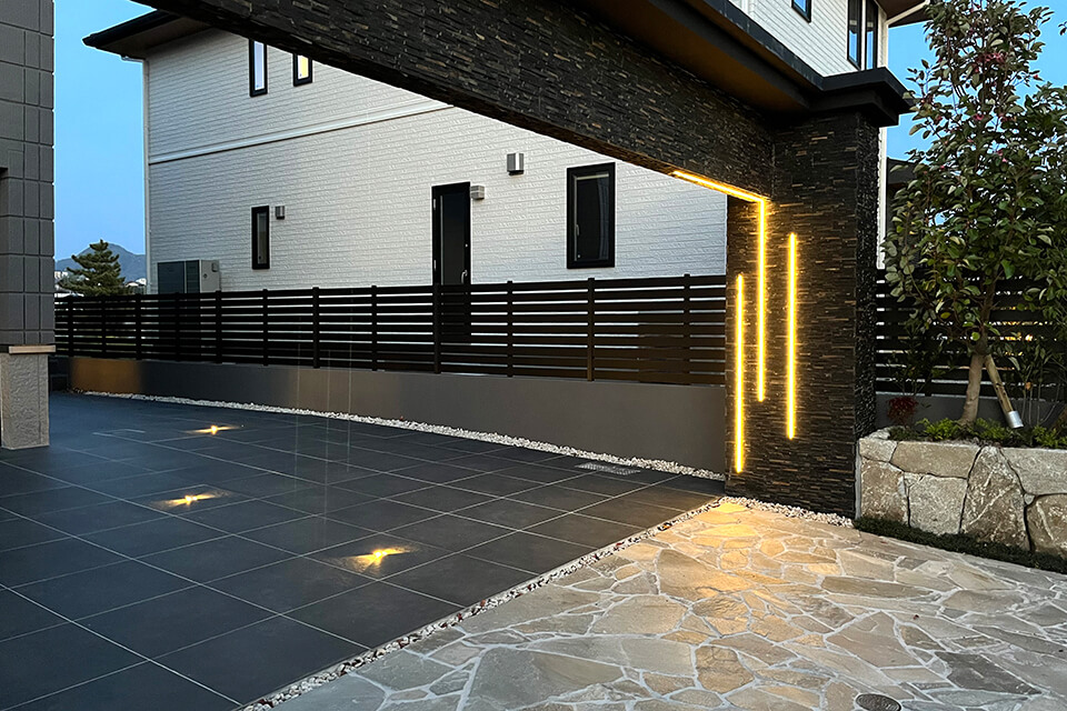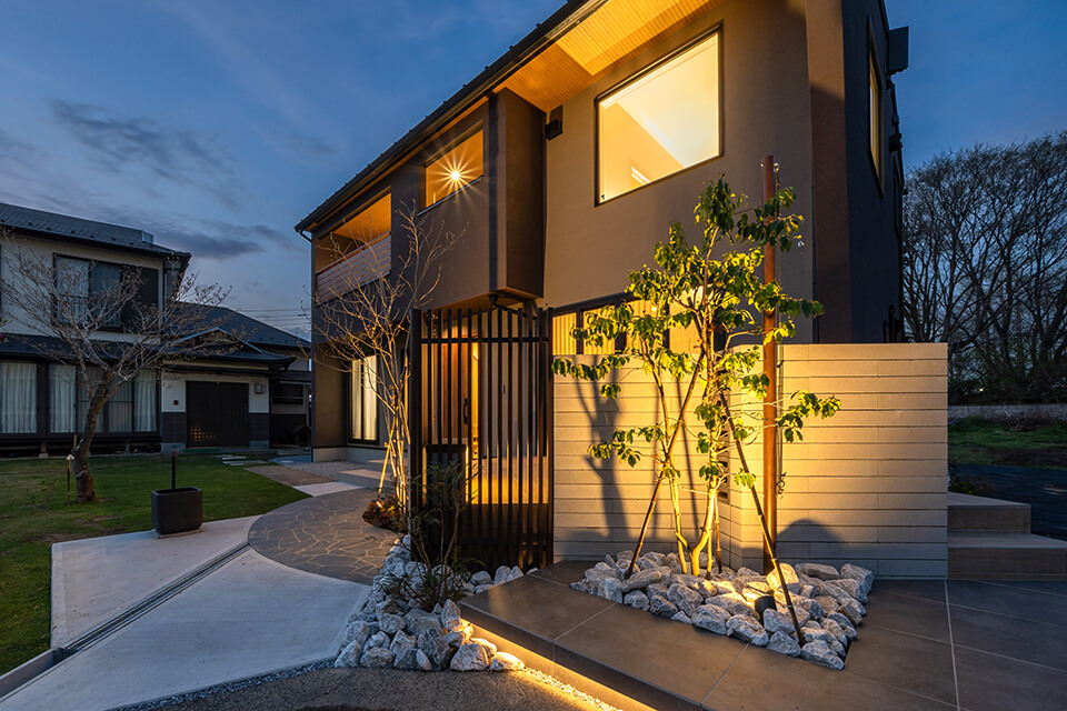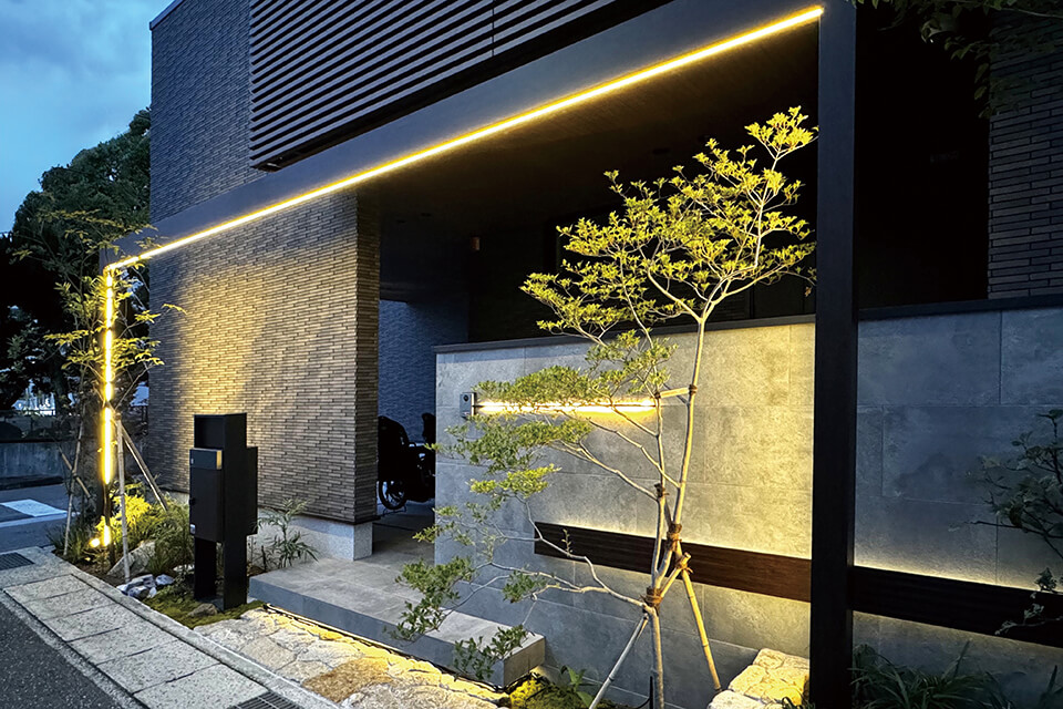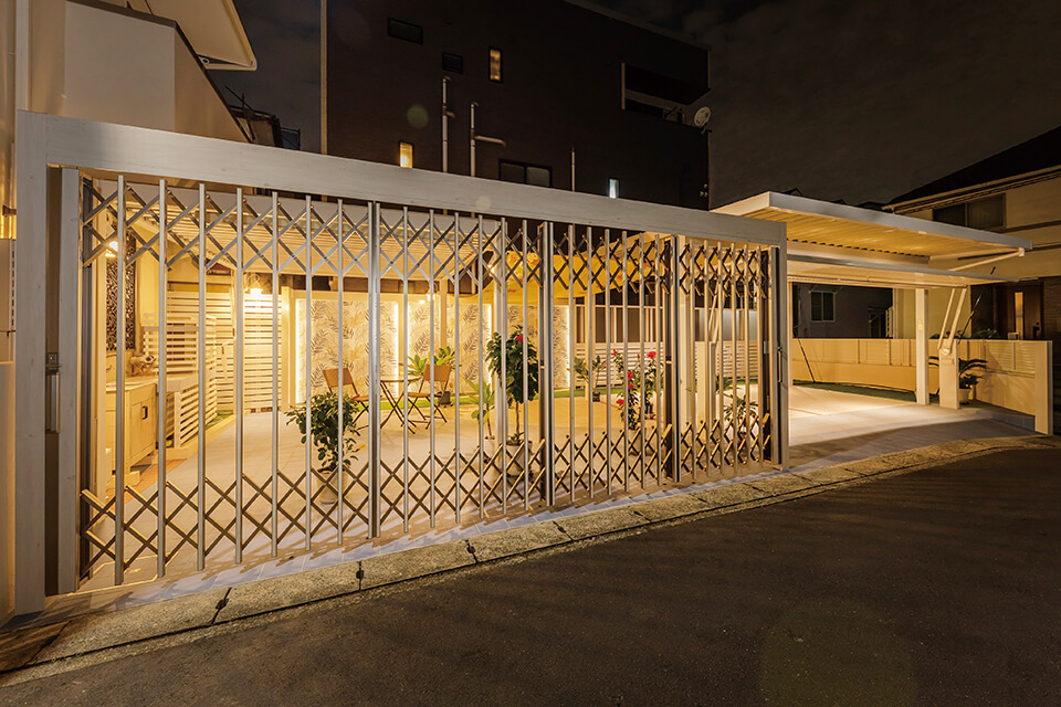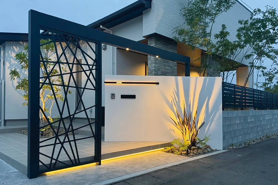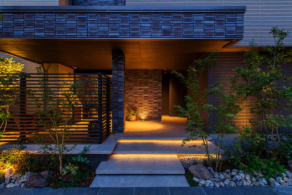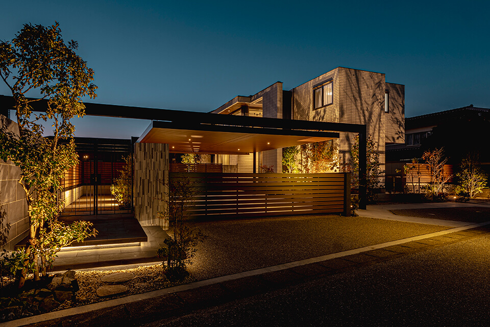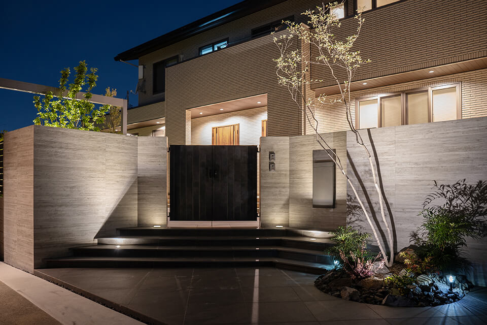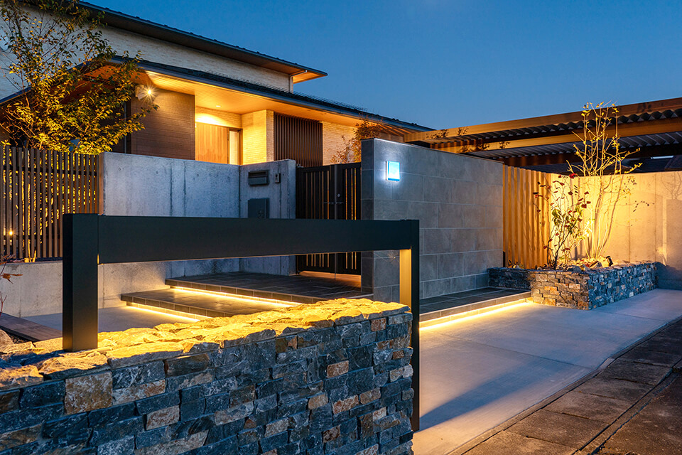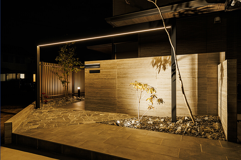 建物の外観とカラーに調和し、ブラックとブラウンを基調とした高級感あふれるファサード。2連の「ホームヤードルーフシステムライティングフェイス」が印象的で、立体感と奥行きを見事に演出しています。表札部分には金属風の質感を持つ「エバーアートボード」のラスティコッパーを採用し、スタイリッシュで洗練された雰囲気をプラス。さらに、奥のフレームには「アクセントパネル」を組み合わせることで、オリジナリティあふれるデザインが実現され、おもてなしの空間としてのこだわりが感じられます。 フレームや「千本格子」を用いた縦格子フェンスは直線美を活かした構成で、モダンかつ洗練された空間を創り上げています。夜のシーンでは、家族や来客、そして道行く人々を魅了する暖かな光が灯り、心地よい空間を演出しています。