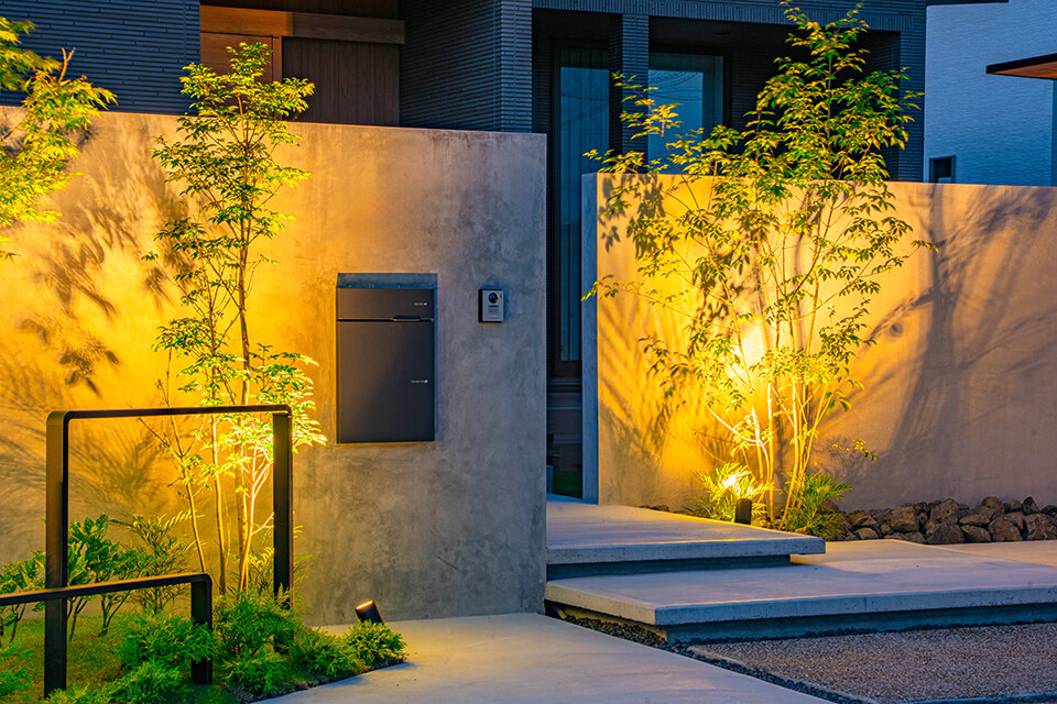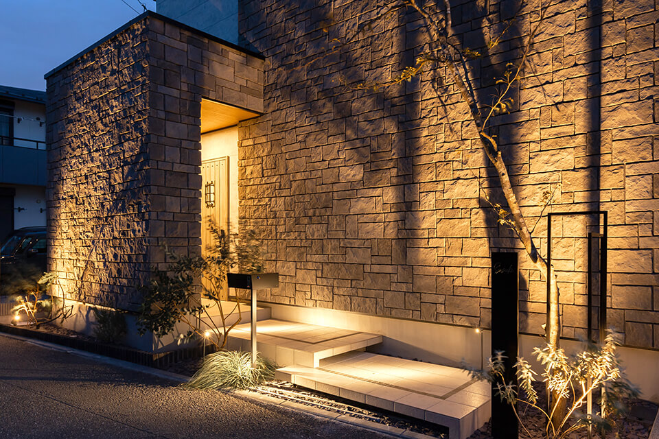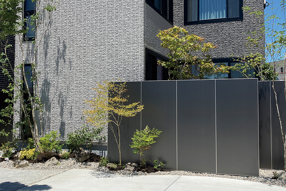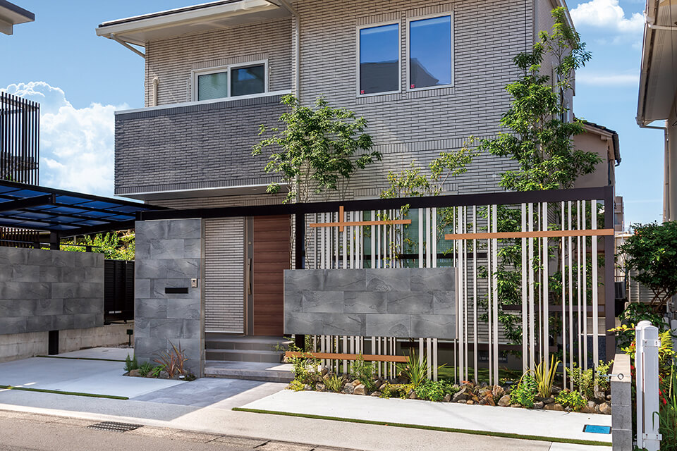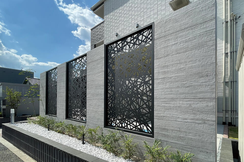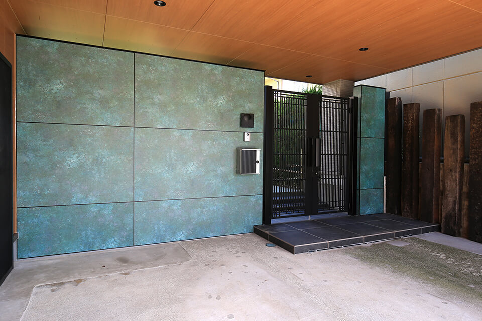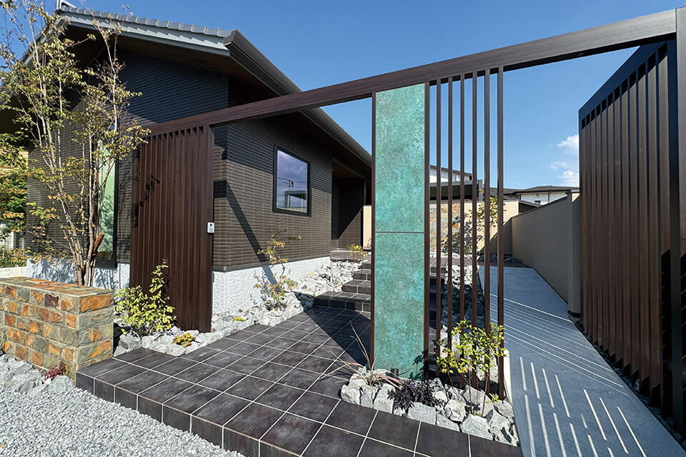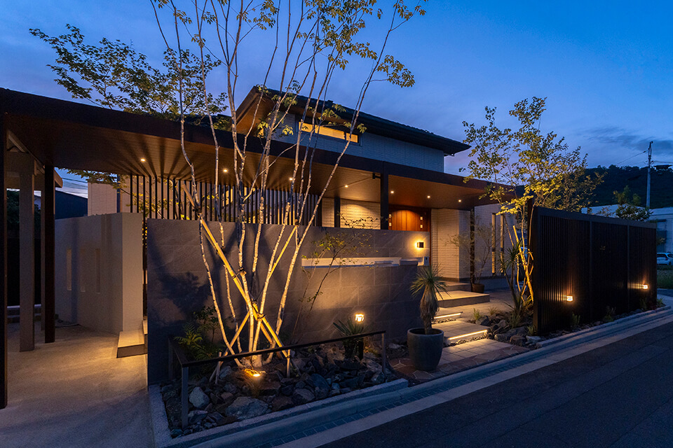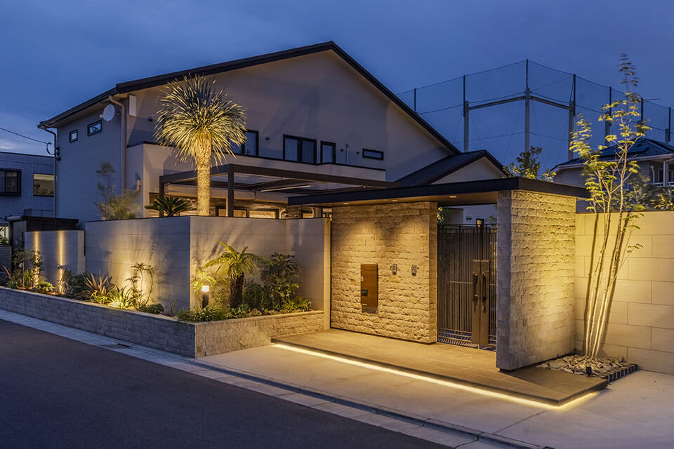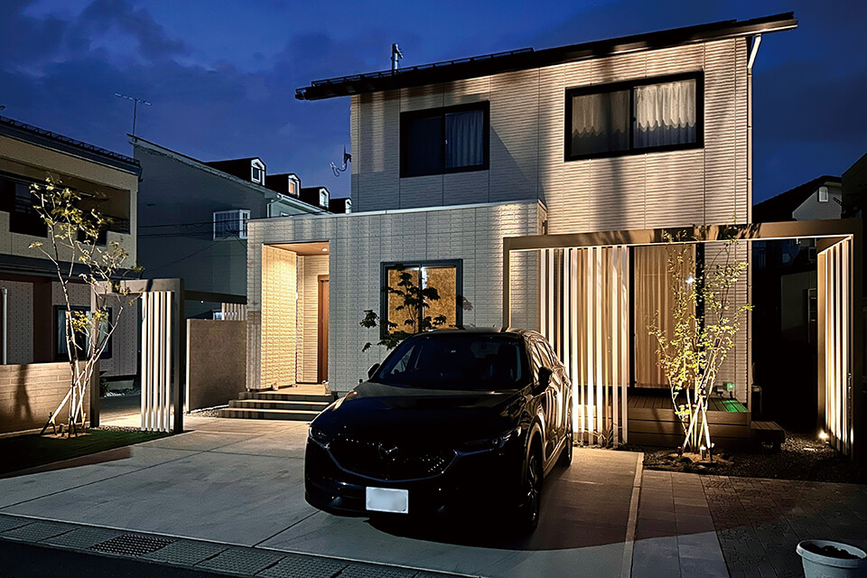 建物の外観とカラーに調和し、ブラックとブラウンを基調とした高級感あふれるファサード。2連の「ホームヤードルーフシステムライティングフェイス」が印象的で、立体感と奥行きを見事に演出しています。表札部分には金属風の質感を持つ「エバーアートボード」のラスティコッパーを採用し、スタイリッシュで洗練された雰囲気をプラス。さらに、奥のフレームには「アクセントパネル」を組み合わせることで、オリジナリティあふれるデザインが実現され、おもてなしの空間としてのこだわりが感じられます。 フレームや「千本格子」を用いた縦格子フェンスは直線美を活かした構成で、モダンかつ洗練された空間を創り上げています。夜のシーンでは、家族や来客、そして道行く人々を魅了する暖かな光が灯り、心地よい空間を演出しています。