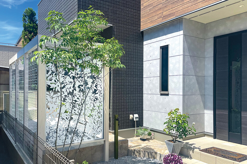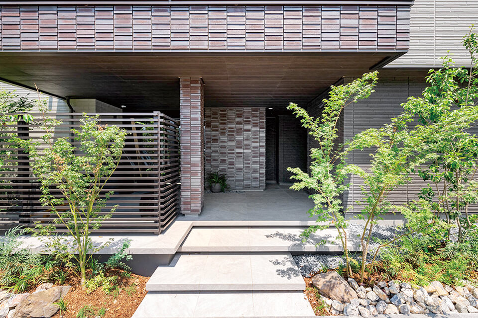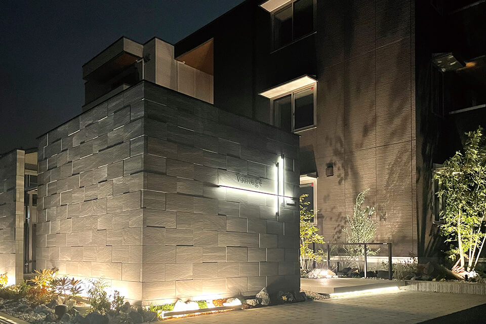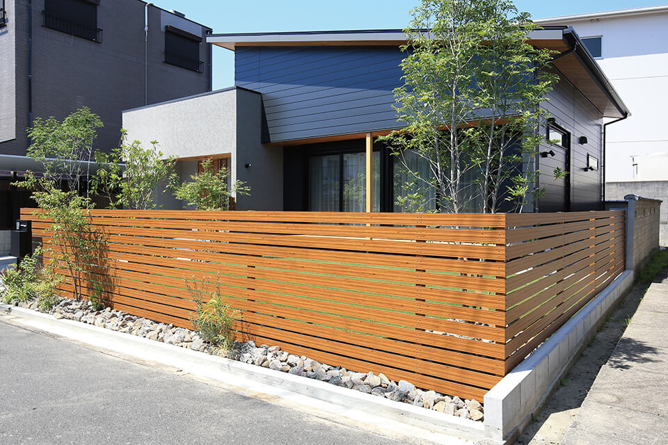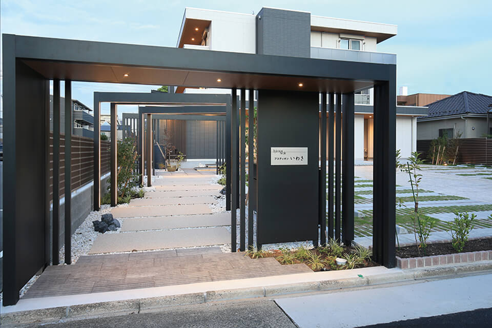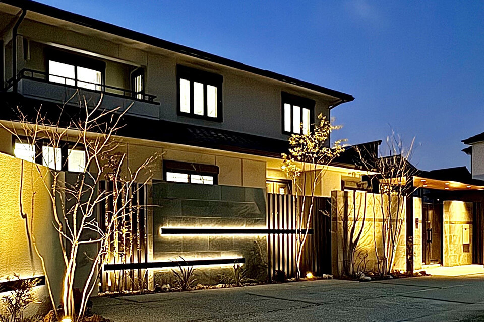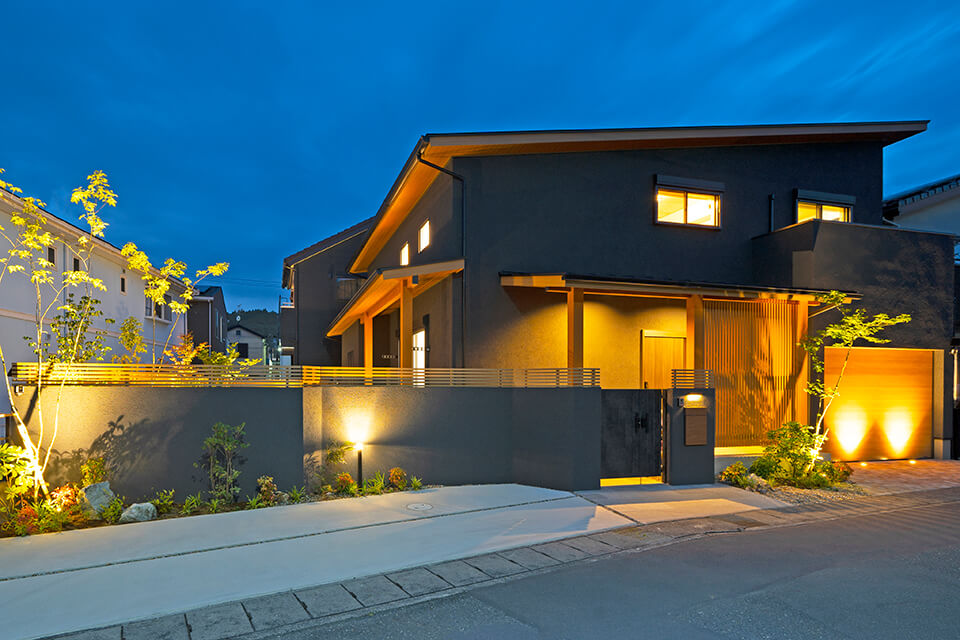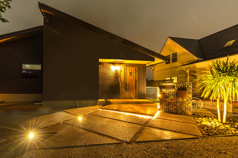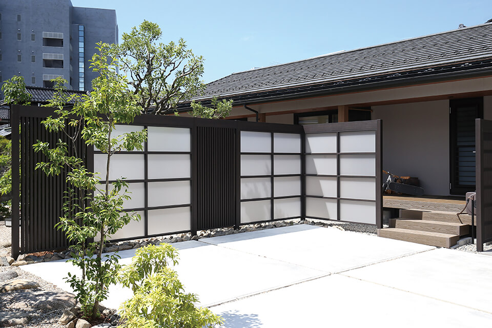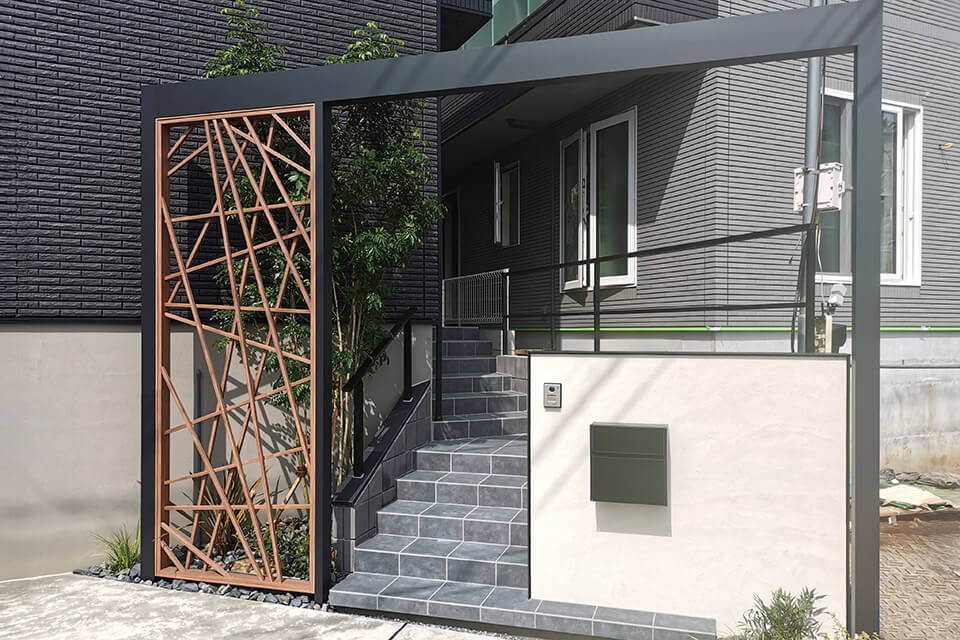 建物の外観とカラーに調和し、ブラックとブラウンを基調とした高級感あふれるファサード。2連の「ホームヤードルーフシステムライティングフェイス」が印象的で、立体感と奥行きを見事に演出しています。表札部分には金属風の質感を持つ「エバーアートボード」のラスティコッパーを採用し、スタイリッシュで洗練された雰囲気をプラス。さらに、奥のフレームには「アクセントパネル」を組み合わせることで、オリジナリティあふれるデザインが実現され、おもてなしの空間としてのこだわりが感じられます。 フレームや「千本格子」を用いた縦格子フェンスは直線美を活かした構成で、モダンかつ洗練された空間を創り上げています。夜のシーンでは、家族や来客、そして道行く人々を魅了する暖かな光が灯り、心地よい空間を演出しています。