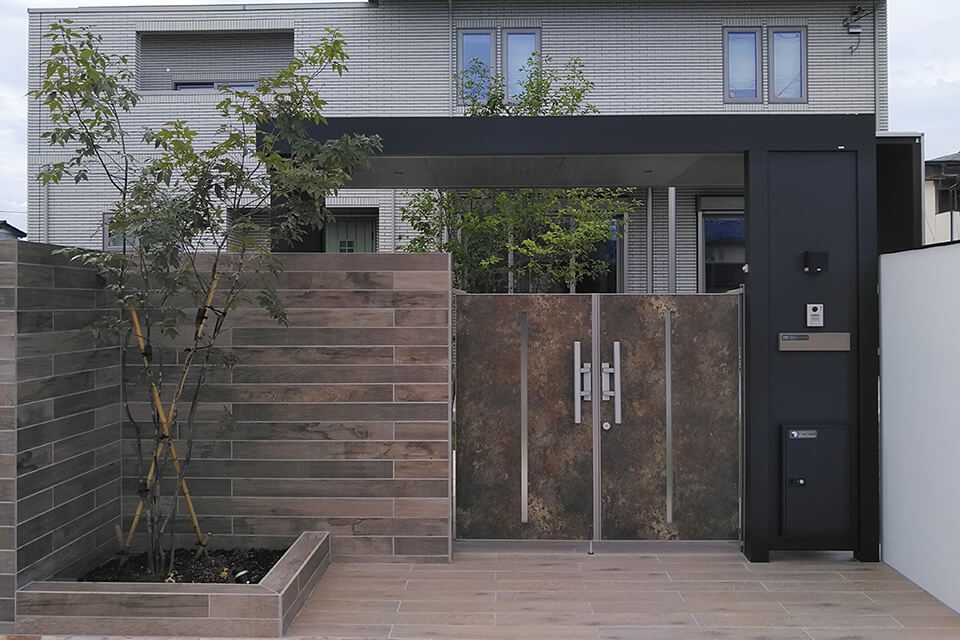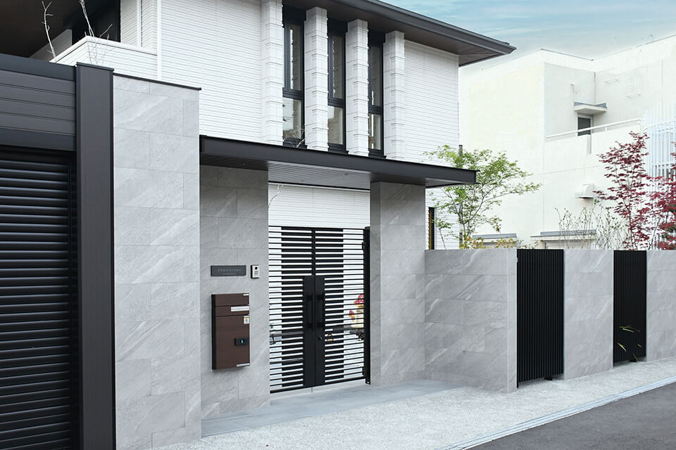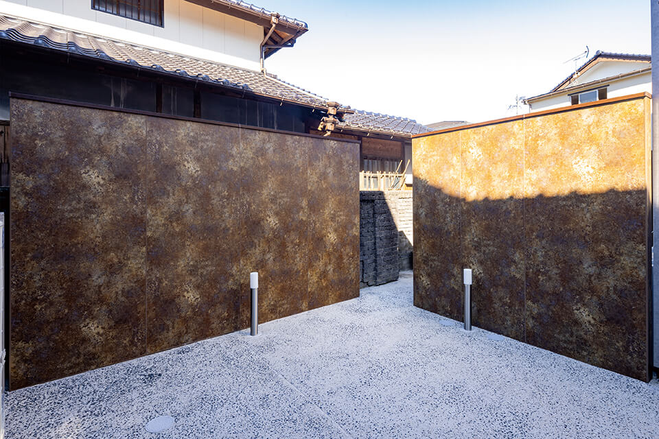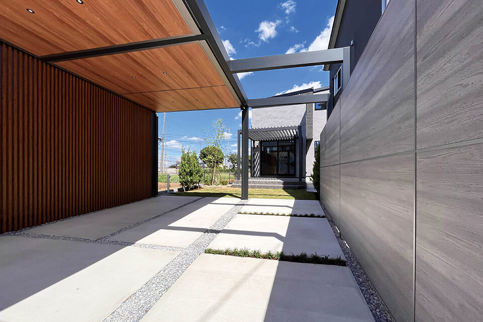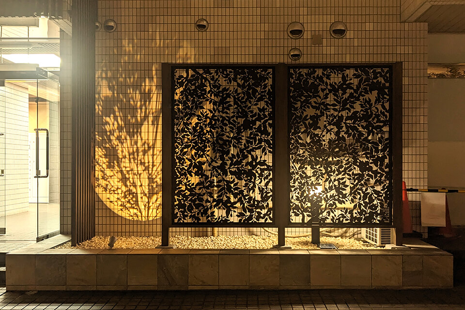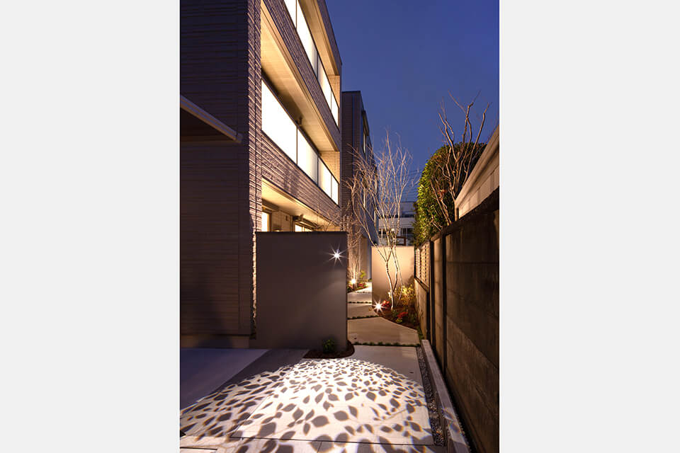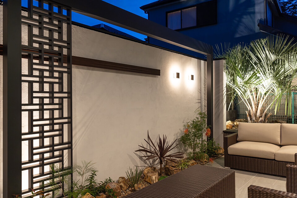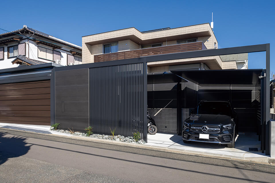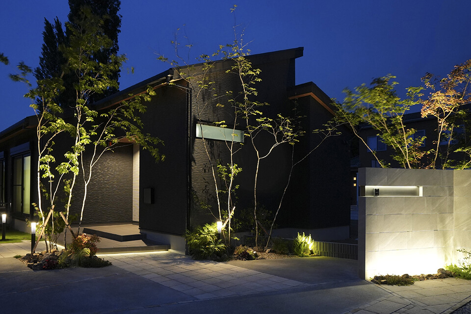 建物の外観とカラーに調和し、ブラックとブラウンを基調とした高級感あふれるファサード。2連の「ホームヤードルーフシステムライティングフェイス」が印象的で、立体感と奥行きを見事に演出しています。表札部分には金属風の質感を持つ「エバーアートボード」のラスティコッパーを採用し、スタイリッシュで洗練された雰囲気をプラス。さらに、奥のフレームには「アクセントパネル」を組み合わせることで、オリジナリティあふれるデザインが実現され、おもてなしの空間としてのこだわりが感じられます。 フレームや「千本格子」を用いた縦格子フェンスは直線美を活かした構成で、モダンかつ洗練された空間を創り上げています。夜のシーンでは、家族や来客、そして道行く人々を魅了する暖かな光が灯り、心地よい空間を演出しています。
