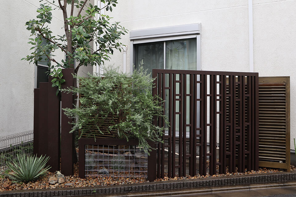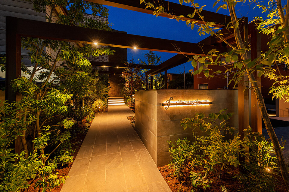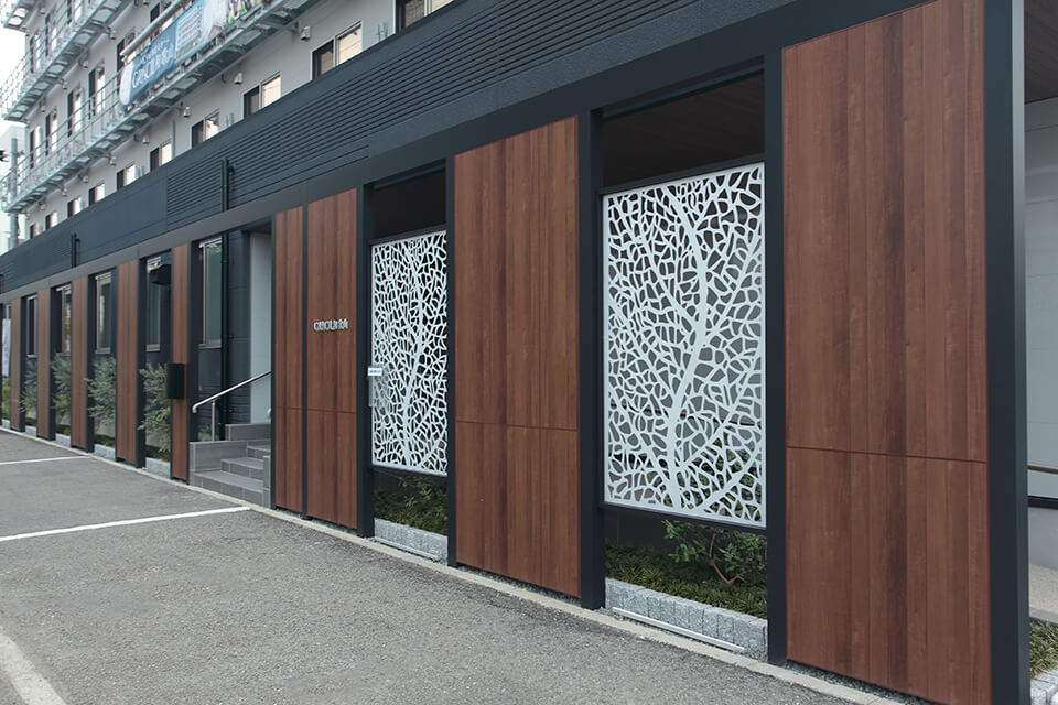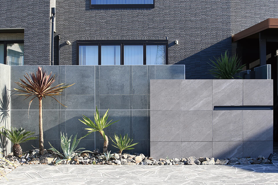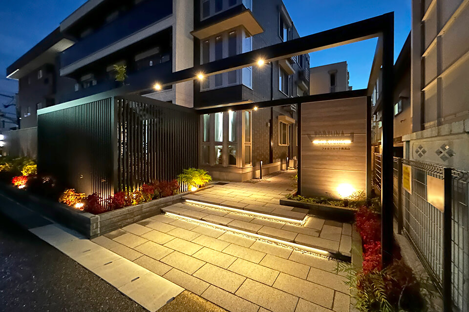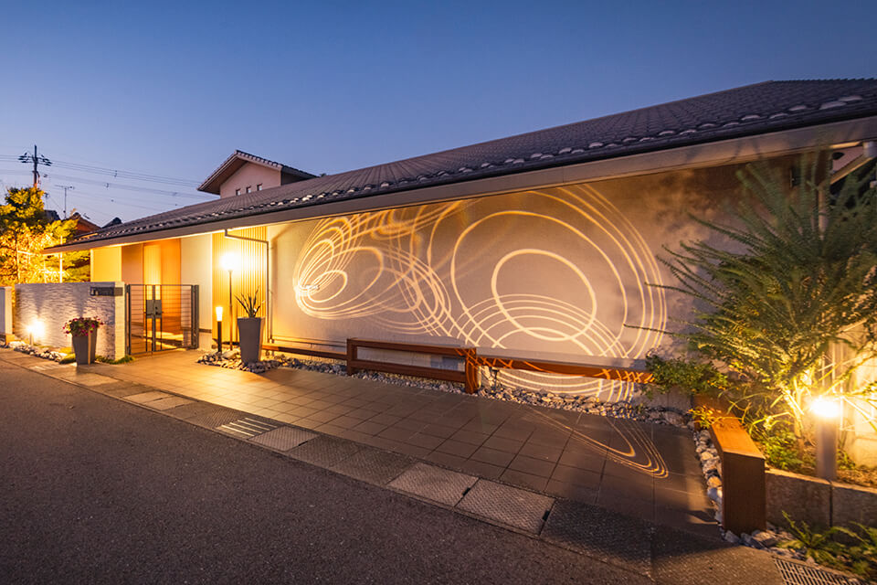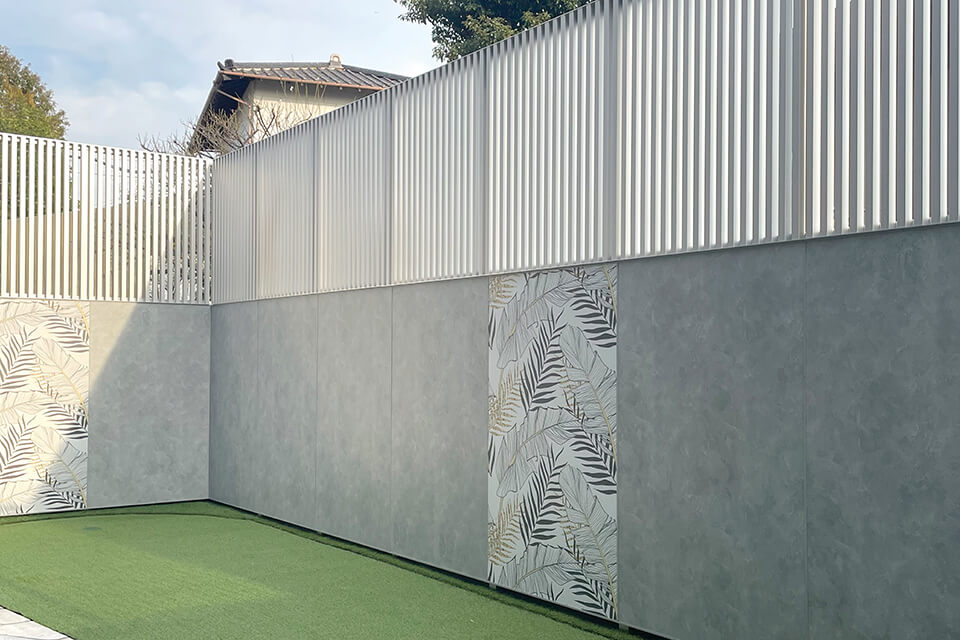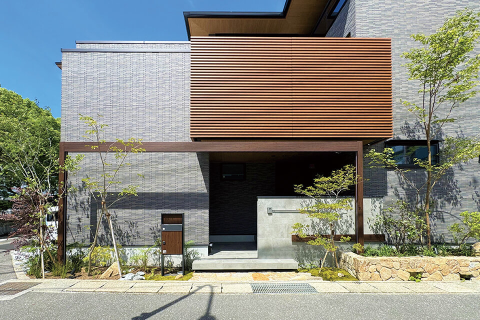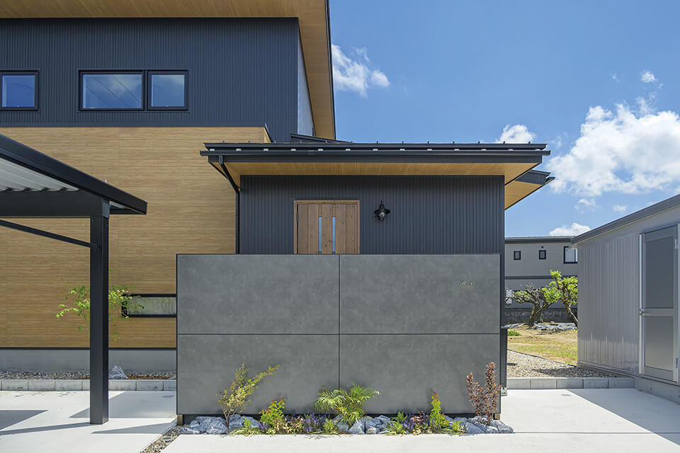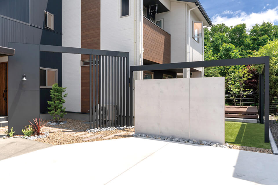 建物の外観とカラーに調和し、ブラックとブラウンを基調とした高級感あふれるファサード。2連の「ホームヤードルーフシステムライティングフェイス」が印象的で、立体感と奥行きを見事に演出しています。表札部分には金属風の質感を持つ「エバーアートボード」のラスティコッパーを採用し、スタイリッシュで洗練された雰囲気をプラス。さらに、奥のフレームには「アクセントパネル」を組み合わせることで、オリジナリティあふれるデザインが実現され、おもてなしの空間としてのこだわりが感じられます。 フレームや「千本格子」を用いた縦格子フェンスは直線美を活かした構成で、モダンかつ洗練された空間を創り上げています。夜のシーンでは、家族や来客、そして道行く人々を魅了する暖かな光が灯り、心地よい空間を演出しています。