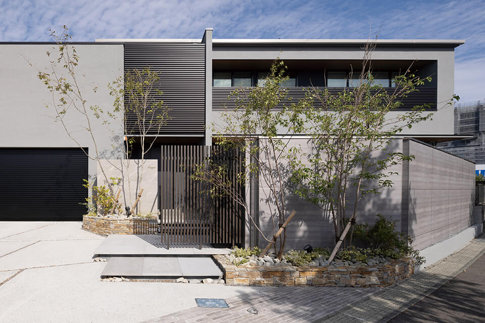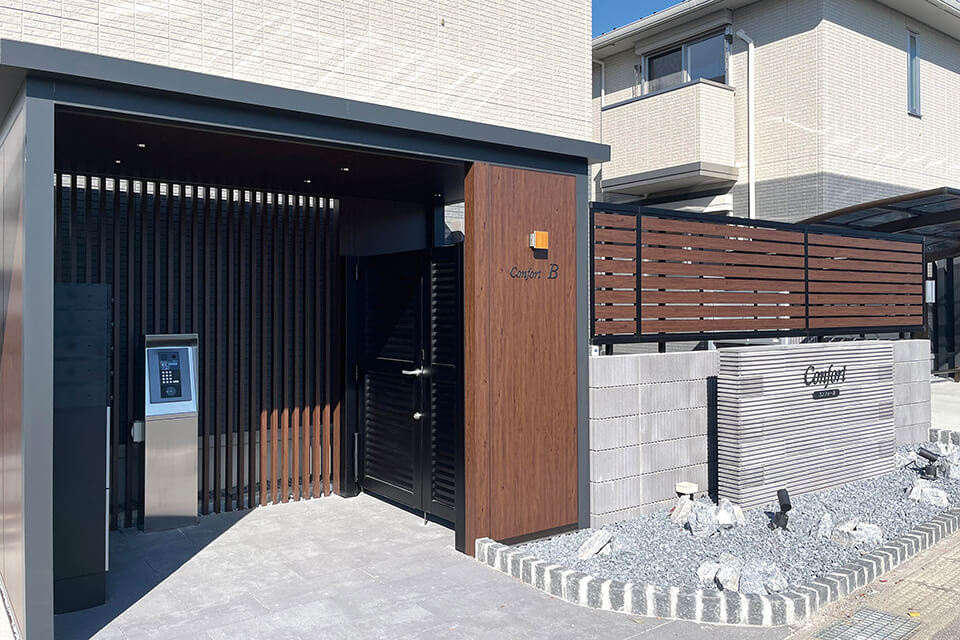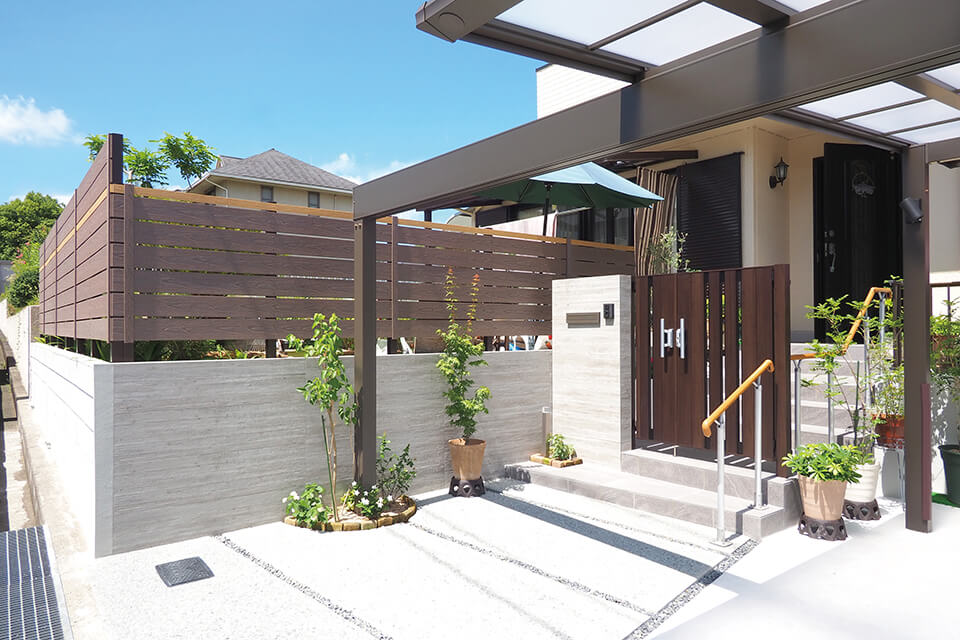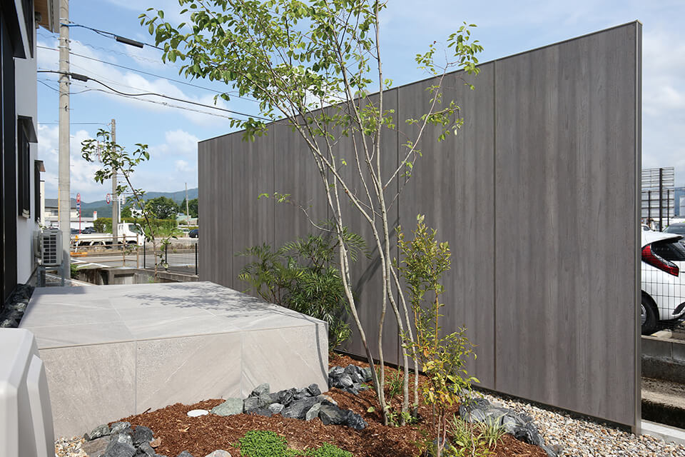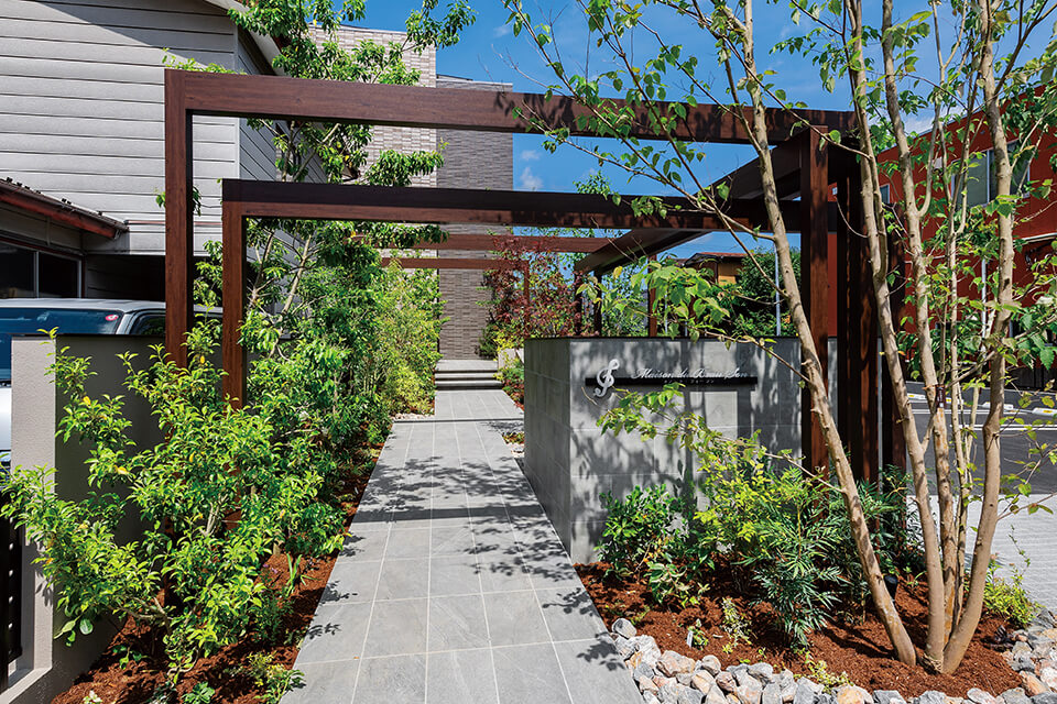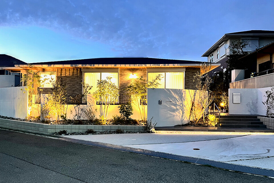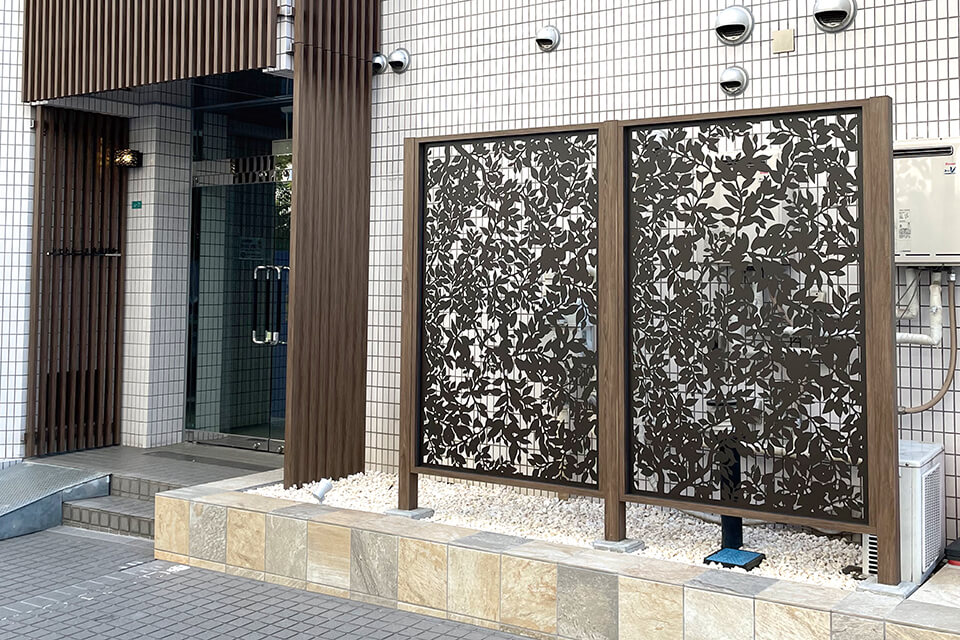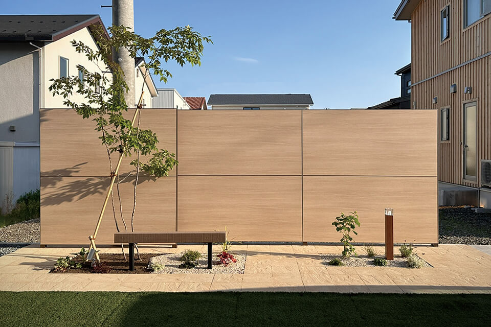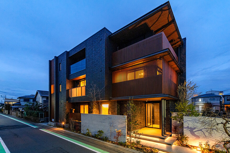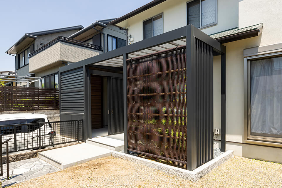 建物の外観とカラーに調和し、ブラックとブラウンを基調とした高級感あふれるファサード。2連の「ホームヤードルーフシステムライティングフェイス」が印象的で、立体感と奥行きを見事に演出しています。表札部分には金属風の質感を持つ「エバーアートボード」のラスティコッパーを採用し、スタイリッシュで洗練された雰囲気をプラス。さらに、奥のフレームには「アクセントパネル」を組み合わせることで、オリジナリティあふれるデザインが実現され、おもてなしの空間としてのこだわりが感じられます。 フレームや「千本格子」を用いた縦格子フェンスは直線美を活かした構成で、モダンかつ洗練された空間を創り上げています。夜のシーンでは、家族や来客、そして道行く人々を魅了する暖かな光が灯り、心地よい空間を演出しています。