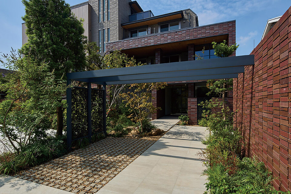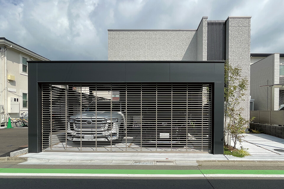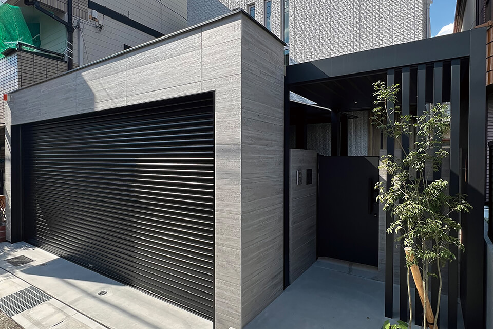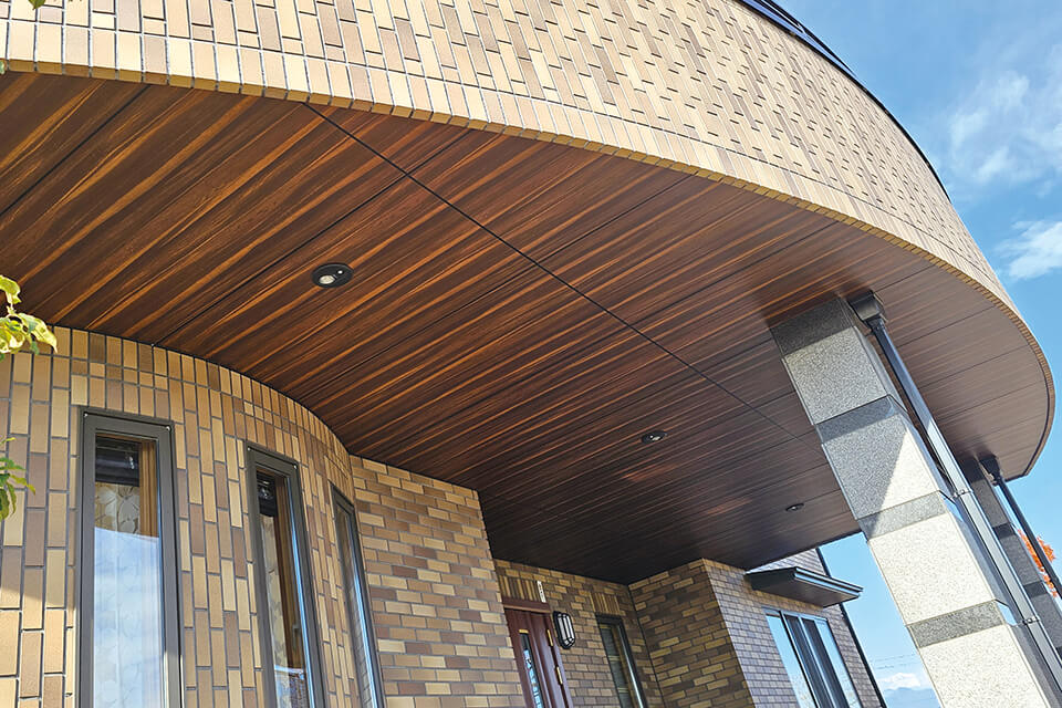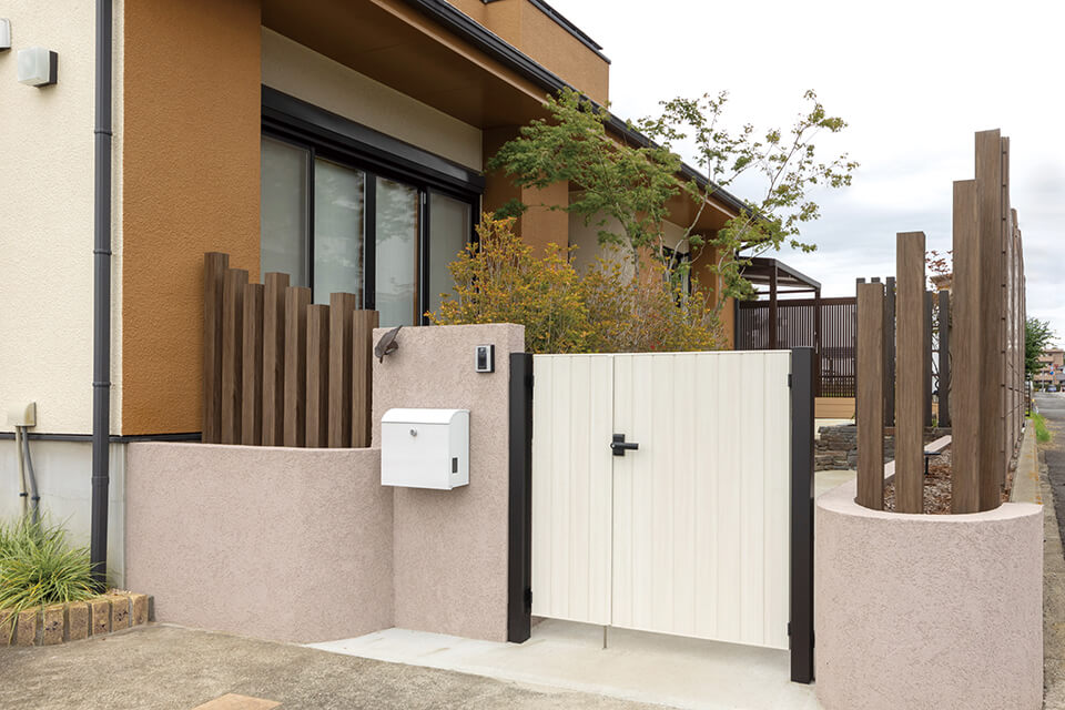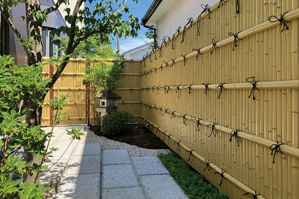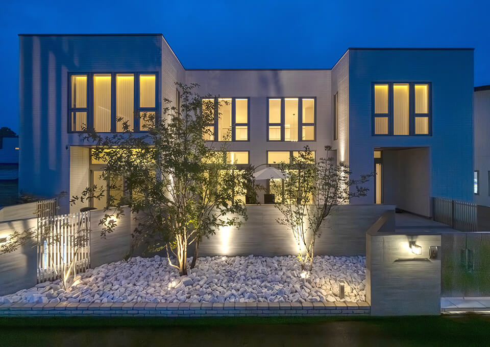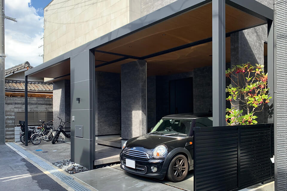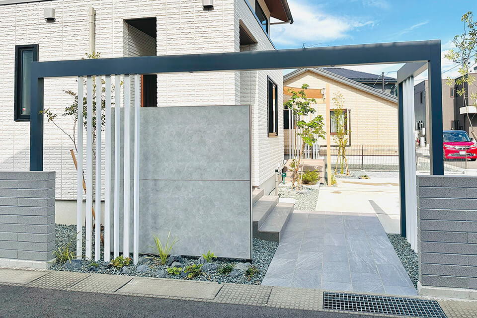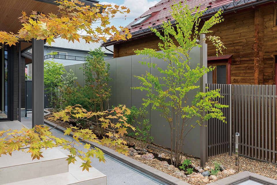 建物の外観とカラーに調和し、ブラックとブラウンを基調とした高級感あふれるファサード。2連の「ホームヤードルーフシステムライティングフェイス」が印象的で、立体感と奥行きを見事に演出しています。表札部分には金属風の質感を持つ「エバーアートボード」のラスティコッパーを採用し、スタイリッシュで洗練された雰囲気をプラス。さらに、奥のフレームには「アクセントパネル」を組み合わせることで、オリジナリティあふれるデザインが実現され、おもてなしの空間としてのこだわりが感じられます。 フレームや「千本格子」を用いた縦格子フェンスは直線美を活かした構成で、モダンかつ洗練された空間を創り上げています。夜のシーンでは、家族や来客、そして道行く人々を魅了する暖かな光が灯り、心地よい空間を演出しています。
