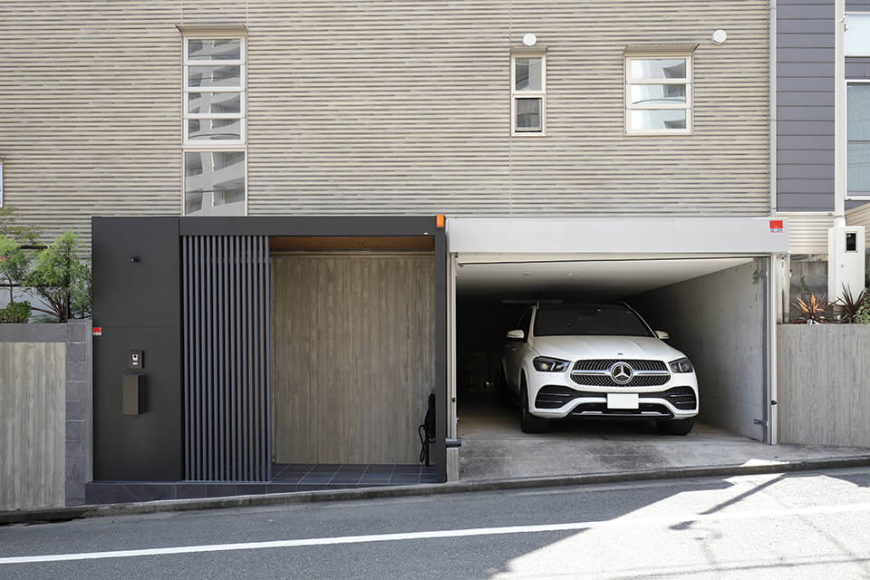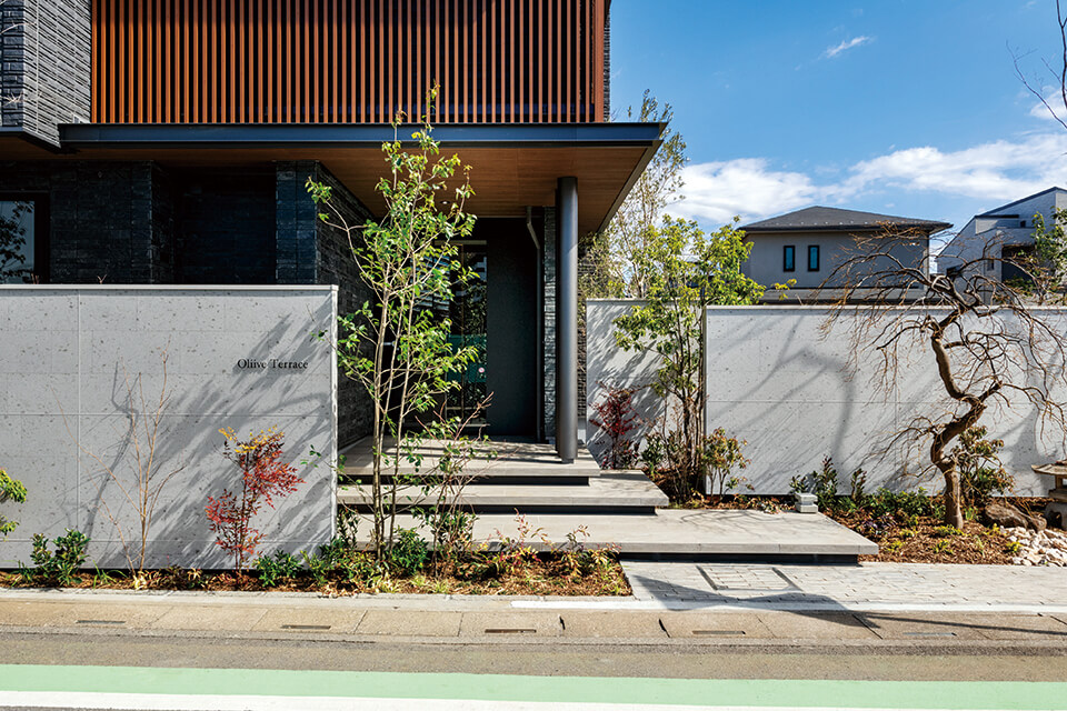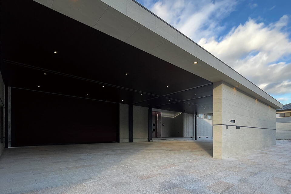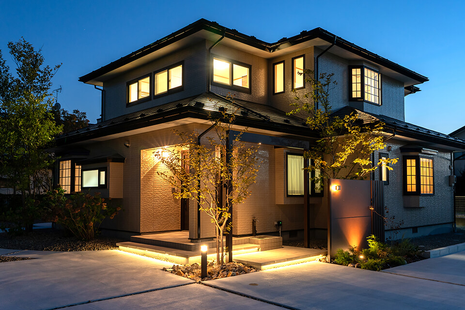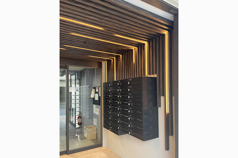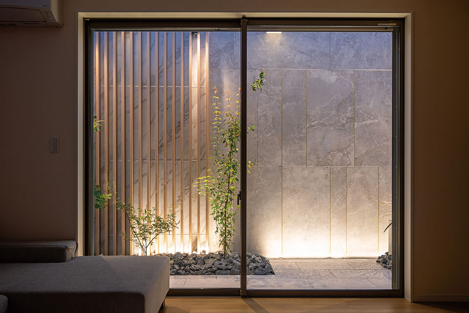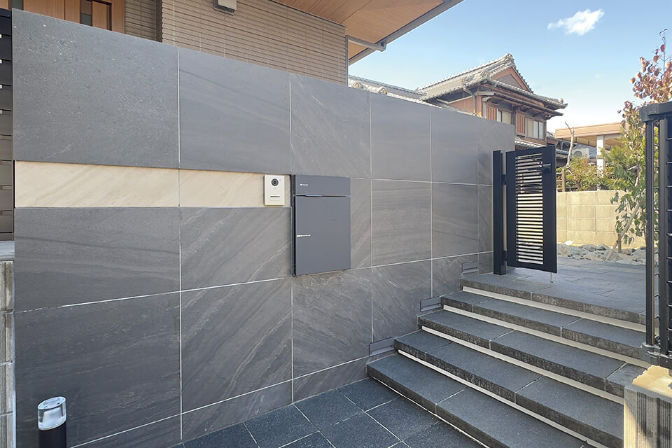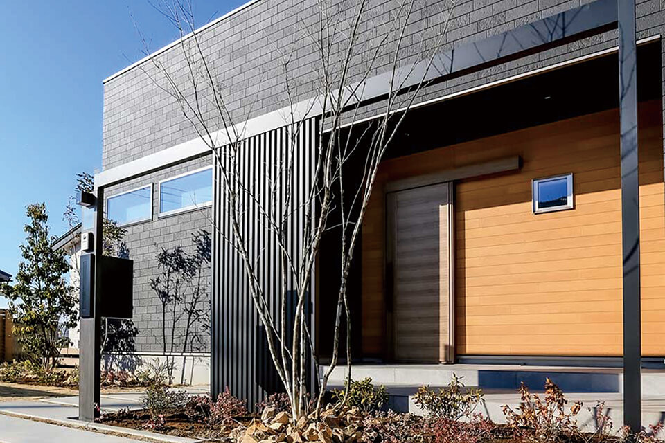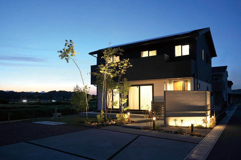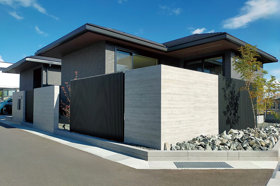 建物の外観とカラーに調和し、ブラックとブラウンを基調とした高級感あふれるファサード。2連の「ホームヤードルーフシステムライティングフェイス」が印象的で、立体感と奥行きを見事に演出しています。表札部分には金属風の質感を持つ「エバーアートボード」のラスティコッパーを採用し、スタイリッシュで洗練された雰囲気をプラス。さらに、奥のフレームには「アクセントパネル」を組み合わせることで、オリジナリティあふれるデザインが実現され、おもてなしの空間としてのこだわりが感じられます。 フレームや「千本格子」を用いた縦格子フェンスは直線美を活かした構成で、モダンかつ洗練された空間を創り上げています。夜のシーンでは、家族や来客、そして道行く人々を魅了する暖かな光が灯り、心地よい空間を演出しています。