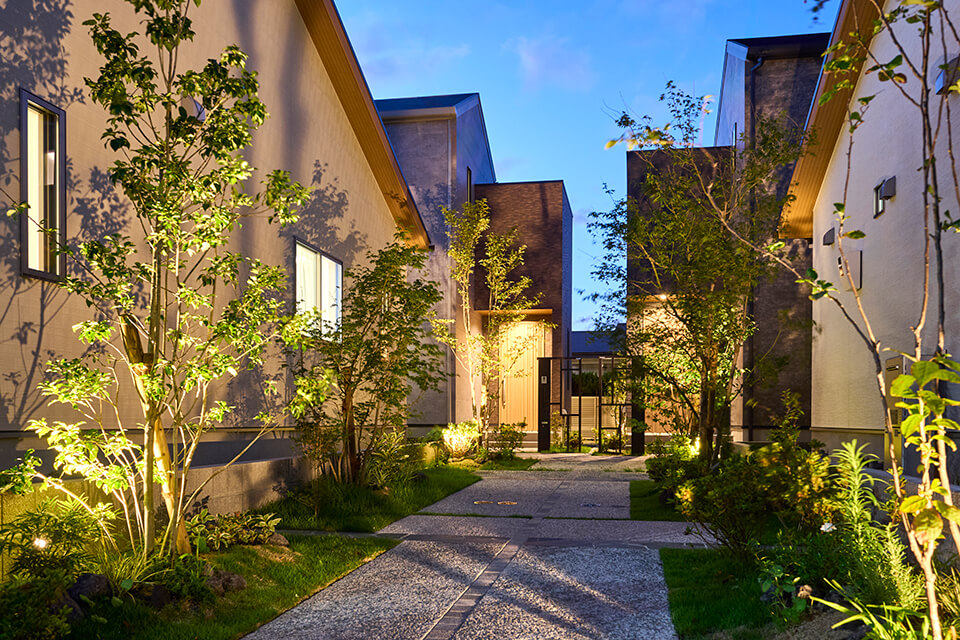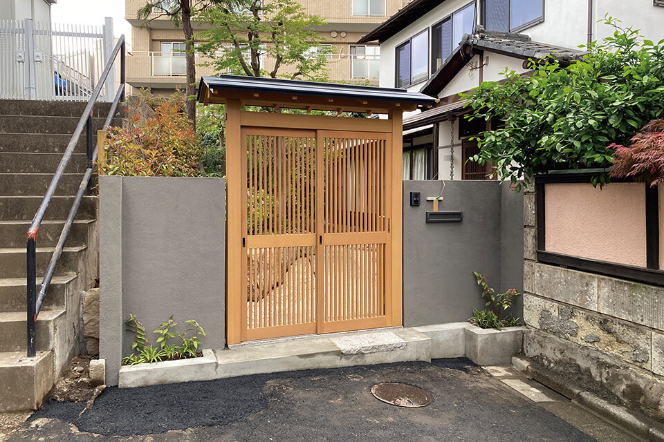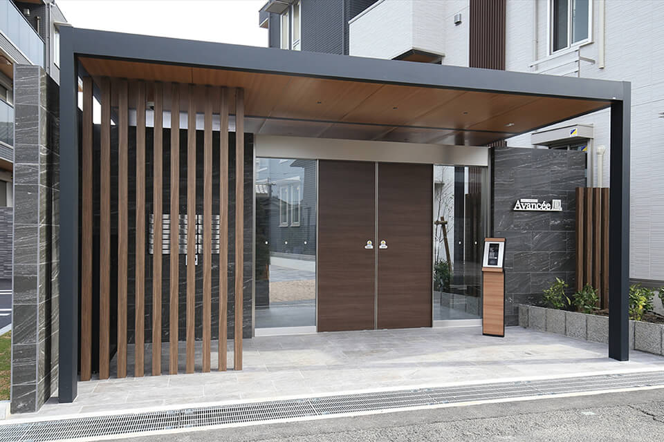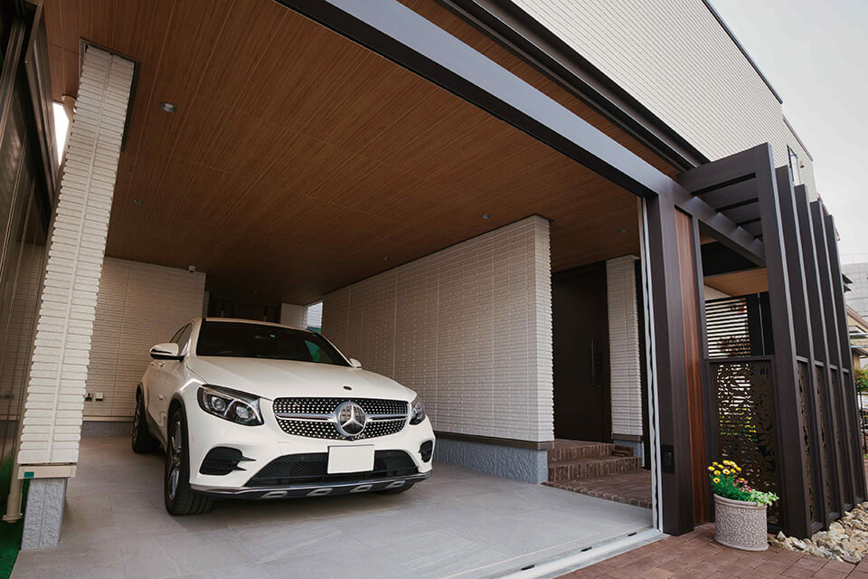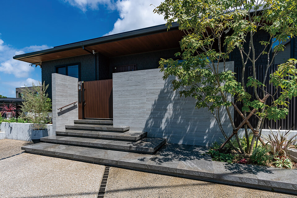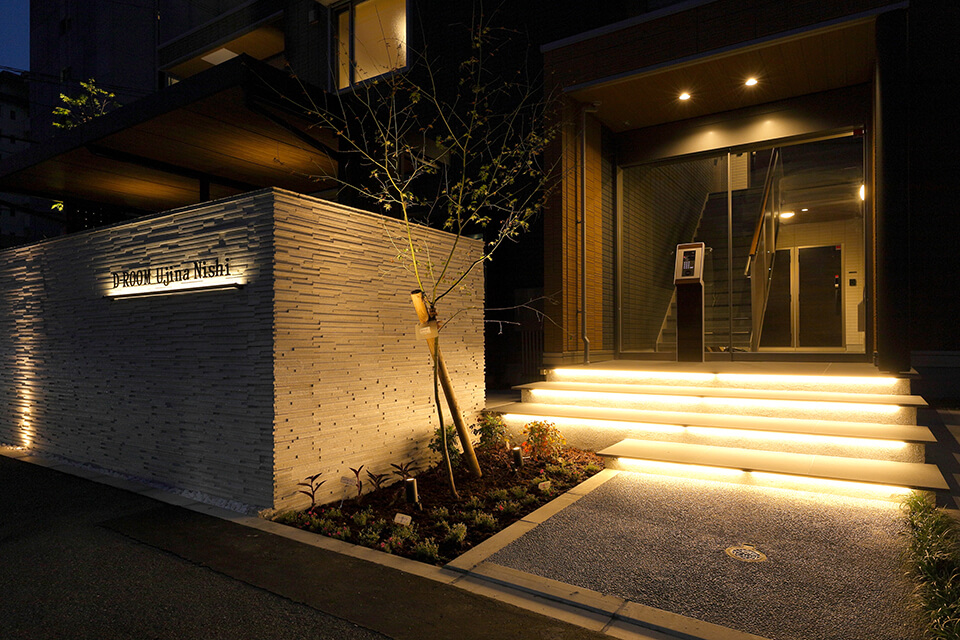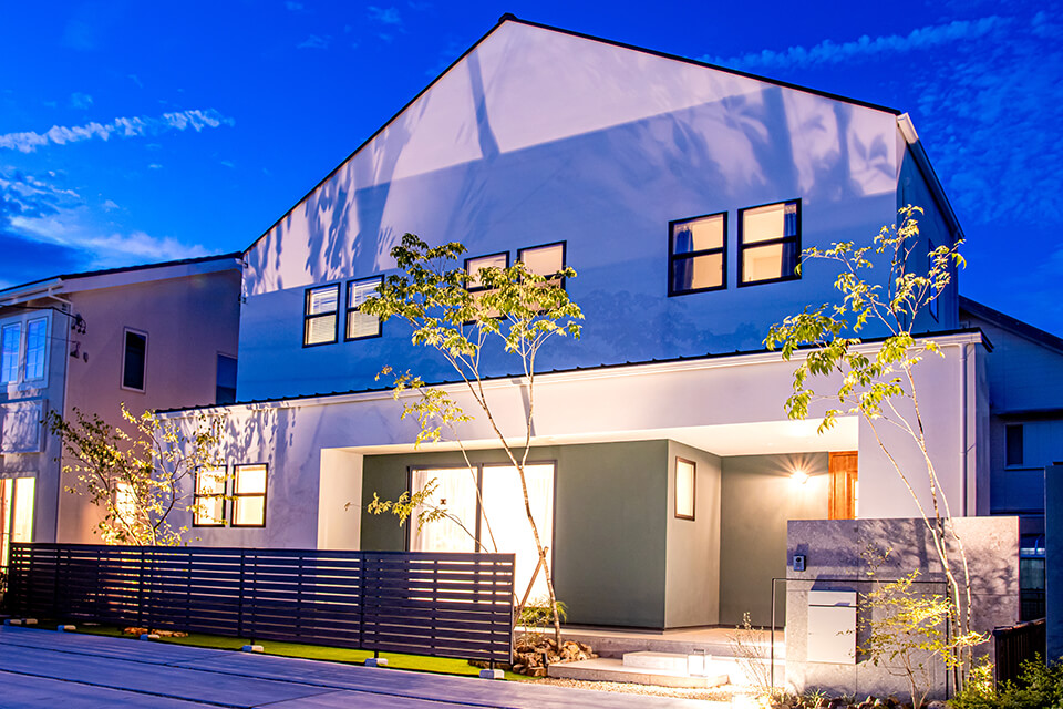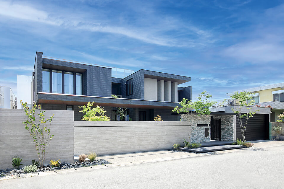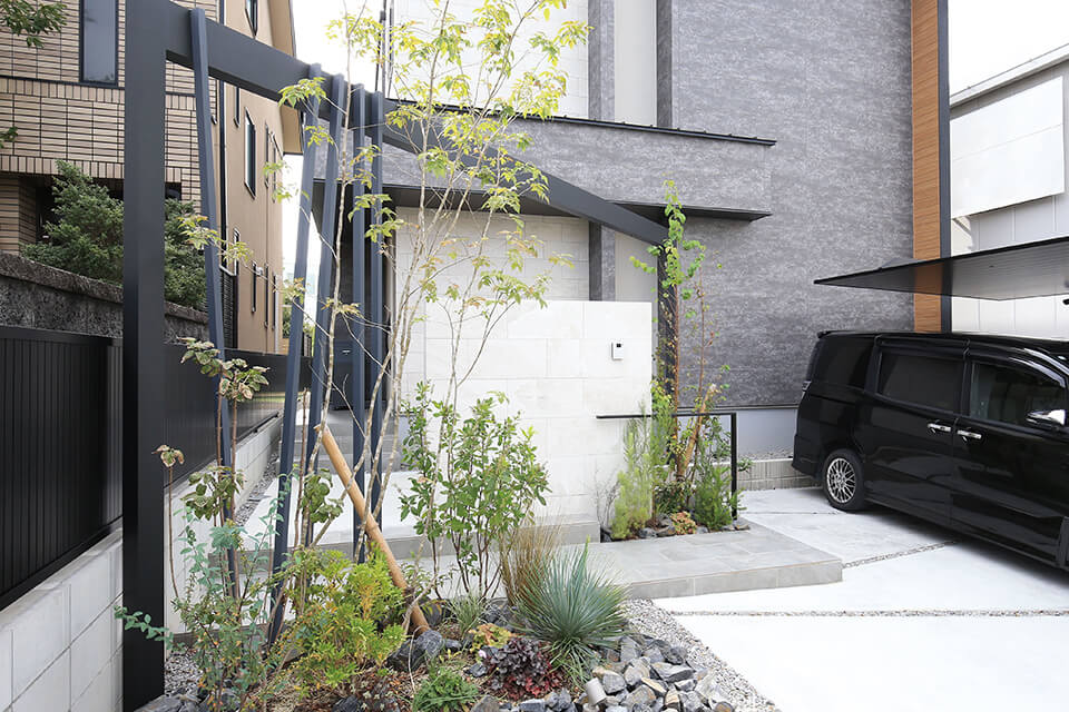 建物の外観とカラーに調和し、ブラックとブラウンを基調とした高級感あふれるファサード。2連の「ホームヤードルーフシステムライティングフェイス」が印象的で、立体感と奥行きを見事に演出しています。表札部分には金属風の質感を持つ「エバーアートボード」のラスティコッパーを採用し、スタイリッシュで洗練された雰囲気をプラス。さらに、奥のフレームには「アクセントパネル」を組み合わせることで、オリジナリティあふれるデザインが実現され、おもてなしの空間としてのこだわりが感じられます。 フレームや「千本格子」を用いた縦格子フェンスは直線美を活かした構成で、モダンかつ洗練された空間を創り上げています。夜のシーンでは、家族や来客、そして道行く人々を魅了する暖かな光が灯り、心地よい空間を演出しています。
