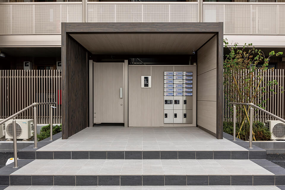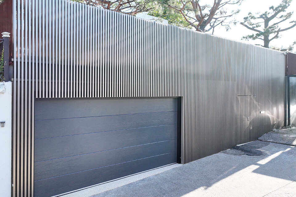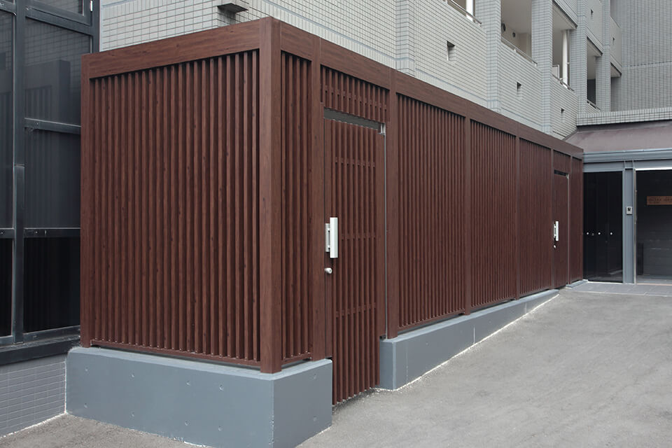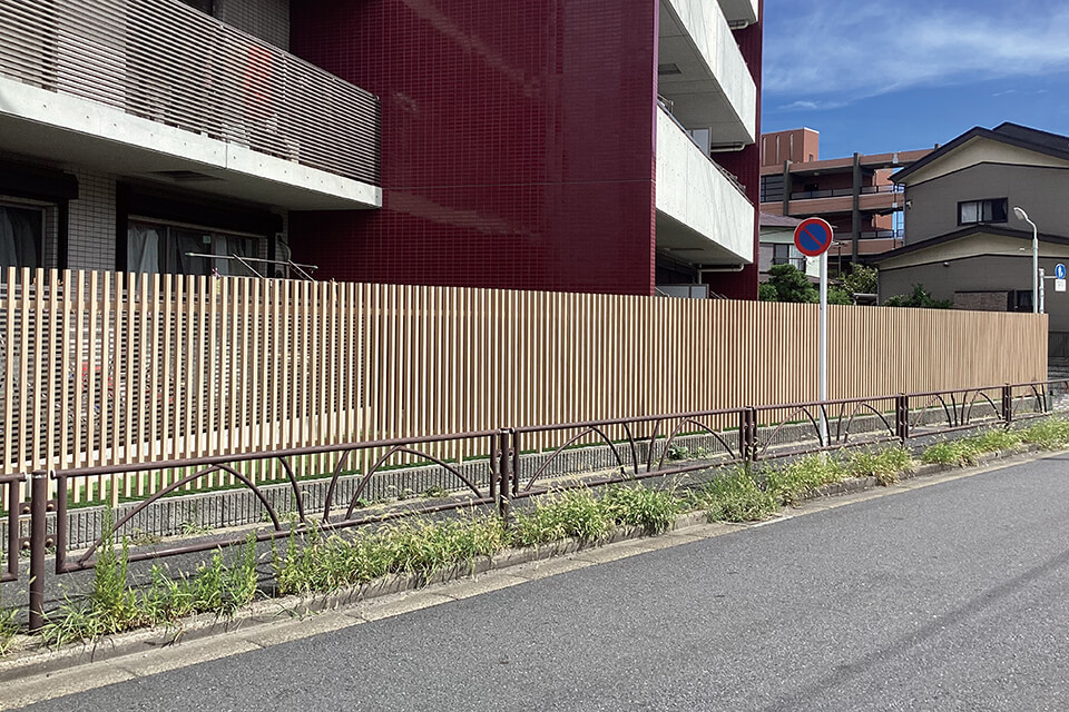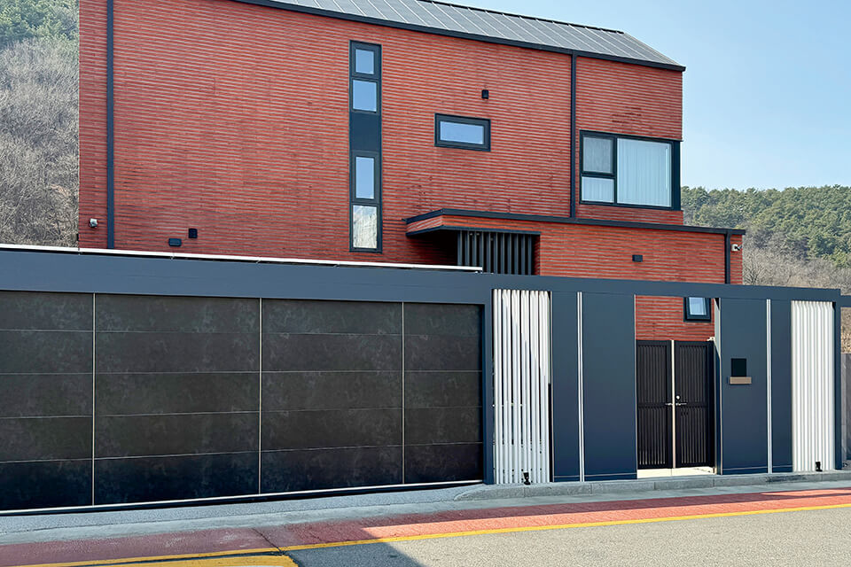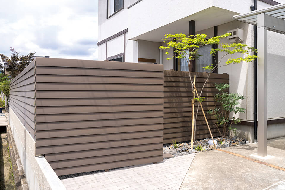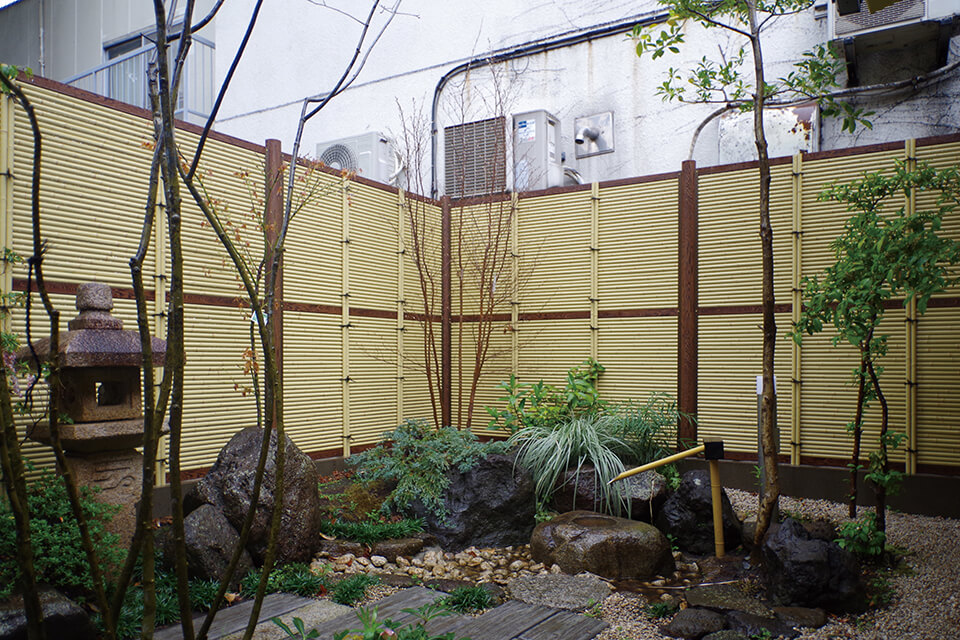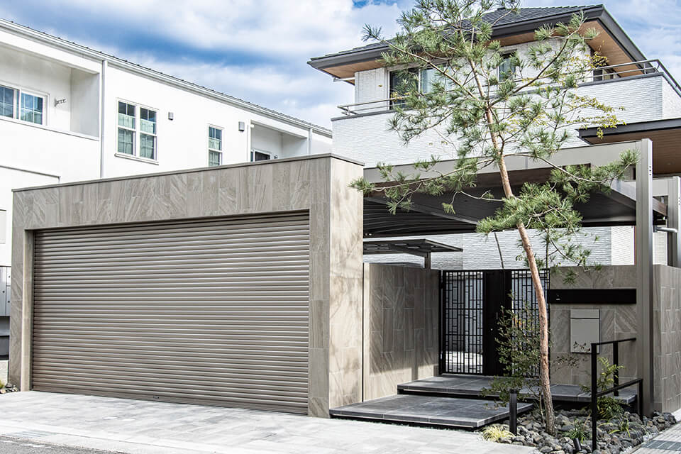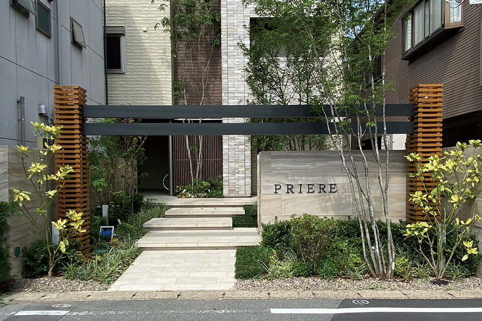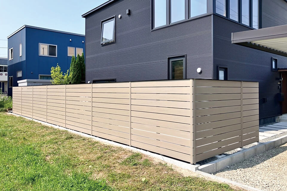 建物の外観とカラーに調和し、ブラックとブラウンを基調とした高級感あふれるファサード。2連の「ホームヤードルーフシステムライティングフェイス」が印象的で、立体感と奥行きを見事に演出しています。表札部分には金属風の質感を持つ「エバーアートボード」のラスティコッパーを採用し、スタイリッシュで洗練された雰囲気をプラス。さらに、奥のフレームには「アクセントパネル」を組み合わせることで、オリジナリティあふれるデザインが実現され、おもてなしの空間としてのこだわりが感じられます。 フレームや「千本格子」を用いた縦格子フェンスは直線美を活かした構成で、モダンかつ洗練された空間を創り上げています。夜のシーンでは、家族や来客、そして道行く人々を魅了する暖かな光が灯り、心地よい空間を演出しています。
