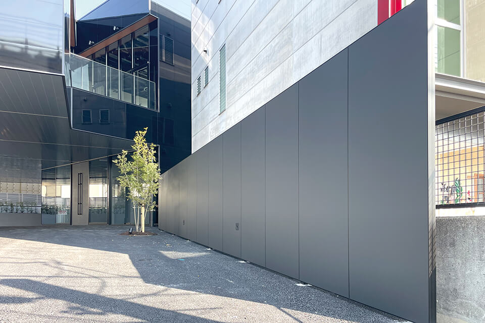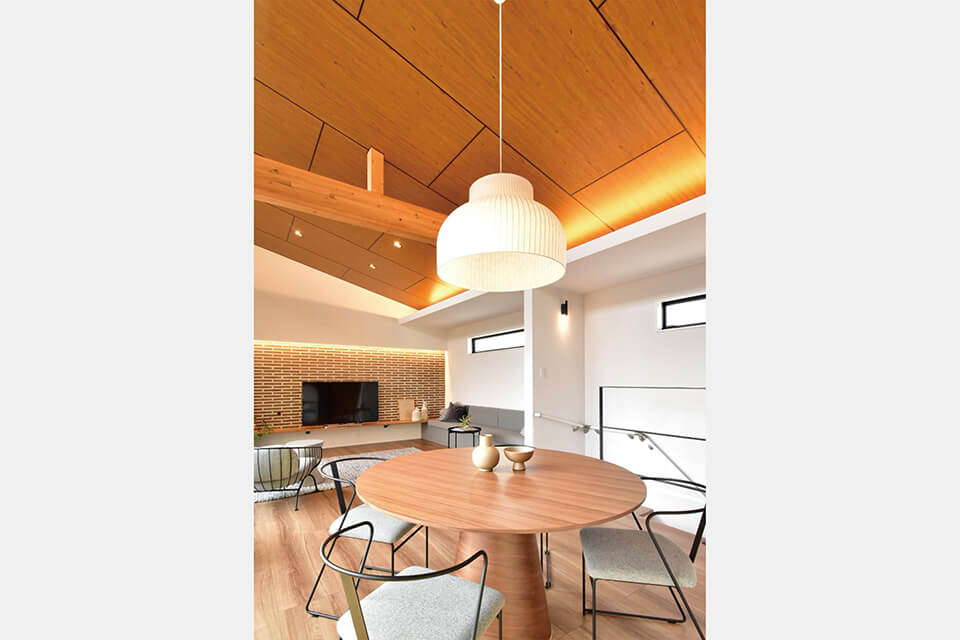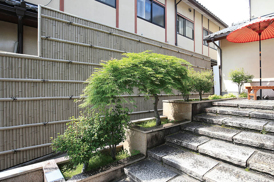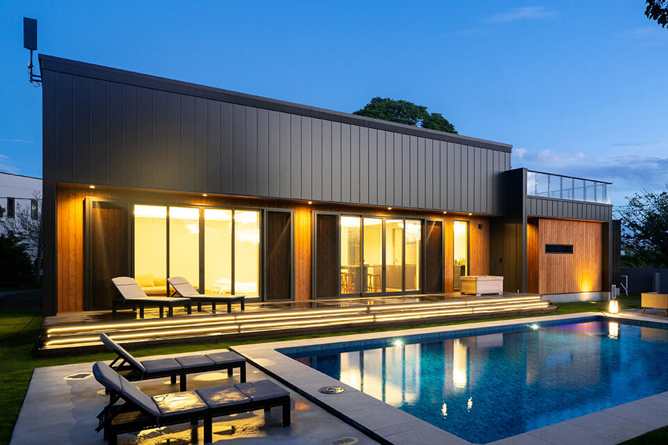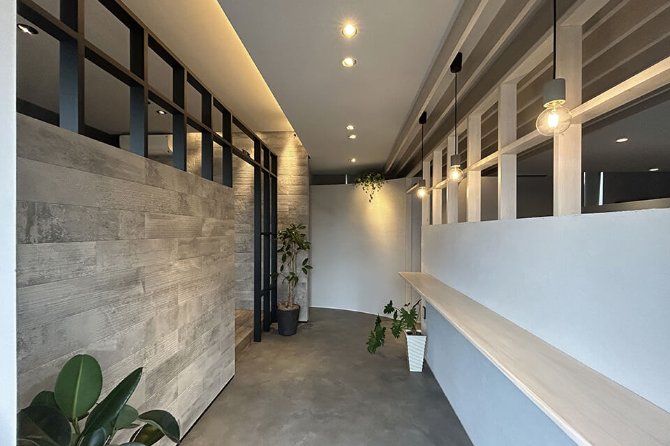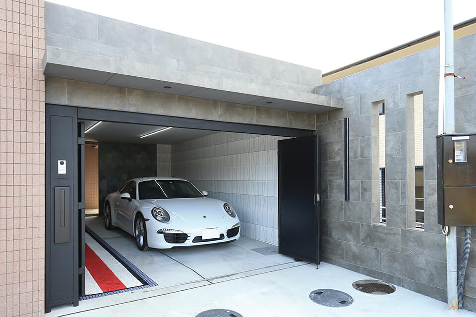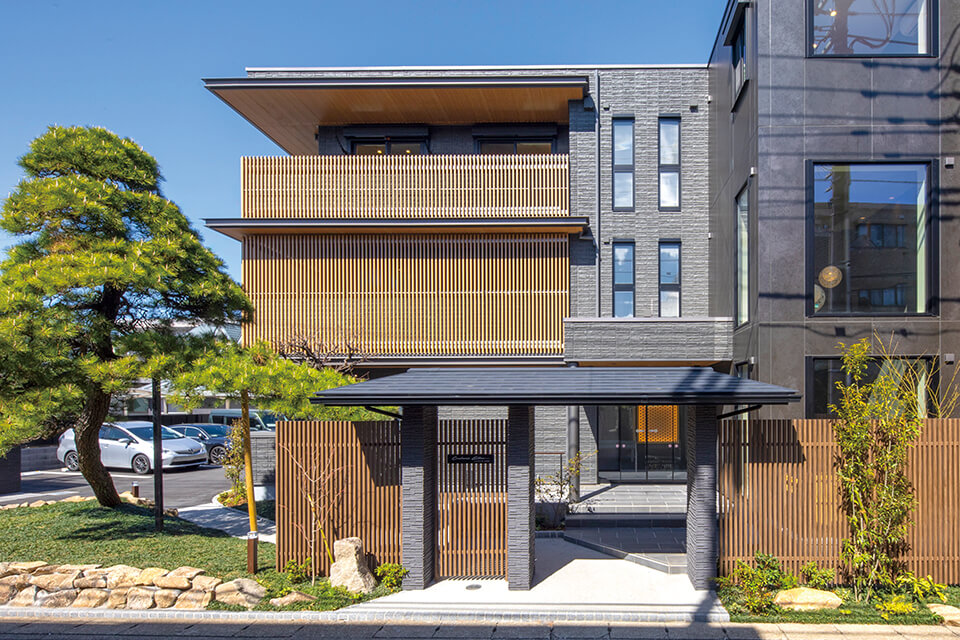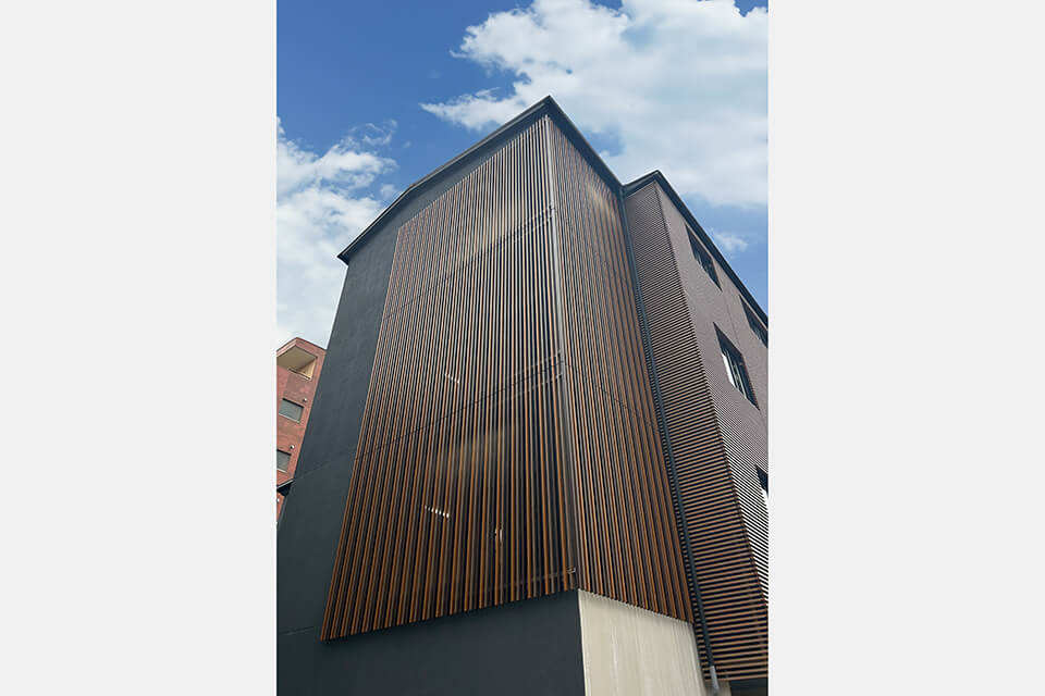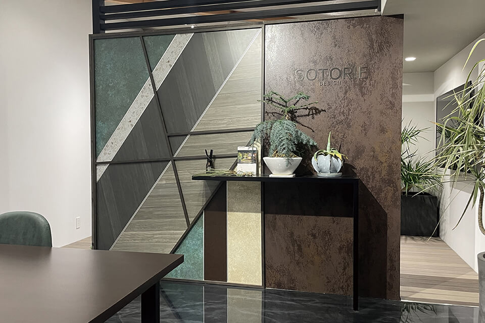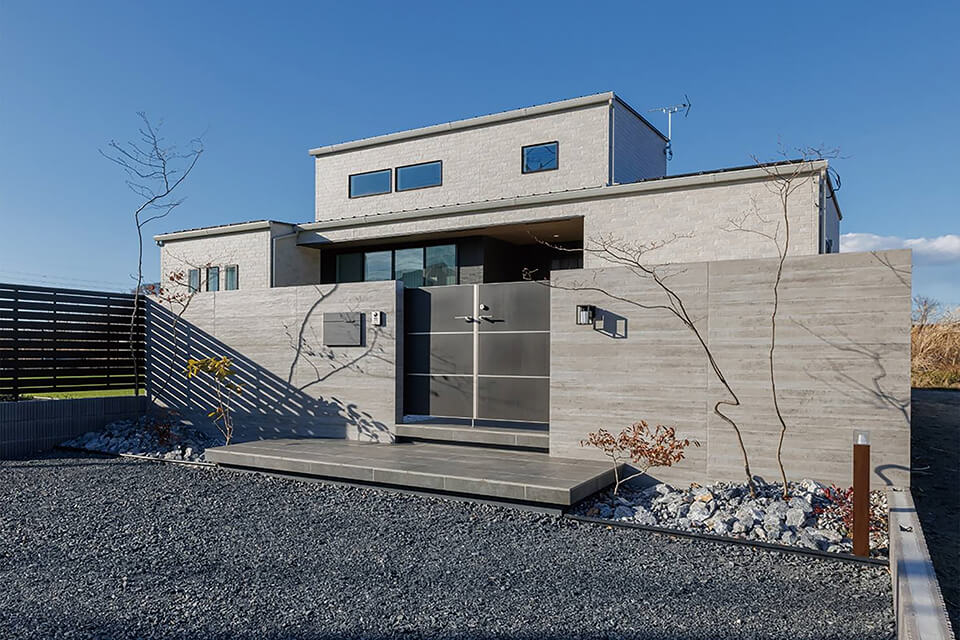 建物の外観とカラーに調和し、ブラックとブラウンを基調とした高級感あふれるファサード。2連の「ホームヤードルーフシステムライティングフェイス」が印象的で、立体感と奥行きを見事に演出しています。表札部分には金属風の質感を持つ「エバーアートボード」のラスティコッパーを採用し、スタイリッシュで洗練された雰囲気をプラス。さらに、奥のフレームには「アクセントパネル」を組み合わせることで、オリジナリティあふれるデザインが実現され、おもてなしの空間としてのこだわりが感じられます。 フレームや「千本格子」を用いた縦格子フェンスは直線美を活かした構成で、モダンかつ洗練された空間を創り上げています。夜のシーンでは、家族や来客、そして道行く人々を魅了する暖かな光が灯り、心地よい空間を演出しています。