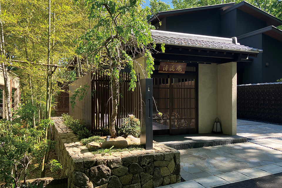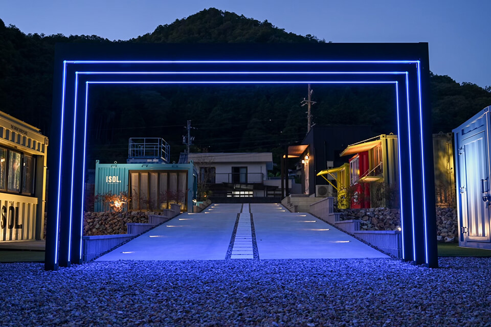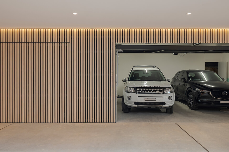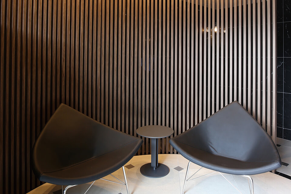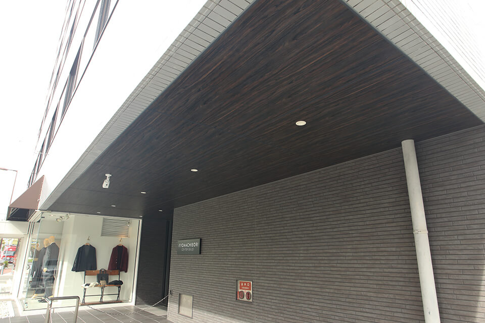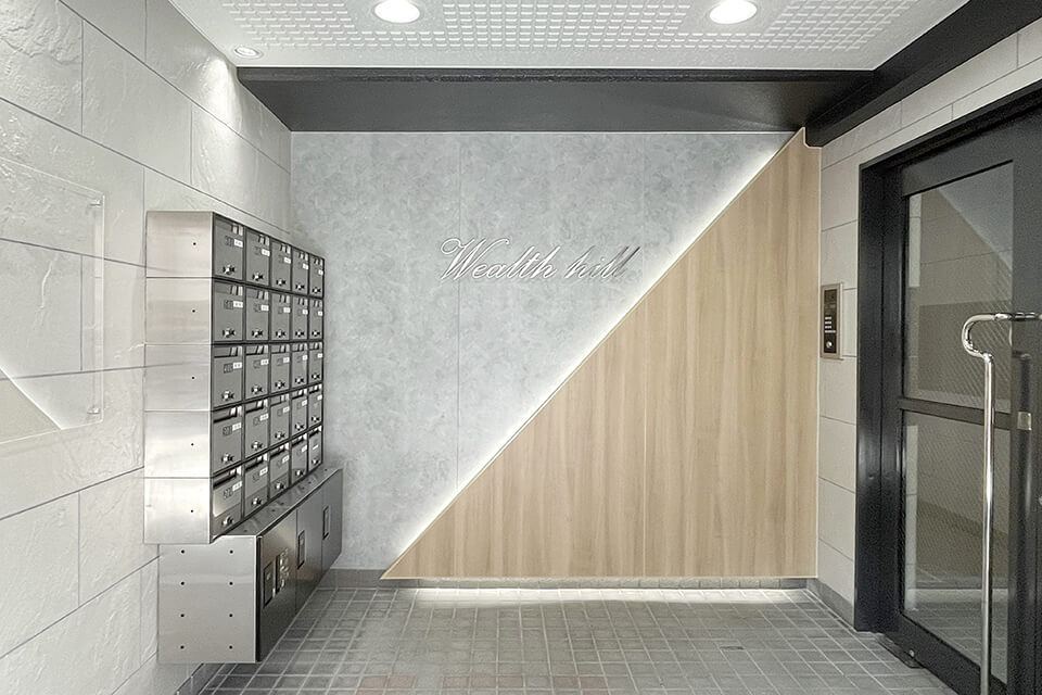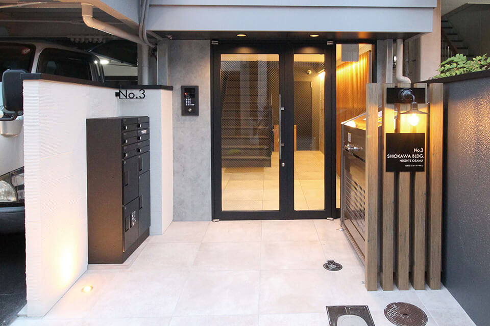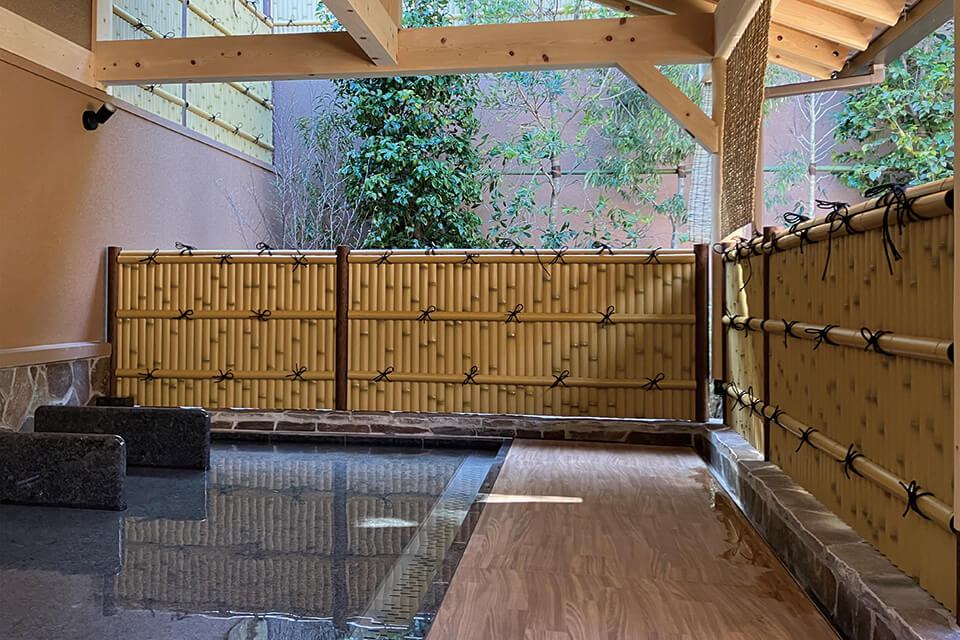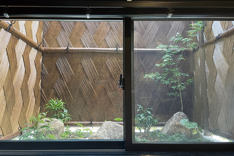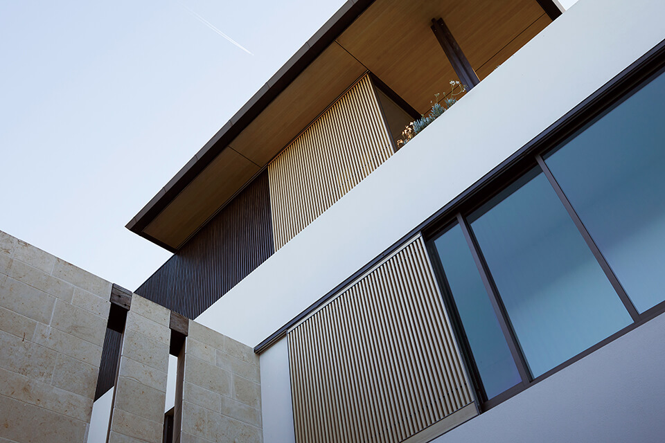 建物の外観とカラーに調和し、ブラックとブラウンを基調とした高級感あふれるファサード。2連の「ホームヤードルーフシステムライティングフェイス」が印象的で、立体感と奥行きを見事に演出しています。表札部分には金属風の質感を持つ「エバーアートボード」のラスティコッパーを採用し、スタイリッシュで洗練された雰囲気をプラス。さらに、奥のフレームには「アクセントパネル」を組み合わせることで、オリジナリティあふれるデザインが実現され、おもてなしの空間としてのこだわりが感じられます。 フレームや「千本格子」を用いた縦格子フェンスは直線美を活かした構成で、モダンかつ洗練された空間を創り上げています。夜のシーンでは、家族や来客、そして道行く人々を魅了する暖かな光が灯り、心地よい空間を演出しています。