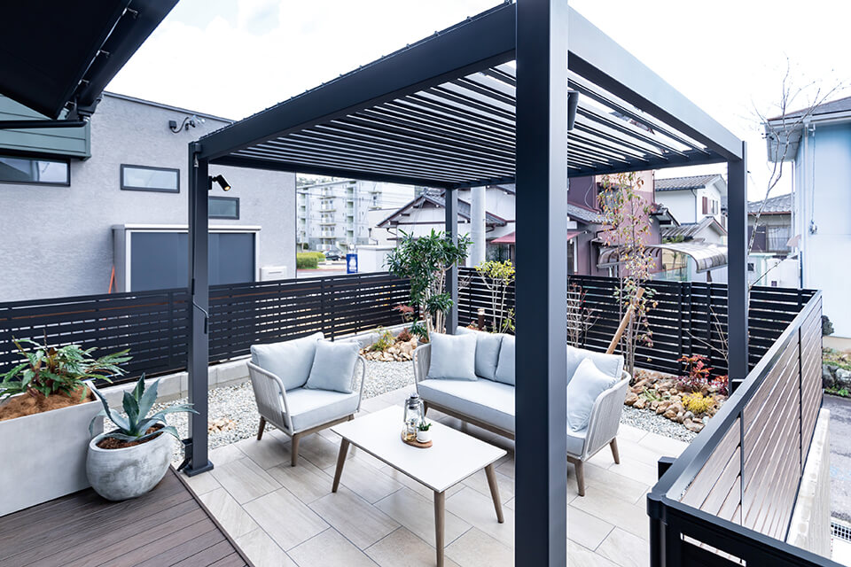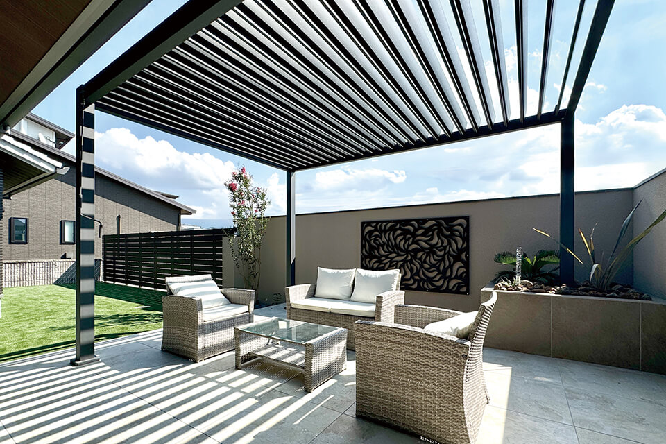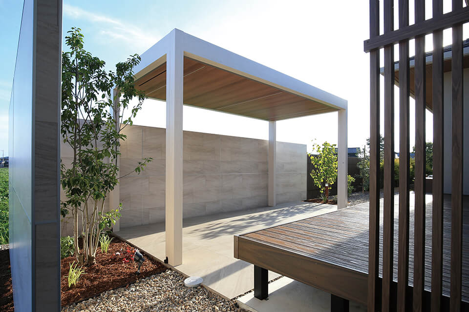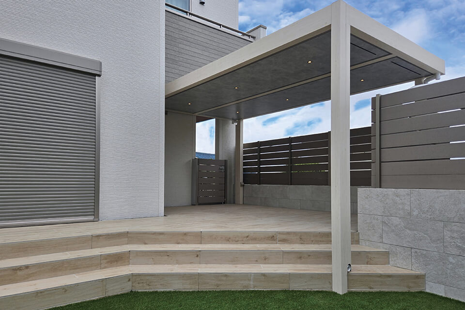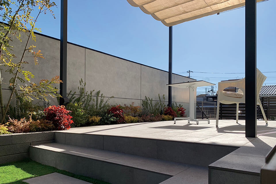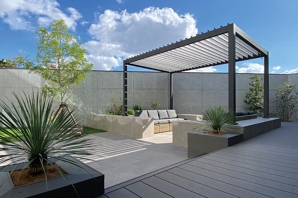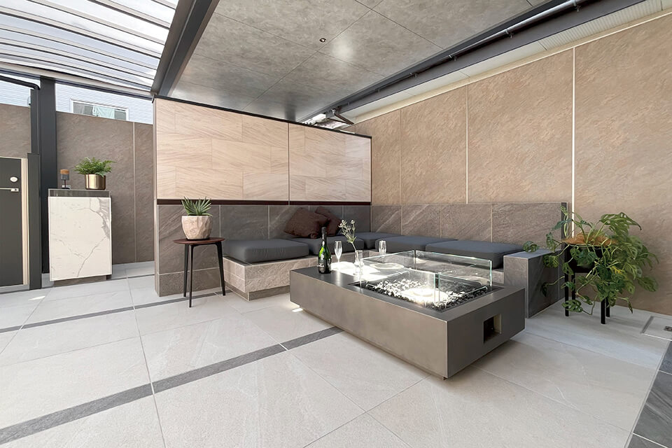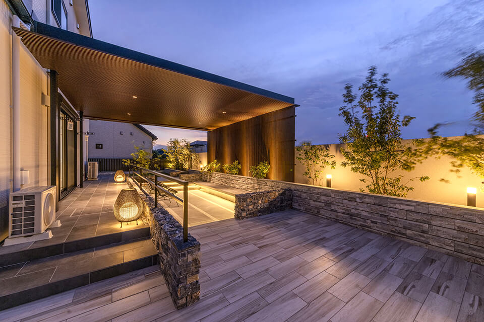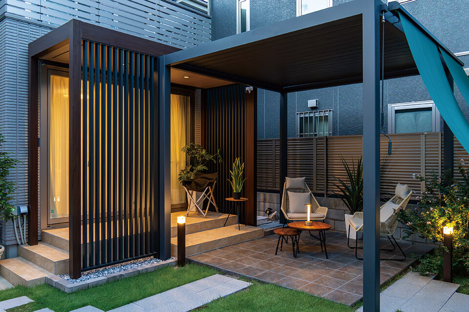 豊かな植栽とモダンデザインが見事に融合したアウトドアリビング。リフォーム前は日差しが気になり、ウッドデッキを活用できておりませんでしたが、「ポーチスカイルーフ」のテラスを採用されたことで、屋根のルーバーを開閉でき、季節や天候に合わせて心地よく過ごせるお庭に生まれ変わりました。造作ベンチと花壇の部分には「モーディカ」のタイルを使用。グレージュのカラーが自然と調和し、いつまでも美しく高級感のあるデザインが楽しめます。昼は柔らかな日差しの中で心地よく過ごし、夜はライトアップが生み出す幻想的な空間で癒される、まさに理想のリラクゼーションスポットです。