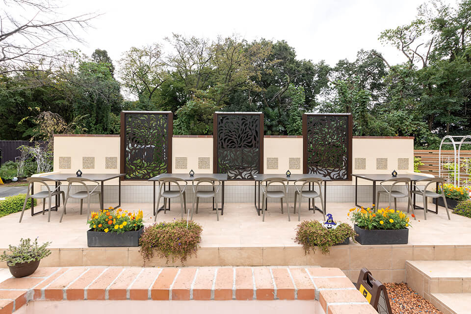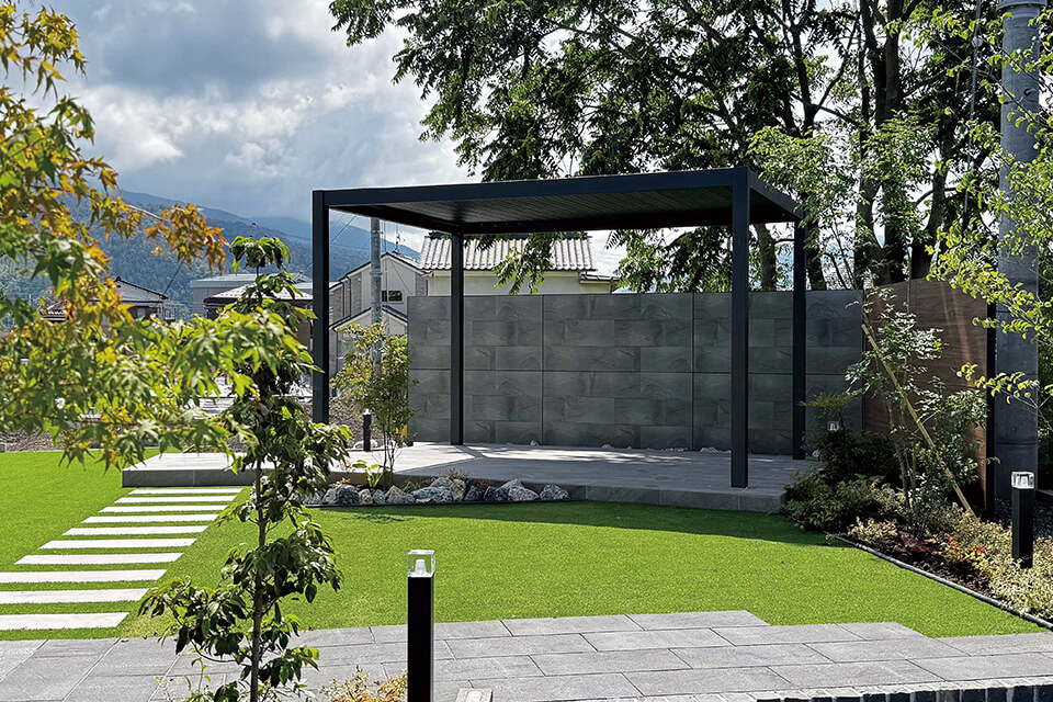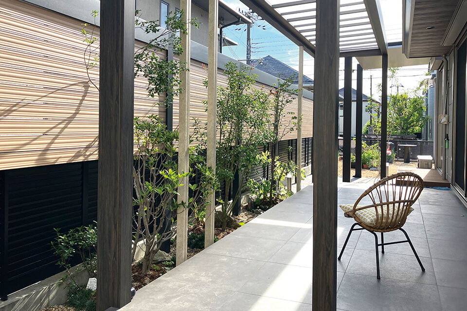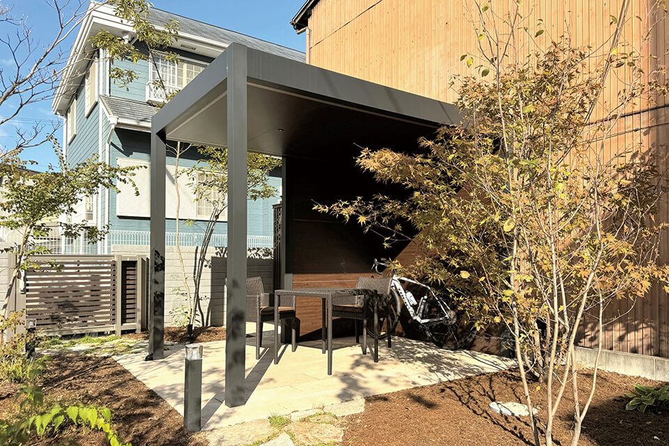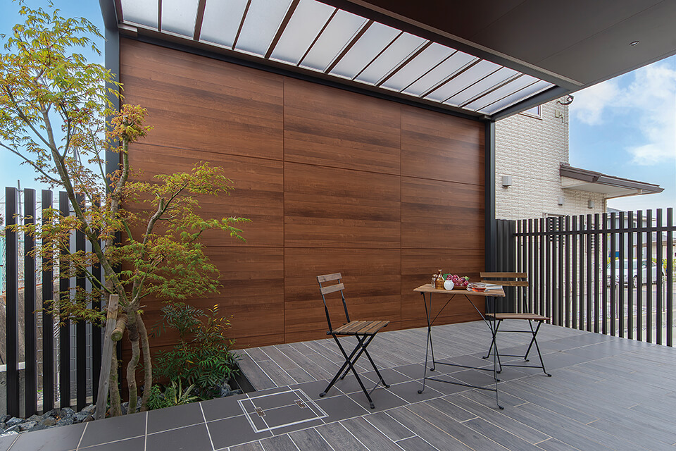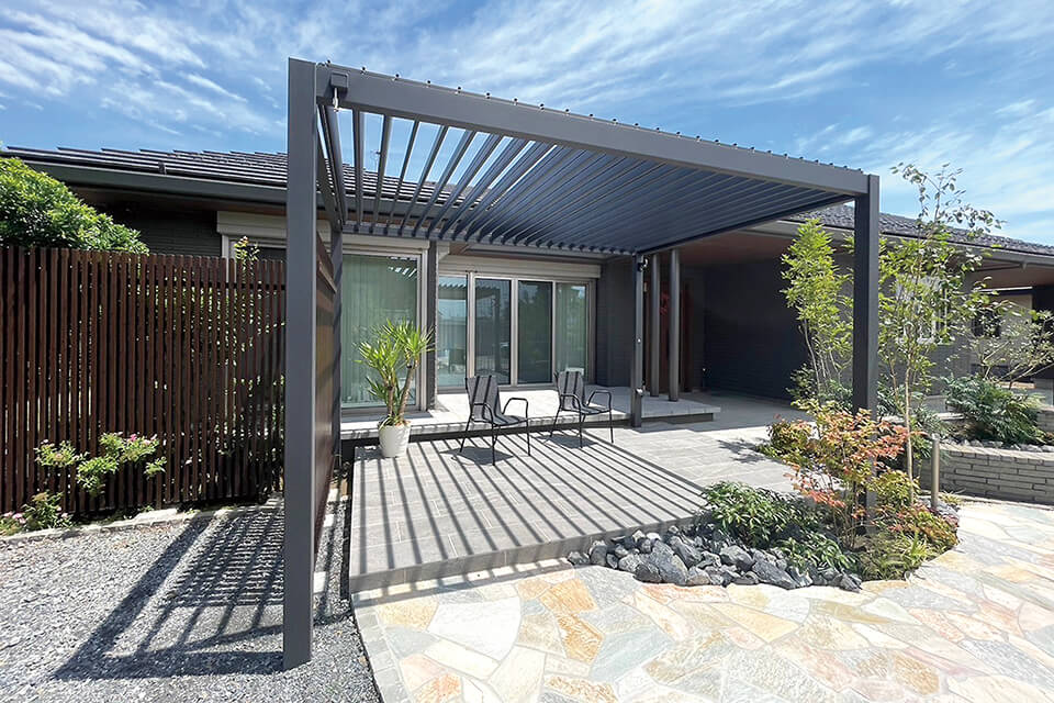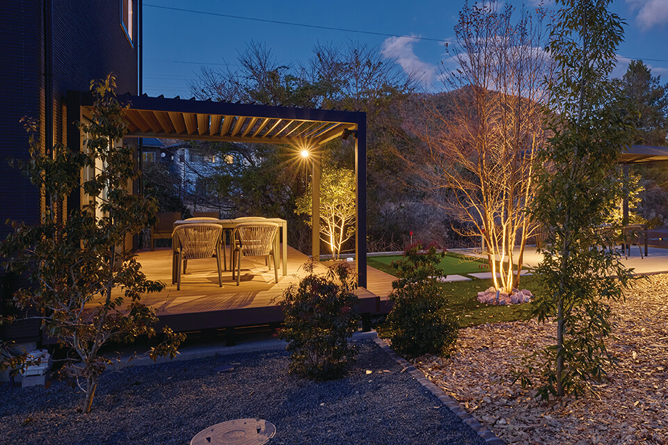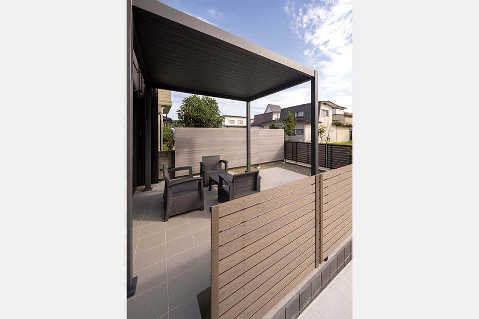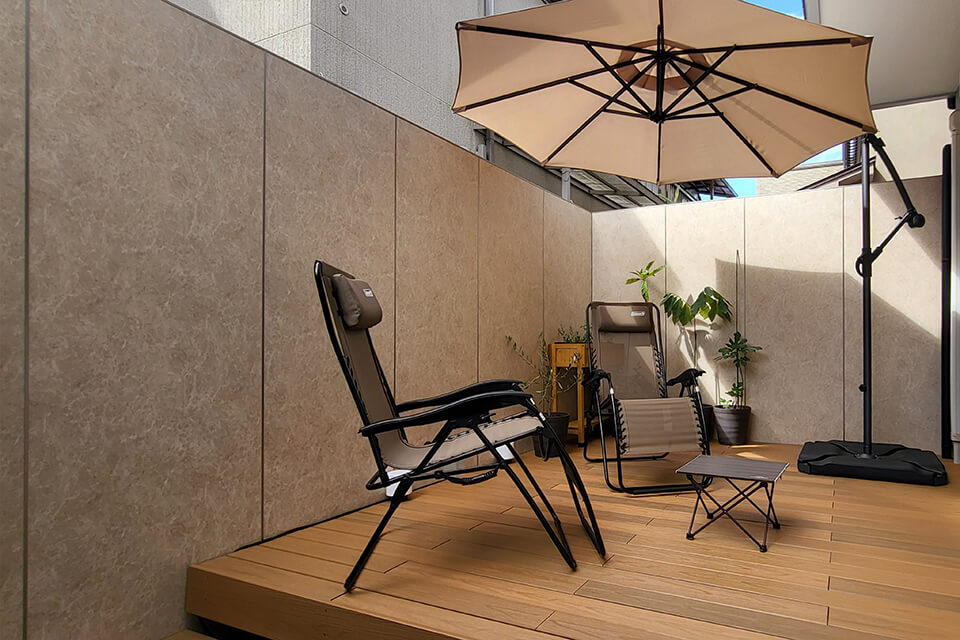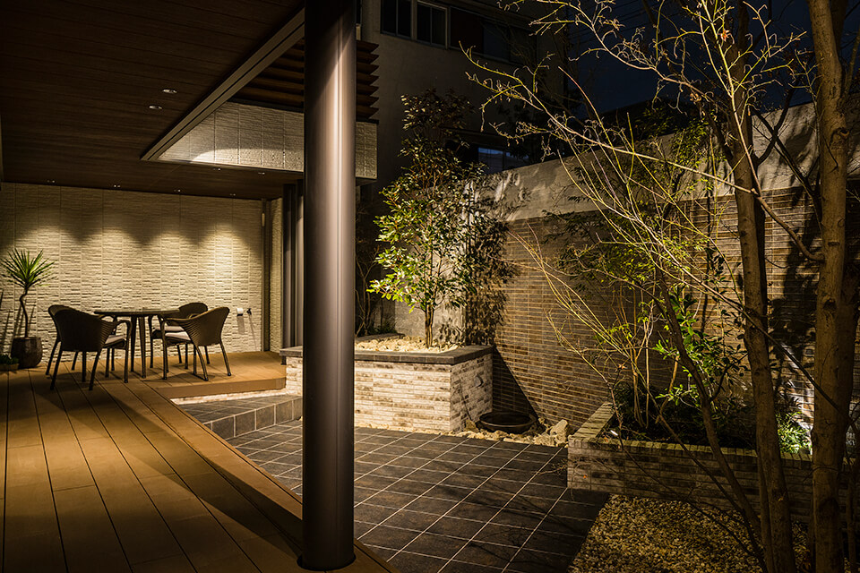 豊かな植栽とモダンデザインが見事に融合したアウトドアリビング。リフォーム前は日差しが気になり、ウッドデッキを活用できておりませんでしたが、「ポーチスカイルーフ」のテラスを採用されたことで、屋根のルーバーを開閉でき、季節や天候に合わせて心地よく過ごせるお庭に生まれ変わりました。造作ベンチと花壇の部分には「モーディカ」のタイルを使用。グレージュのカラーが自然と調和し、いつまでも美しく高級感のあるデザインが楽しめます。昼は柔らかな日差しの中で心地よく過ごし、夜はライトアップが生み出す幻想的な空間で癒される、まさに理想のリラクゼーションスポットです。