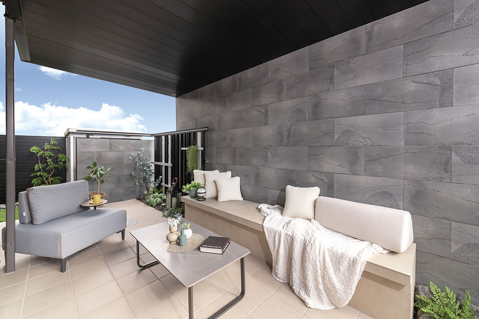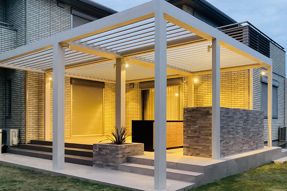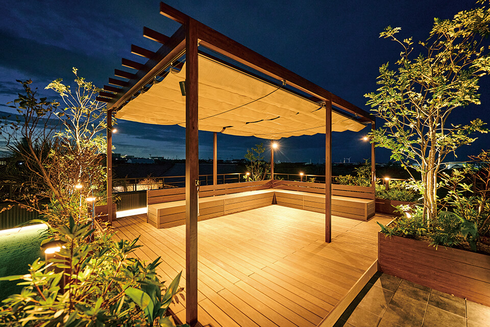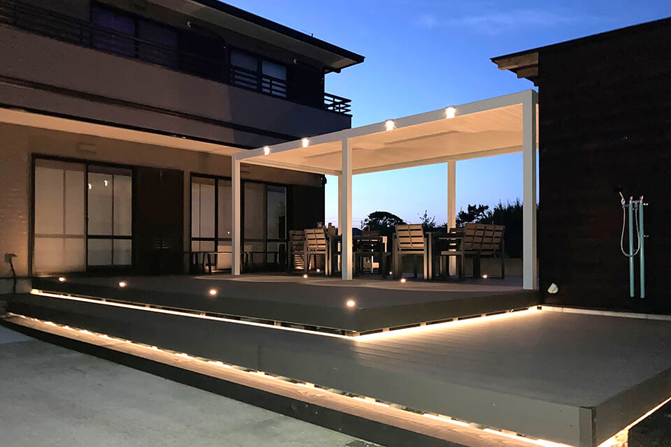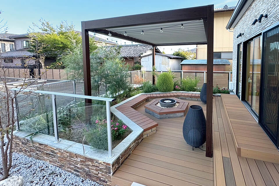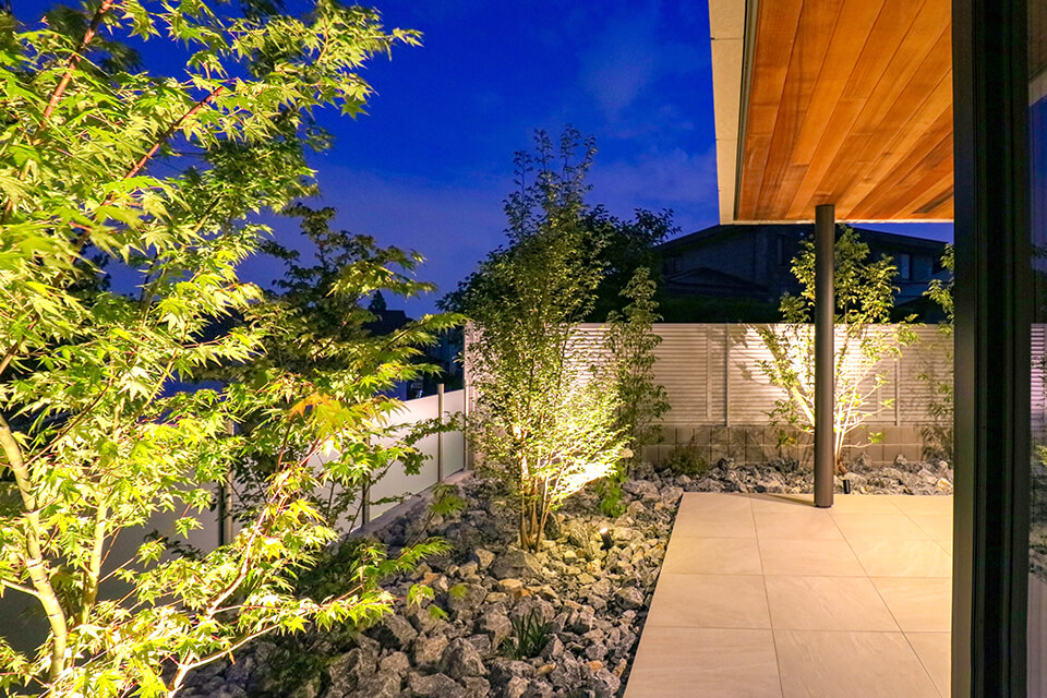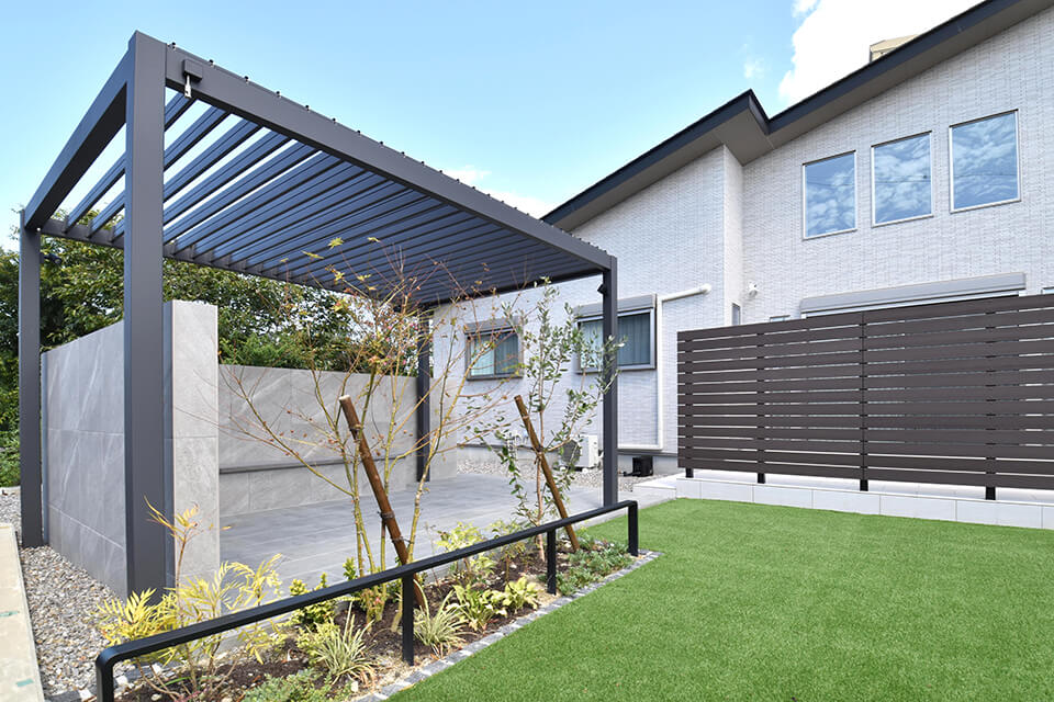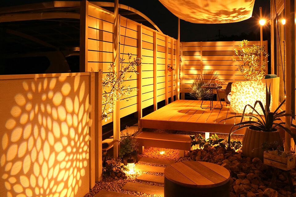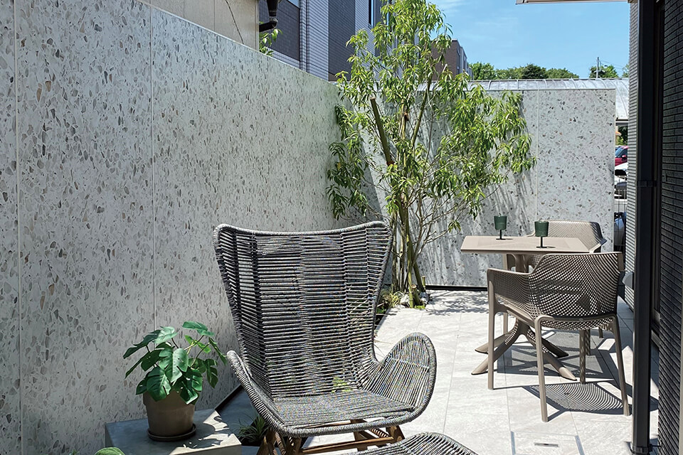 豊かな植栽とモダンデザインが見事に融合したアウトドアリビング。リフォーム前は日差しが気になり、ウッドデッキを活用できておりませんでしたが、「ポーチスカイルーフ」のテラスを採用されたことで、屋根のルーバーを開閉でき、季節や天候に合わせて心地よく過ごせるお庭に生まれ変わりました。造作ベンチと花壇の部分には「モーディカ」のタイルを使用。グレージュのカラーが自然と調和し、いつまでも美しく高級感のあるデザインが楽しめます。昼は柔らかな日差しの中で心地よく過ごし、夜はライトアップが生み出す幻想的な空間で癒される、まさに理想のリラクゼーションスポットです。