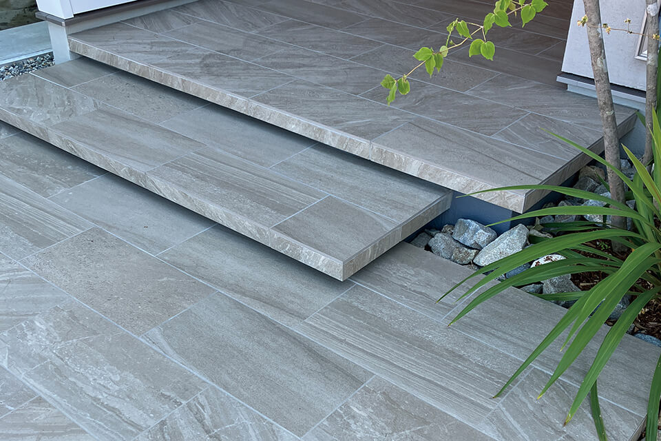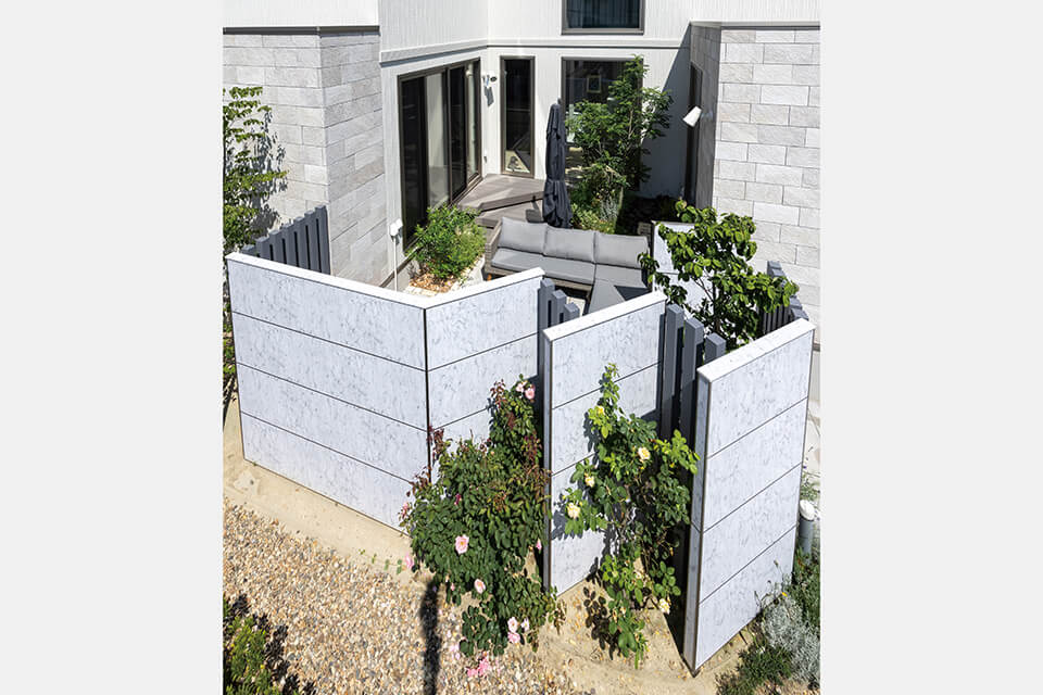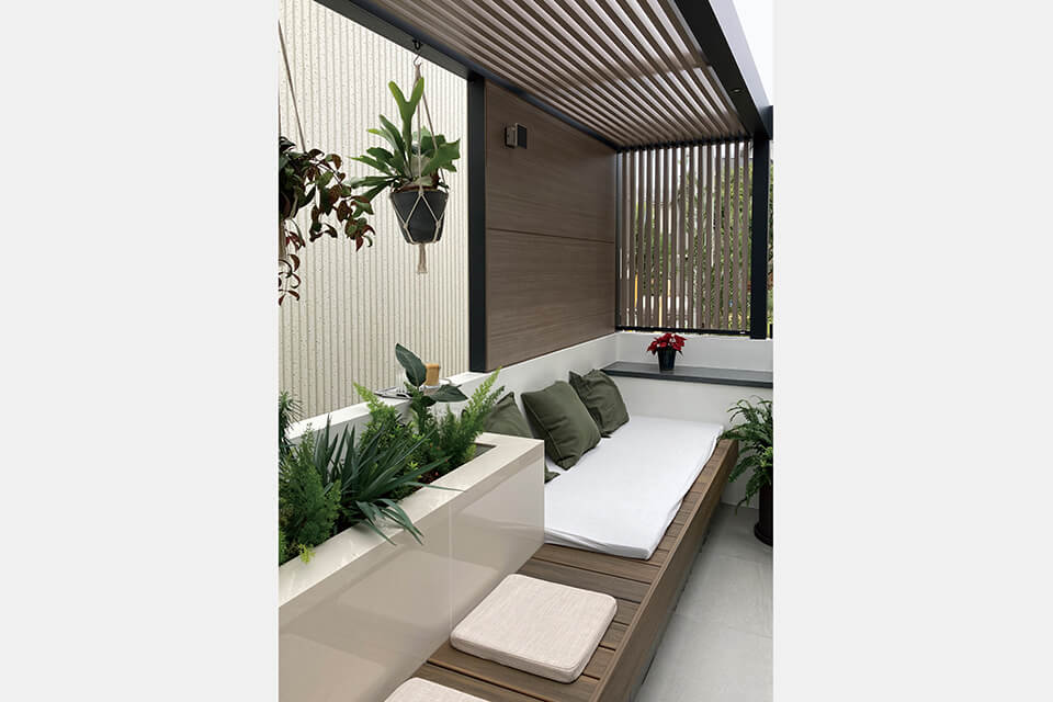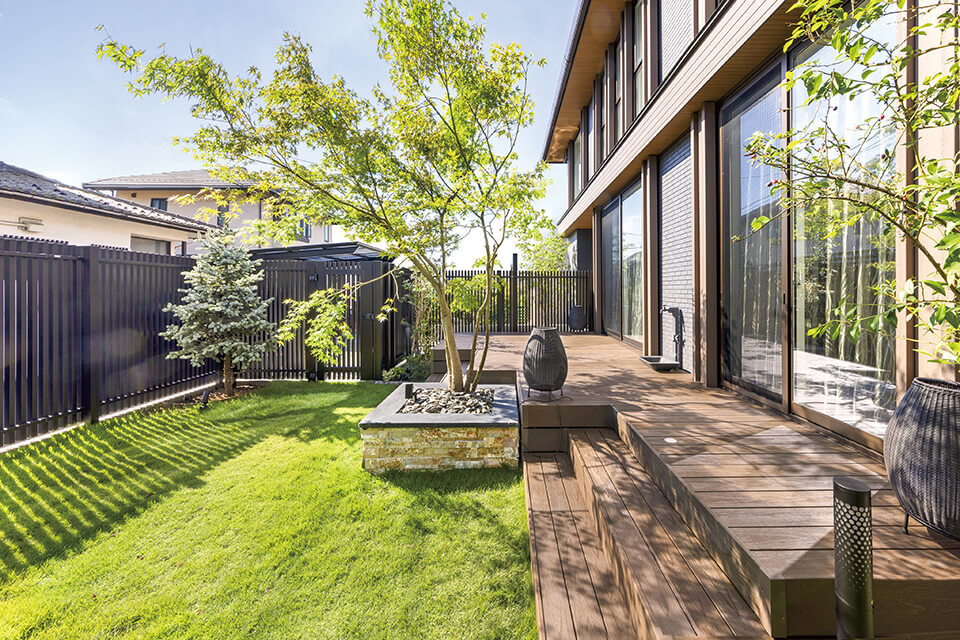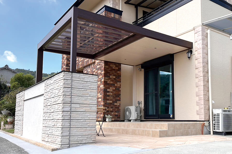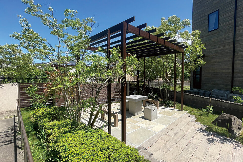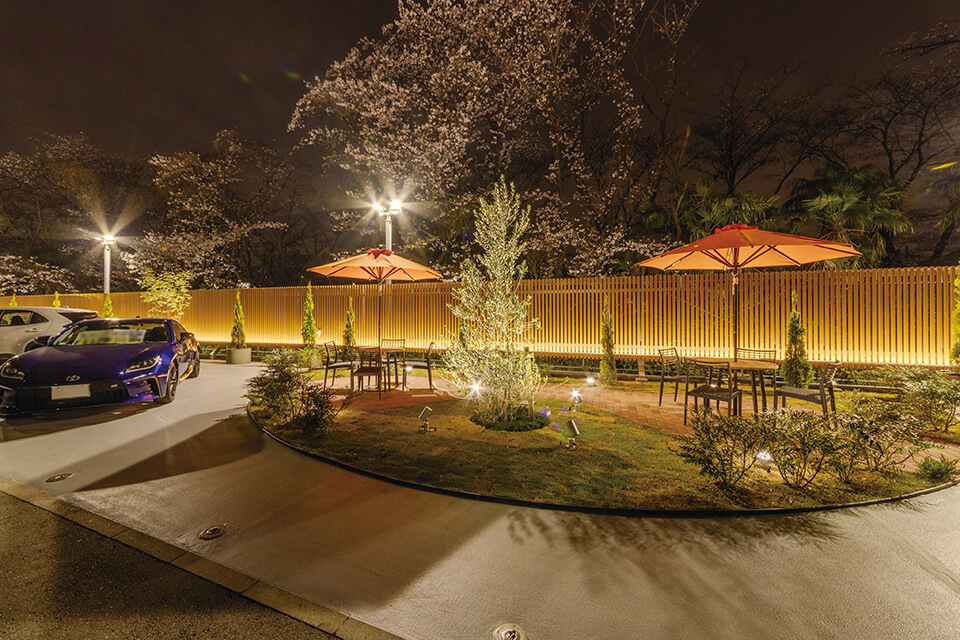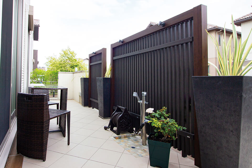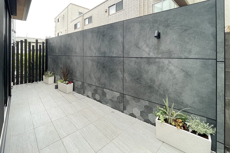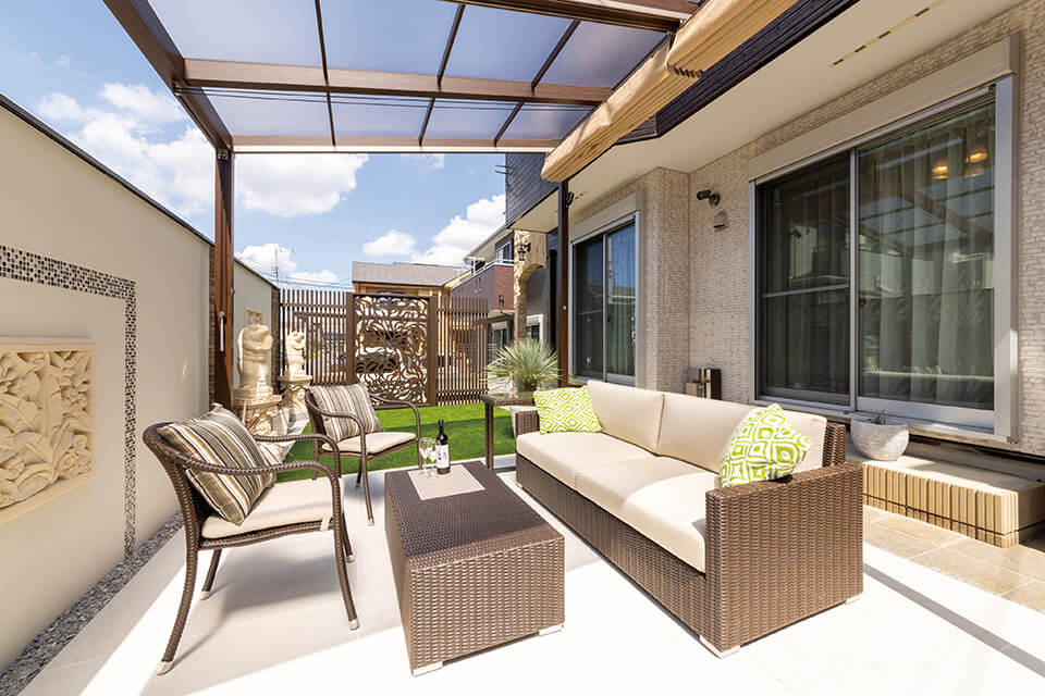 豊かな植栽とモダンデザインが見事に融合したアウトドアリビング。リフォーム前は日差しが気になり、ウッドデッキを活用できておりませんでしたが、「ポーチスカイルーフ」のテラスを採用されたことで、屋根のルーバーを開閉でき、季節や天候に合わせて心地よく過ごせるお庭に生まれ変わりました。造作ベンチと花壇の部分には「モーディカ」のタイルを使用。グレージュのカラーが自然と調和し、いつまでも美しく高級感のあるデザインが楽しめます。昼は柔らかな日差しの中で心地よく過ごし、夜はライトアップが生み出す幻想的な空間で癒される、まさに理想のリラクゼーションスポットです。