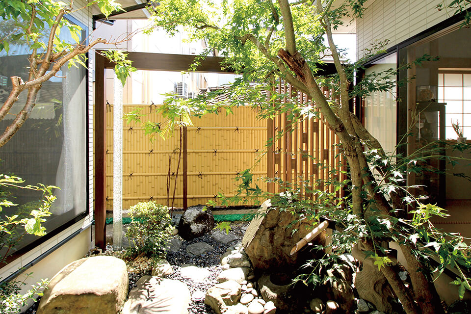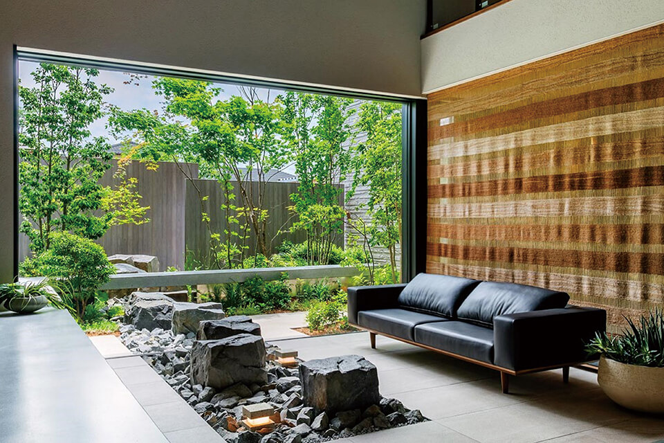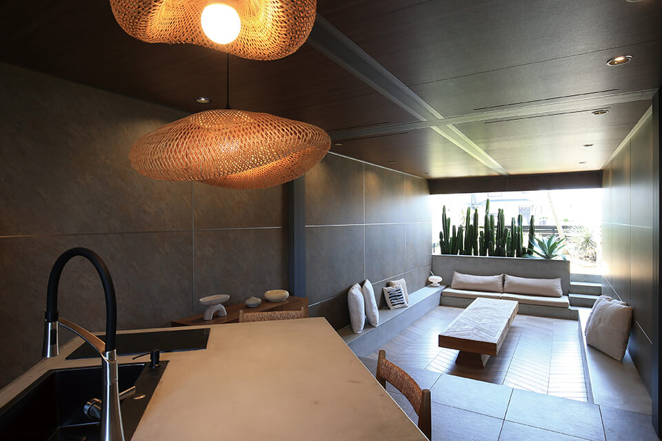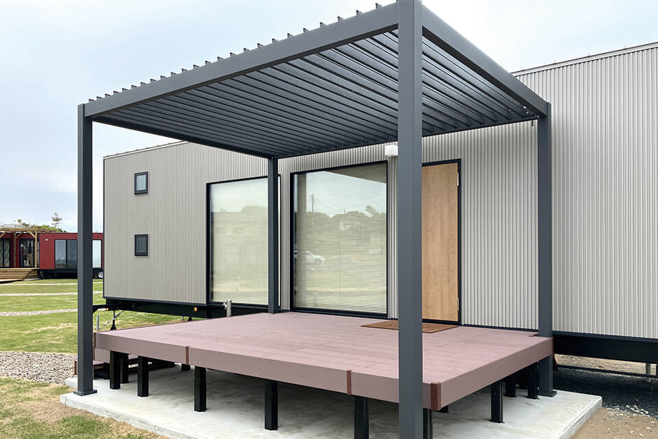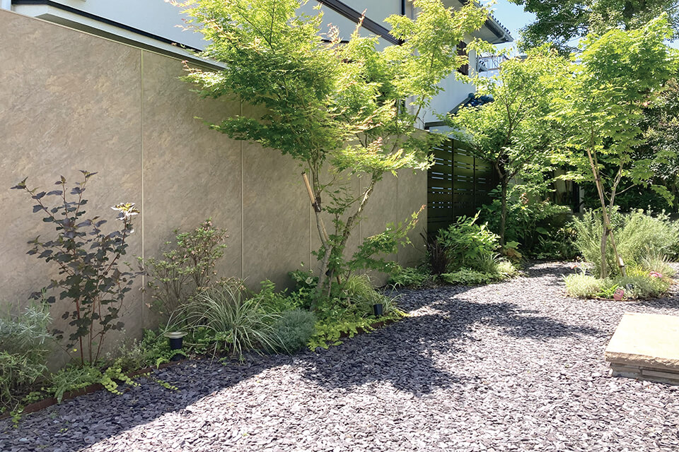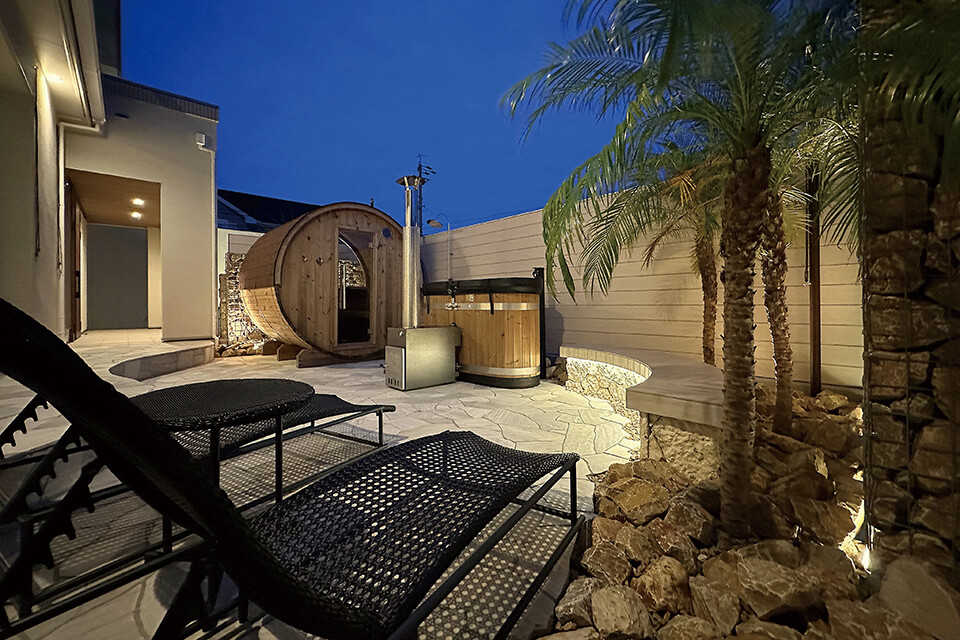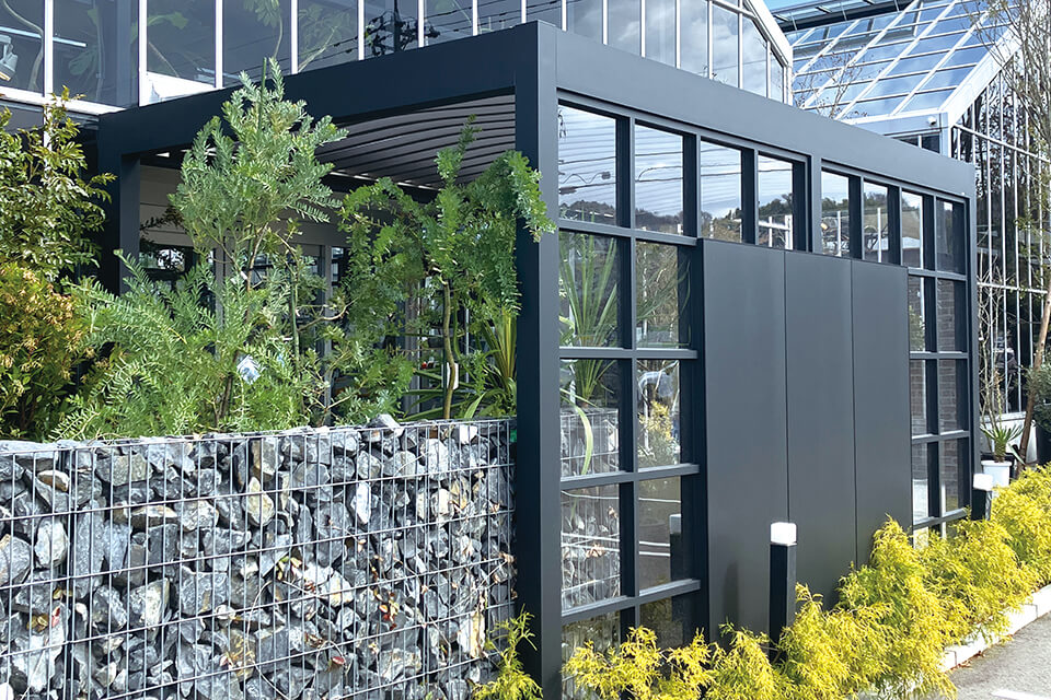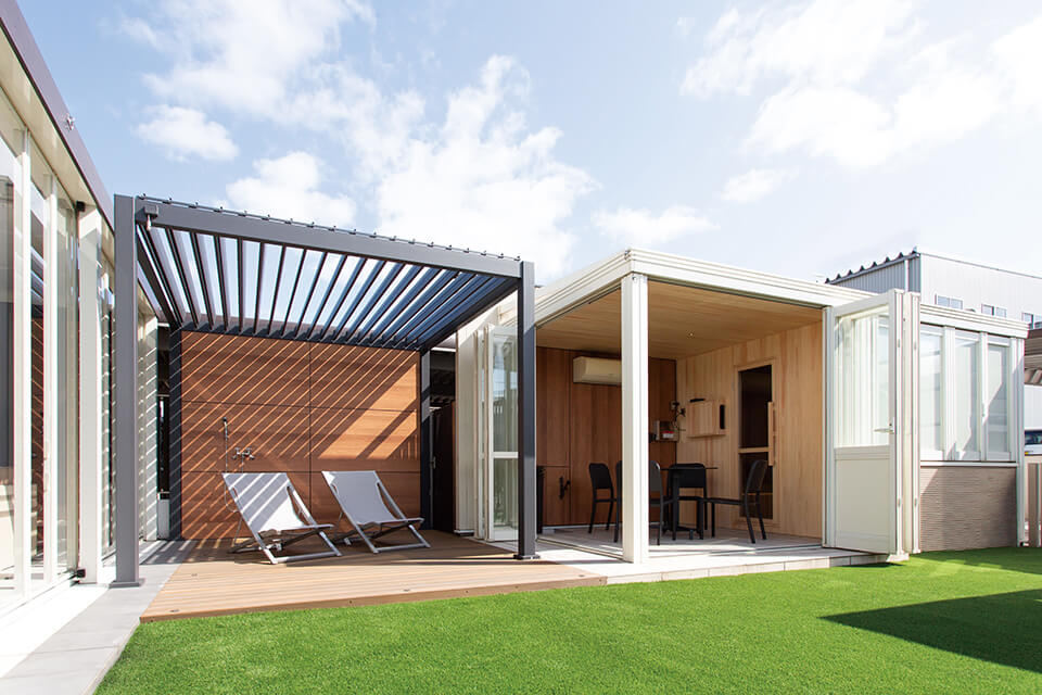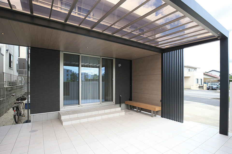 豊かな植栽とモダンデザインが見事に融合したアウトドアリビング。リフォーム前は日差しが気になり、ウッドデッキを活用できておりませんでしたが、「ポーチスカイルーフ」のテラスを採用されたことで、屋根のルーバーを開閉でき、季節や天候に合わせて心地よく過ごせるお庭に生まれ変わりました。造作ベンチと花壇の部分には「モーディカ」のタイルを使用。グレージュのカラーが自然と調和し、いつまでも美しく高級感のあるデザインが楽しめます。昼は柔らかな日差しの中で心地よく過ごし、夜はライトアップが生み出す幻想的な空間で癒される、まさに理想のリラクゼーションスポットです。
