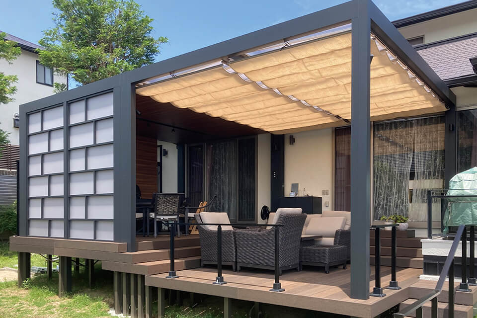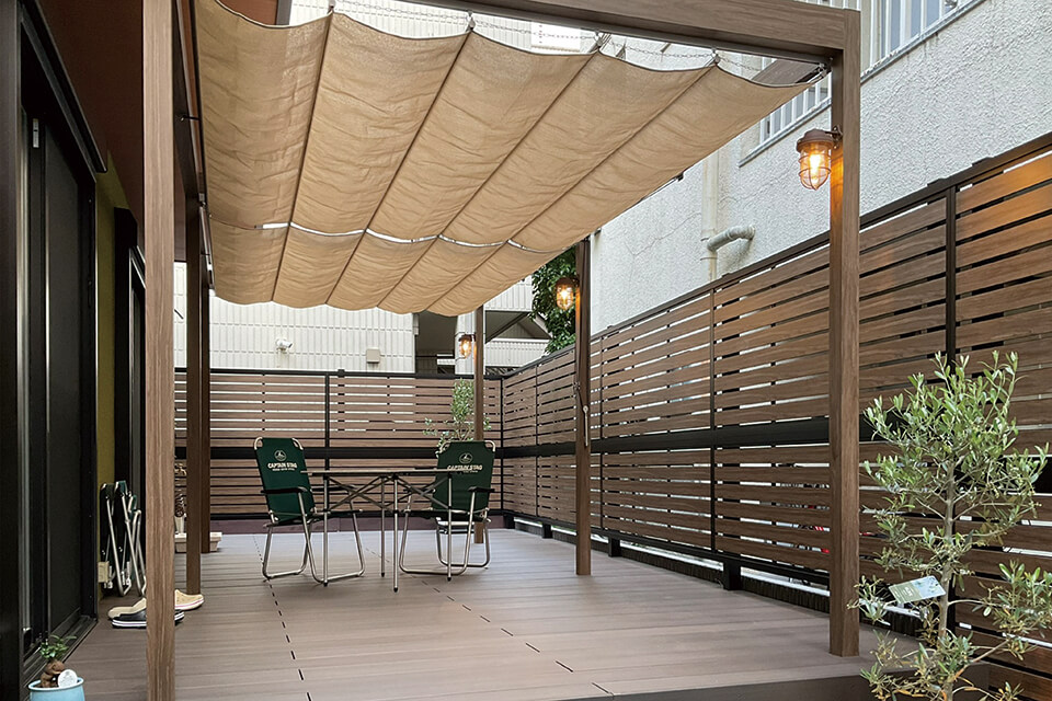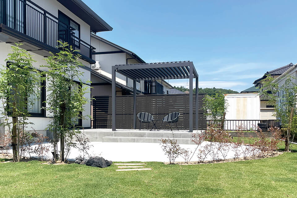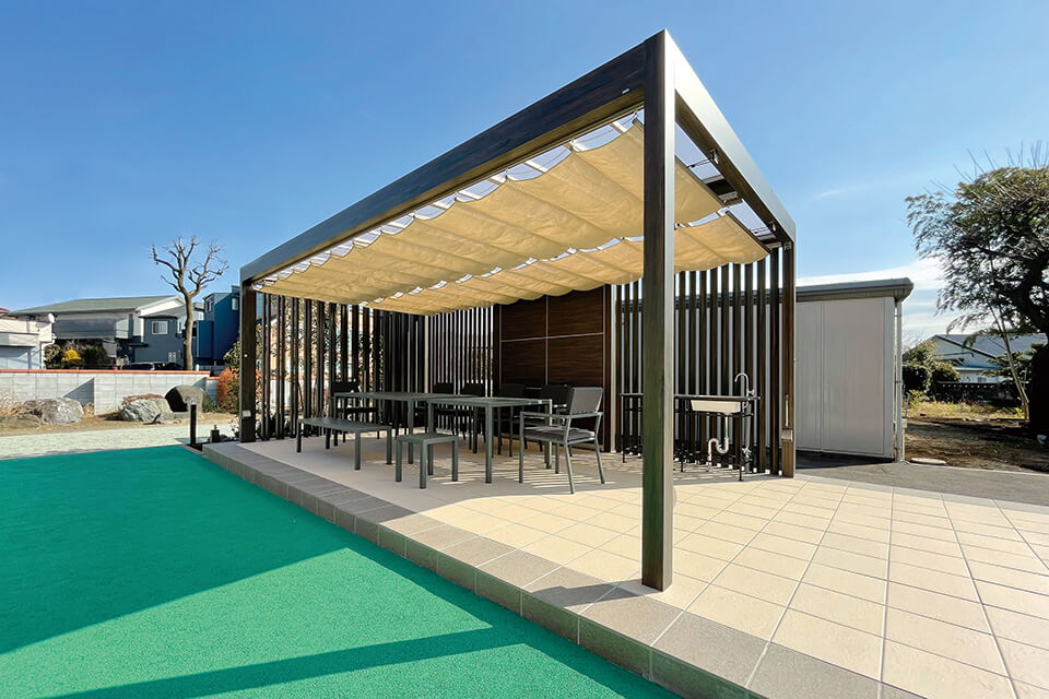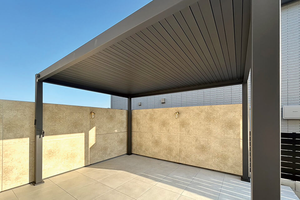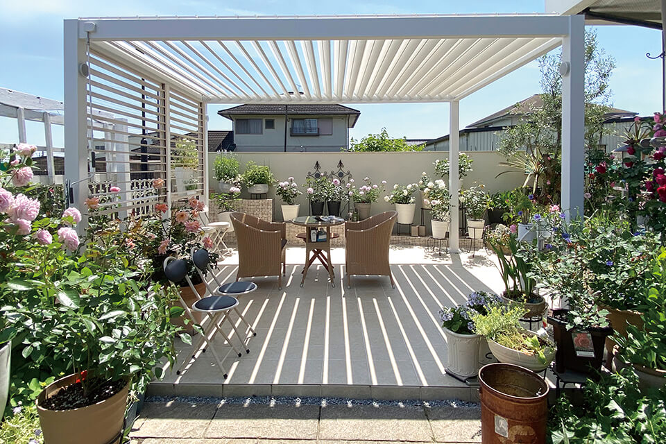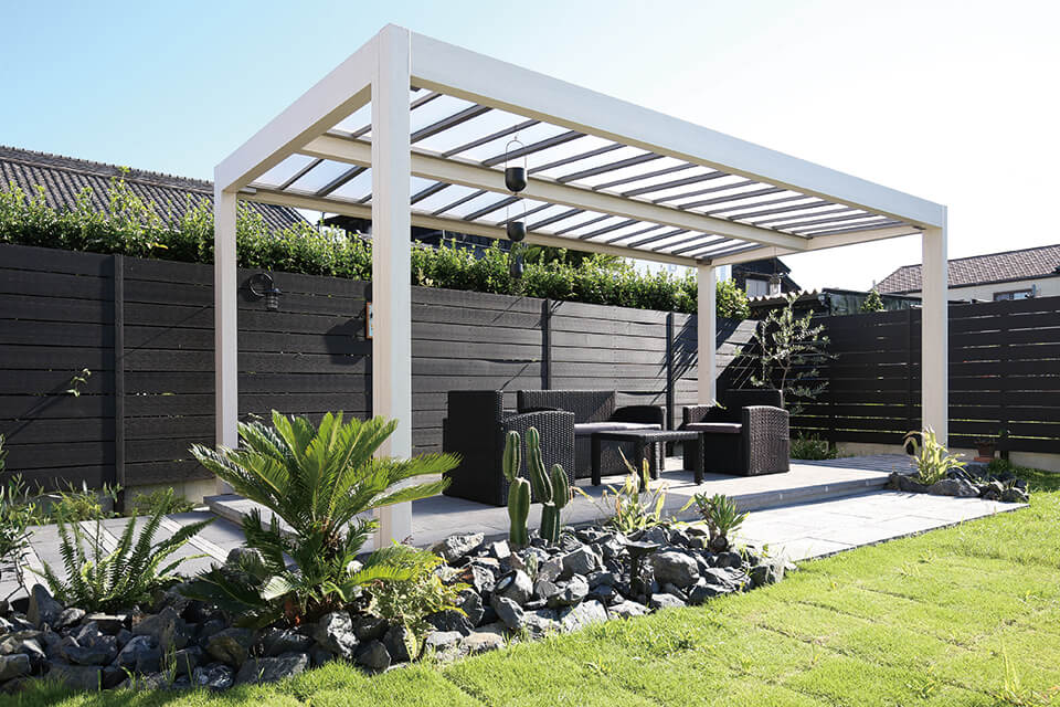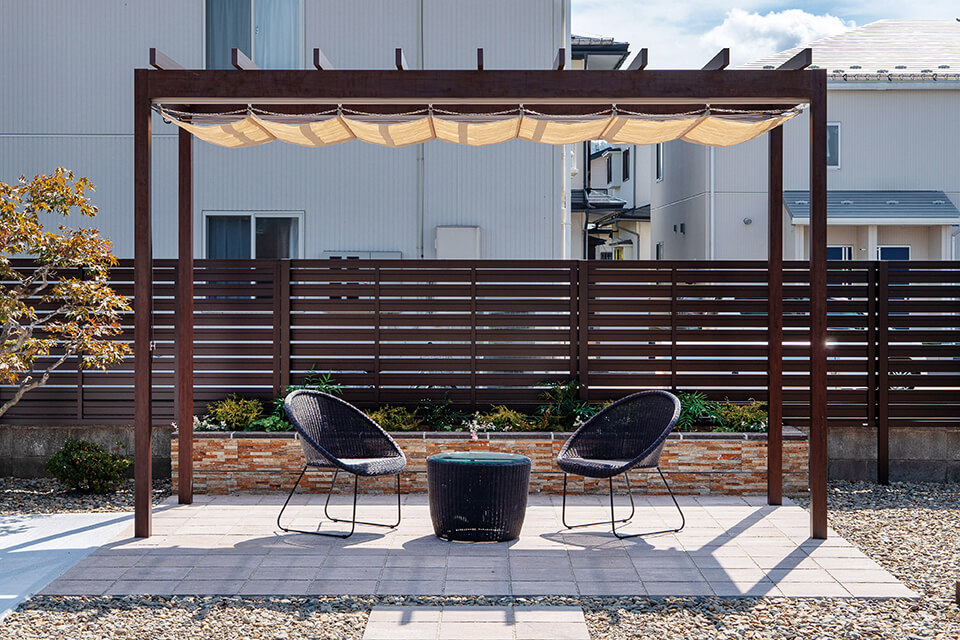 三角形の形状や庇がないことでお悩みだったお庭が「ホームヤードルーフシステム」によって快適に過ごせるお庭に生まれ変わりました。テラスの天井の半分に「エバーアートボード」を取り付けたことで、建物の庇の代わりになっています。もう半分は「ロープ式開閉シェード」にしたことで、必要に応じて開閉できる仕様に。これにより、テラス内には心地よい自然光が差し込み、リビングや屋外空間が明るく、開放的な雰囲気になります。実用性とデザイン性を兼ね備えたテラスは、お庭でのひとときをより豊かにし、家族やゲストが集まる魅力的なスペースとなりました。