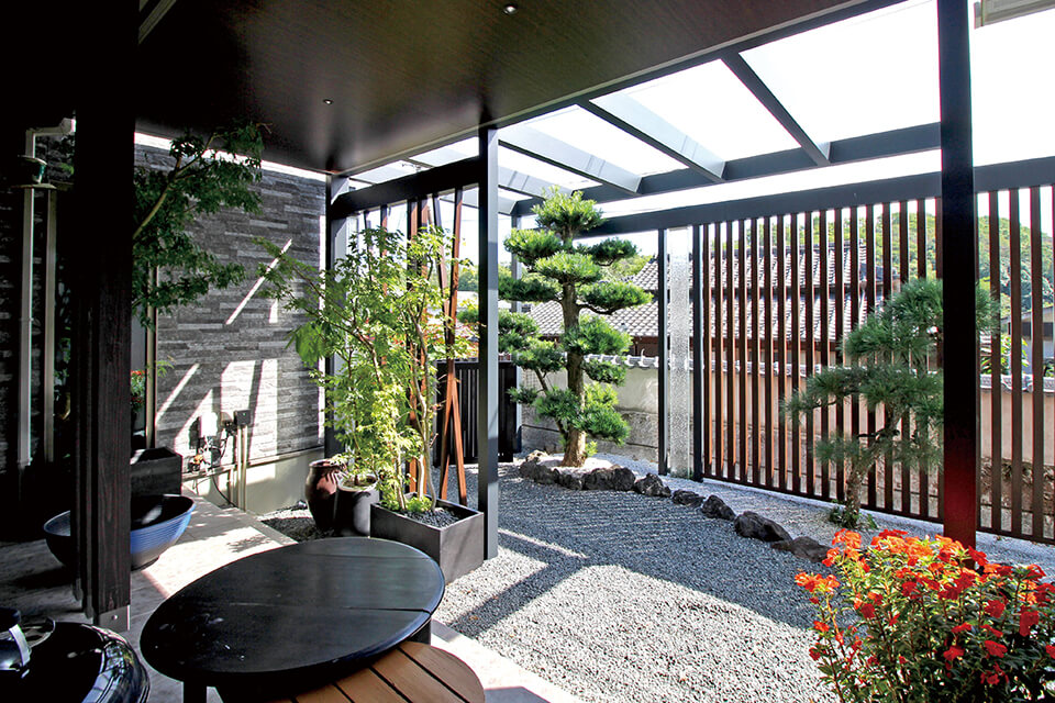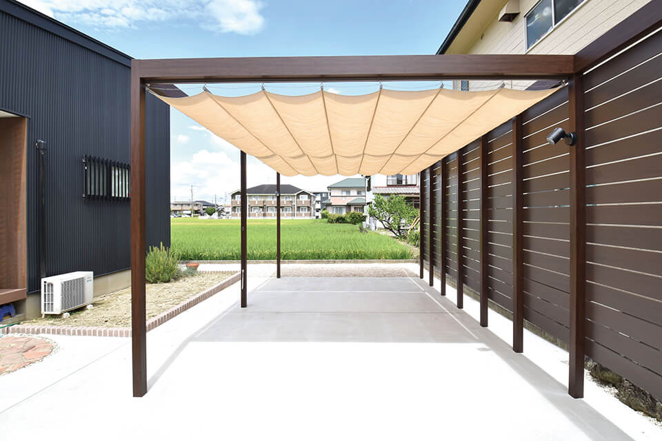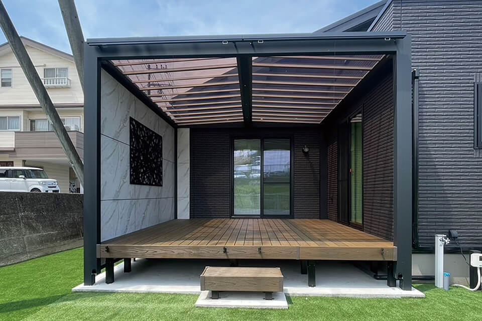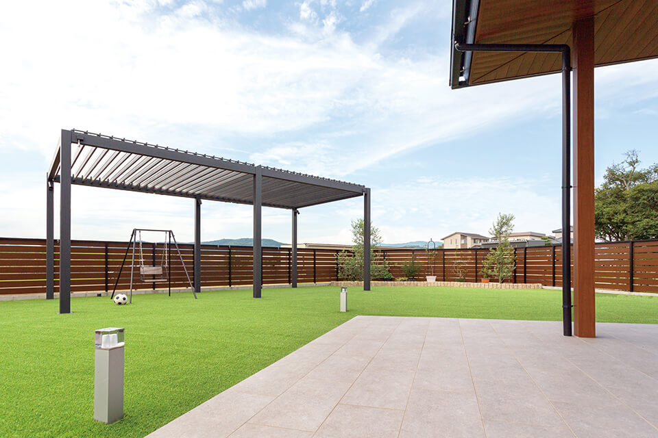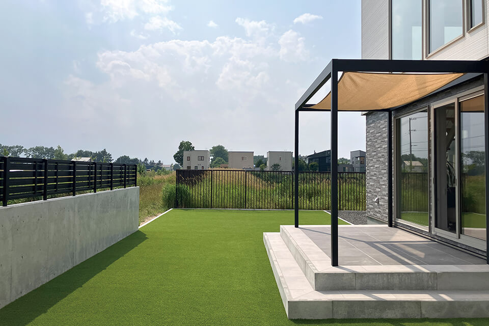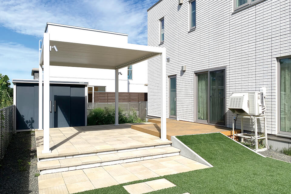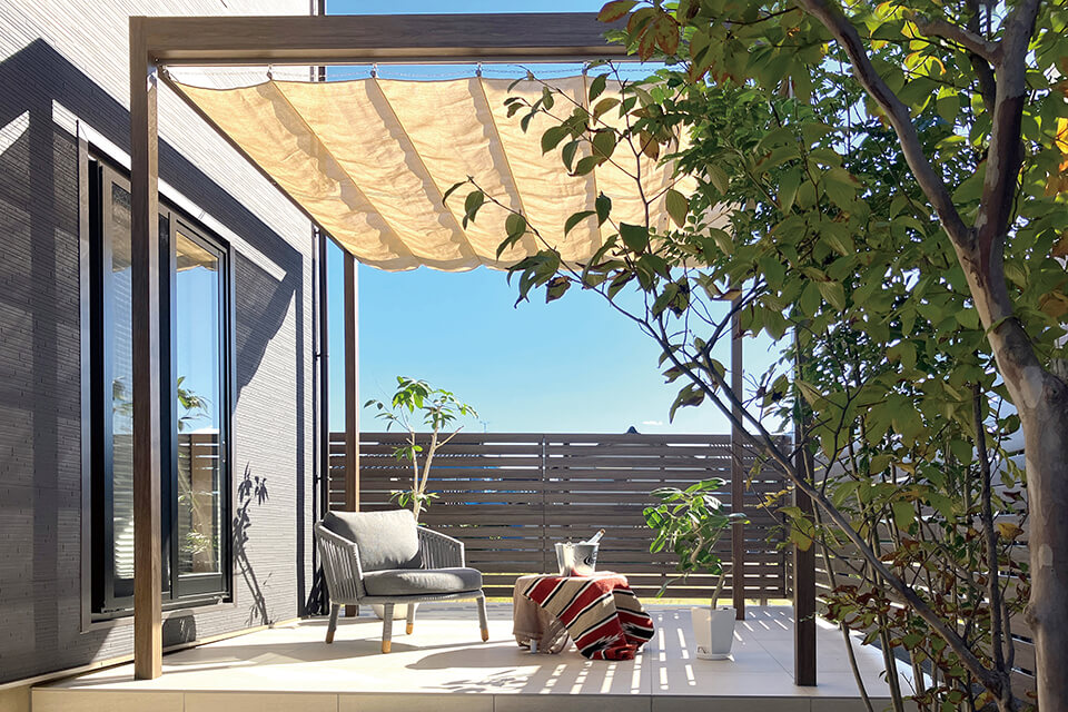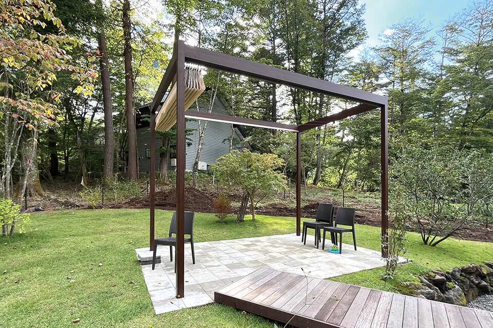 三角形の形状や庇がないことでお悩みだったお庭が「ホームヤードルーフシステム」によって快適に過ごせるお庭に生まれ変わりました。テラスの天井の半分に「エバーアートボード」を取り付けたことで、建物の庇の代わりになっています。もう半分は「ロープ式開閉シェード」にしたことで、必要に応じて開閉できる仕様に。これにより、テラス内には心地よい自然光が差し込み、リビングや屋外空間が明るく、開放的な雰囲気になります。実用性とデザイン性を兼ね備えたテラスは、お庭でのひとときをより豊かにし、家族やゲストが集まる魅力的なスペースとなりました。