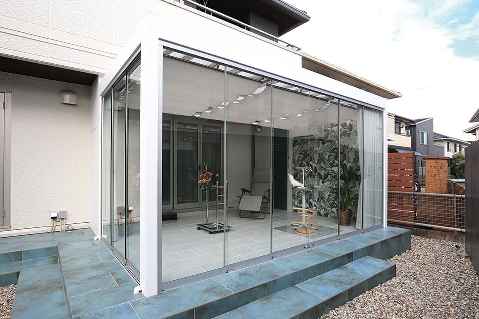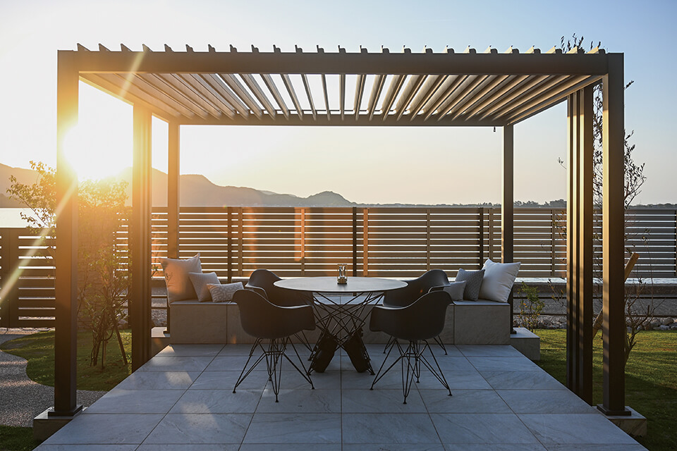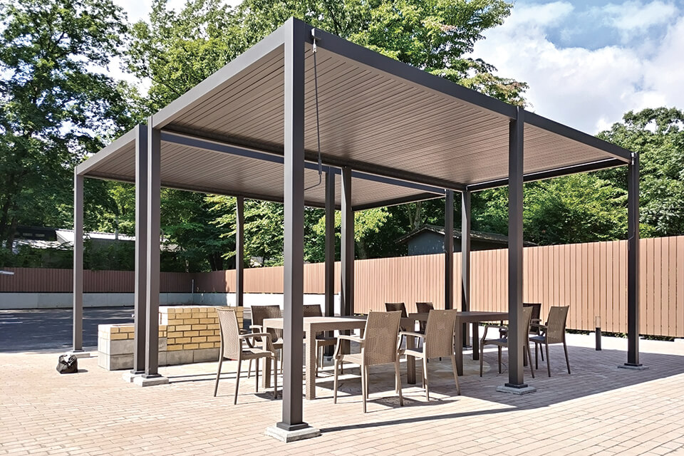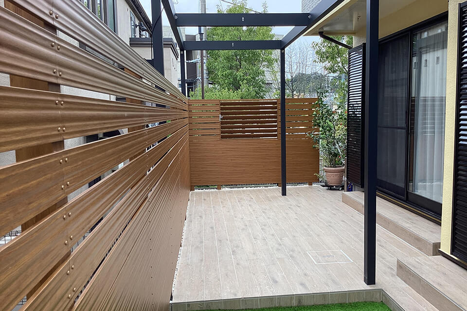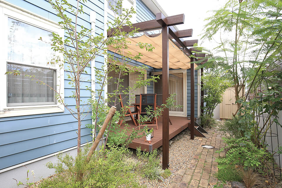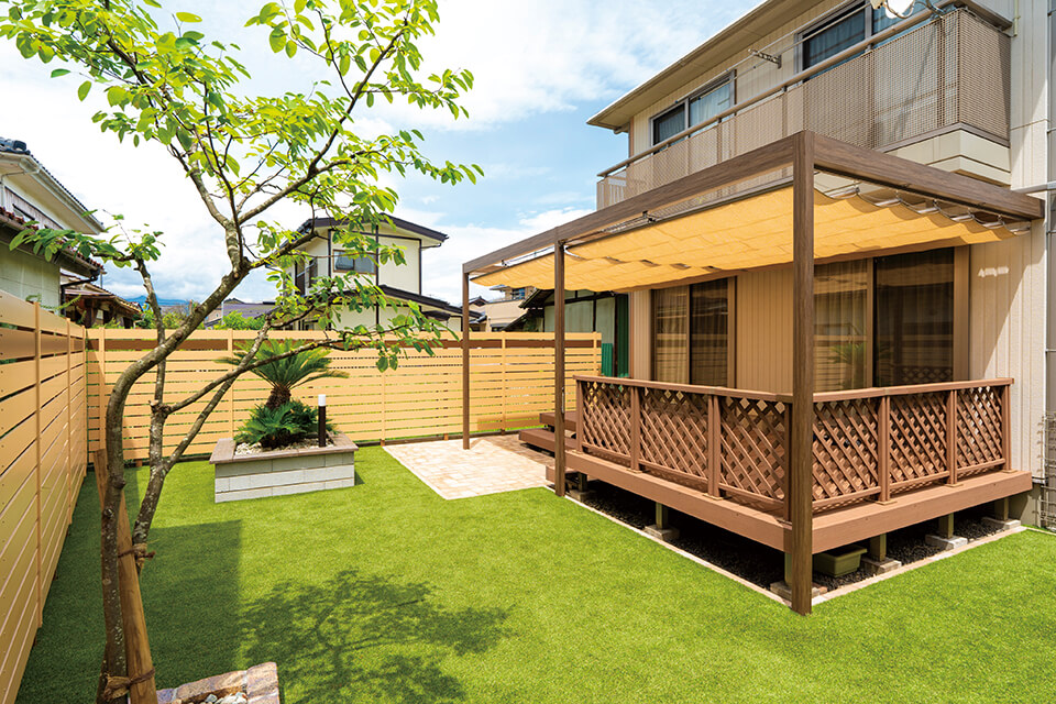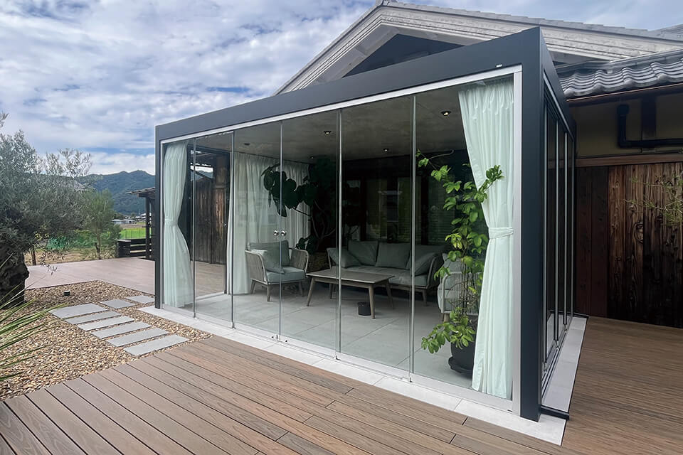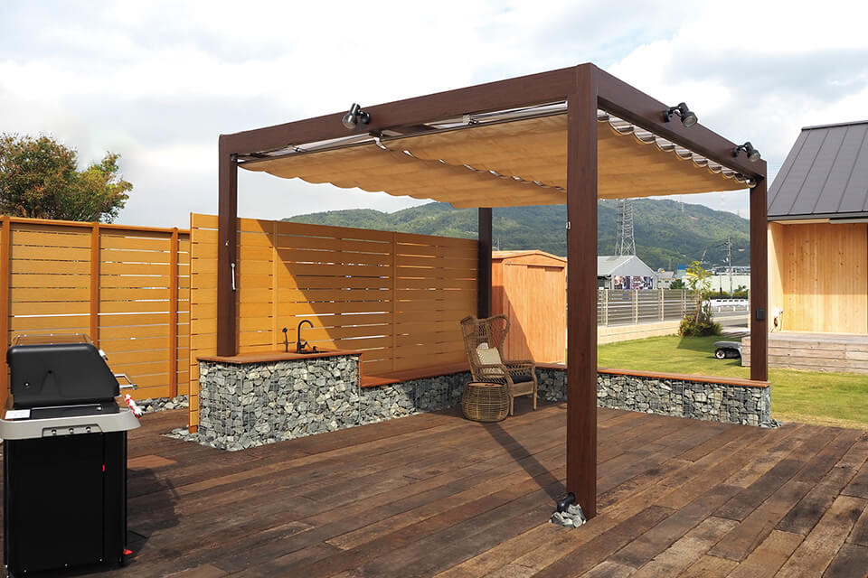 三角形の形状や庇がないことでお悩みだったお庭が「ホームヤードルーフシステム」によって快適に過ごせるお庭に生まれ変わりました。テラスの天井の半分に「エバーアートボード」を取り付けたことで、建物の庇の代わりになっています。もう半分は「ロープ式開閉シェード」にしたことで、必要に応じて開閉できる仕様に。これにより、テラス内には心地よい自然光が差し込み、リビングや屋外空間が明るく、開放的な雰囲気になります。実用性とデザイン性を兼ね備えたテラスは、お庭でのひとときをより豊かにし、家族やゲストが集まる魅力的なスペースとなりました。