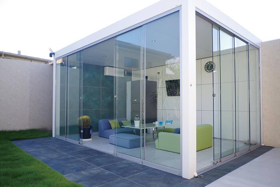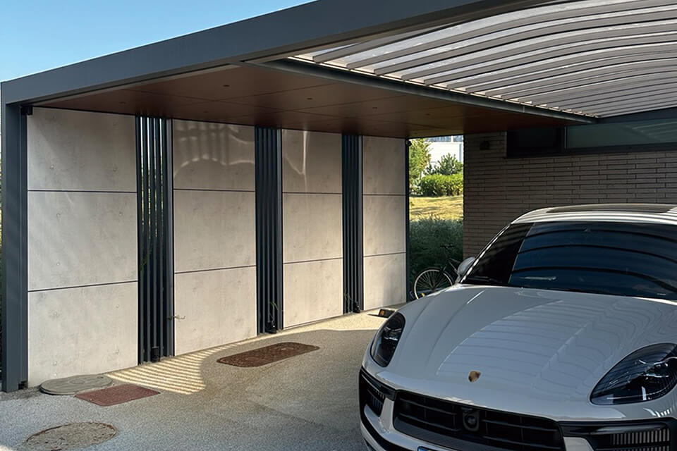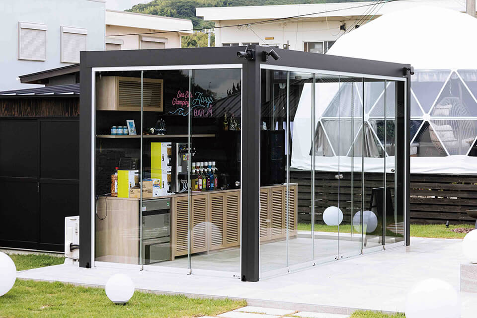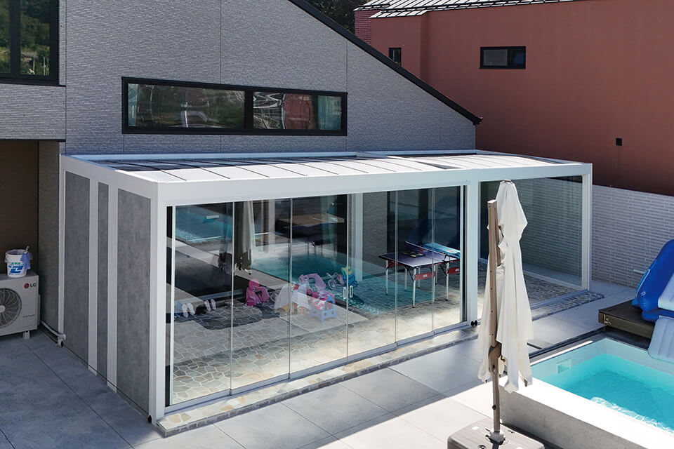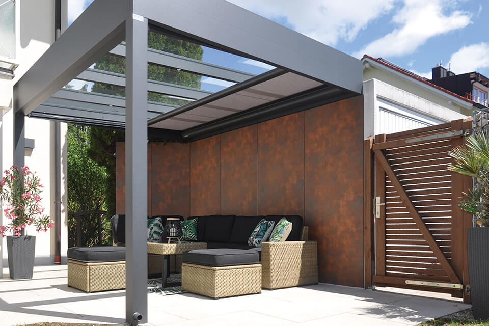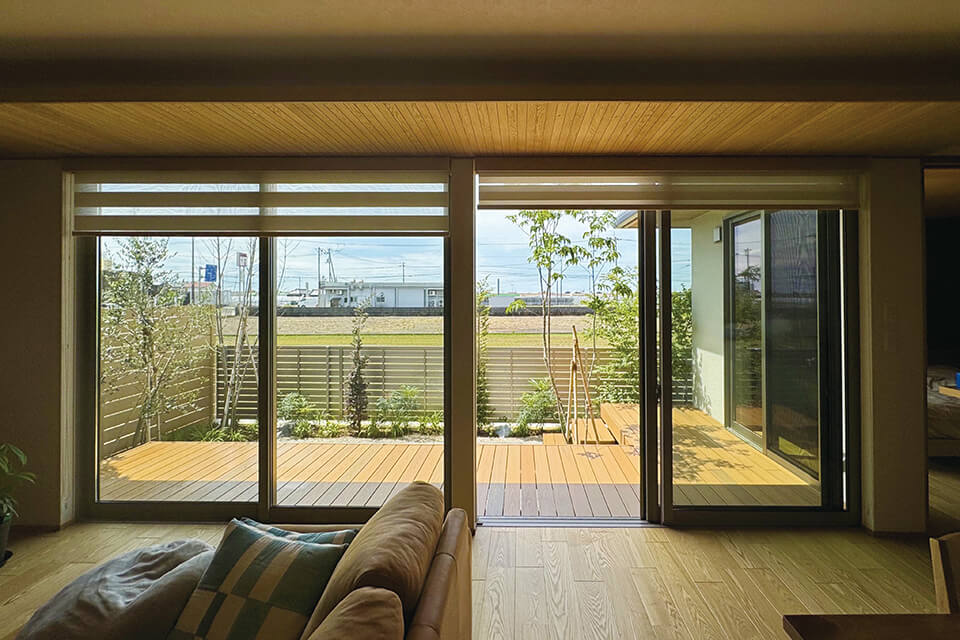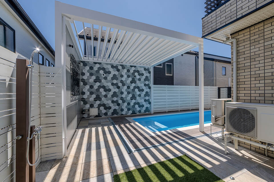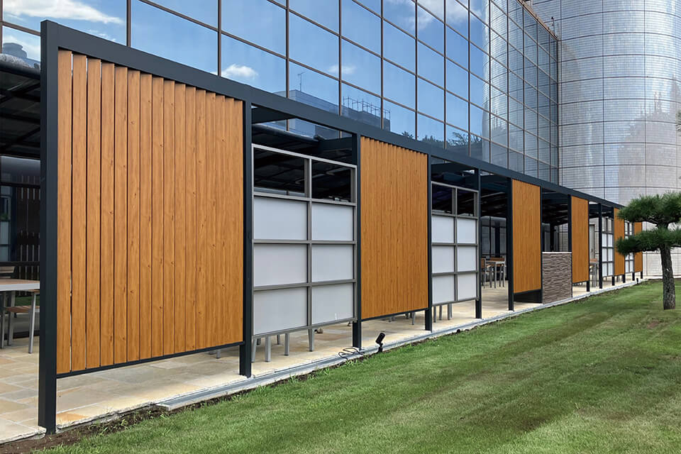 三角形の形状や庇がないことでお悩みだったお庭が「ホームヤードルーフシステム」によって快適に過ごせるお庭に生まれ変わりました。テラスの天井の半分に「エバーアートボード」を取り付けたことで、建物の庇の代わりになっています。もう半分は「ロープ式開閉シェード」にしたことで、必要に応じて開閉できる仕様に。これにより、テラス内には心地よい自然光が差し込み、リビングや屋外空間が明るく、開放的な雰囲気になります。実用性とデザイン性を兼ね備えたテラスは、お庭でのひとときをより豊かにし、家族やゲストが集まる魅力的なスペースとなりました。