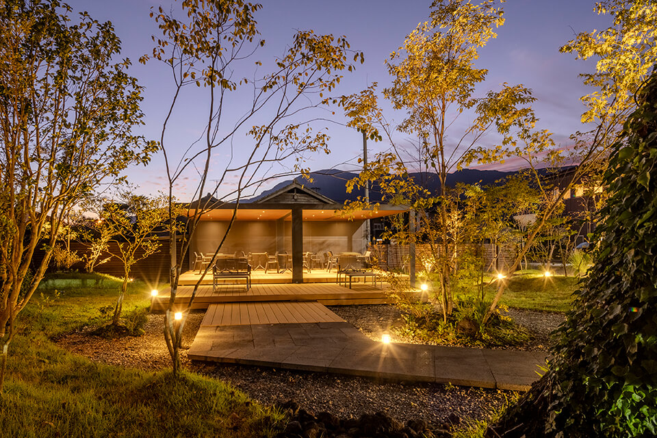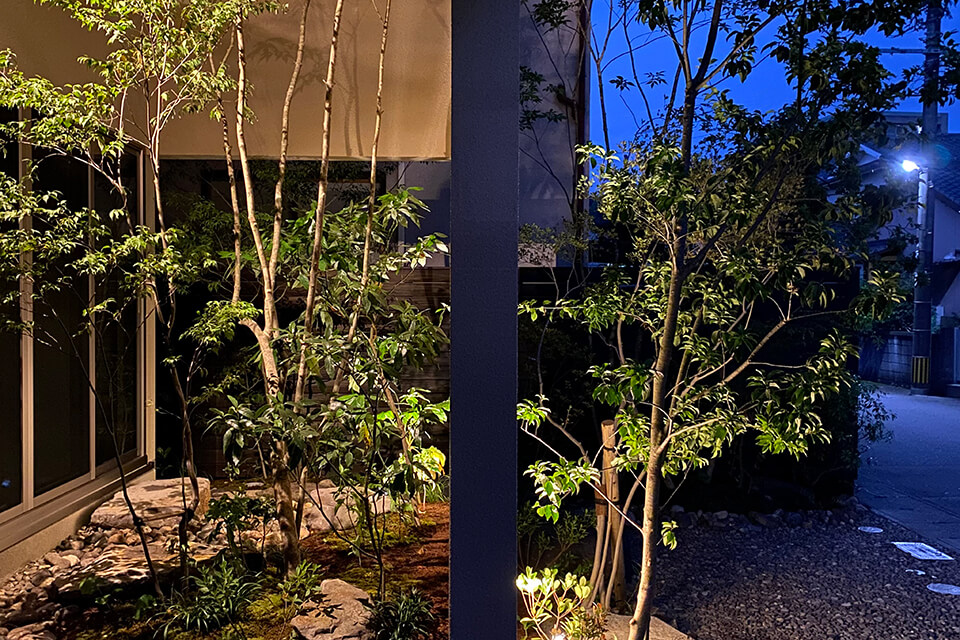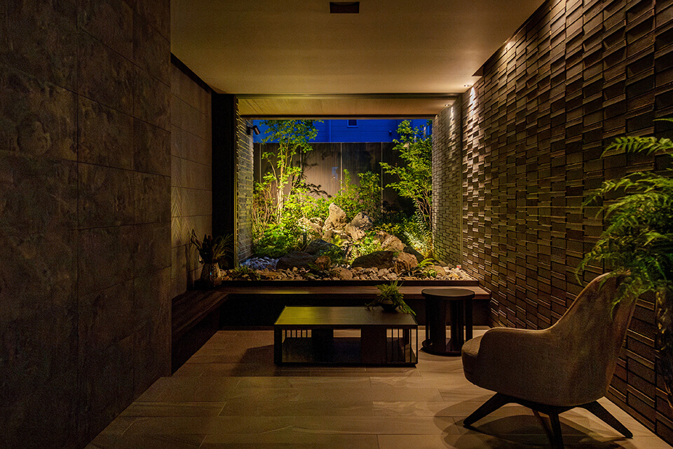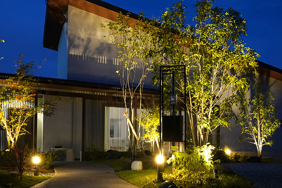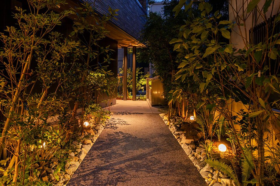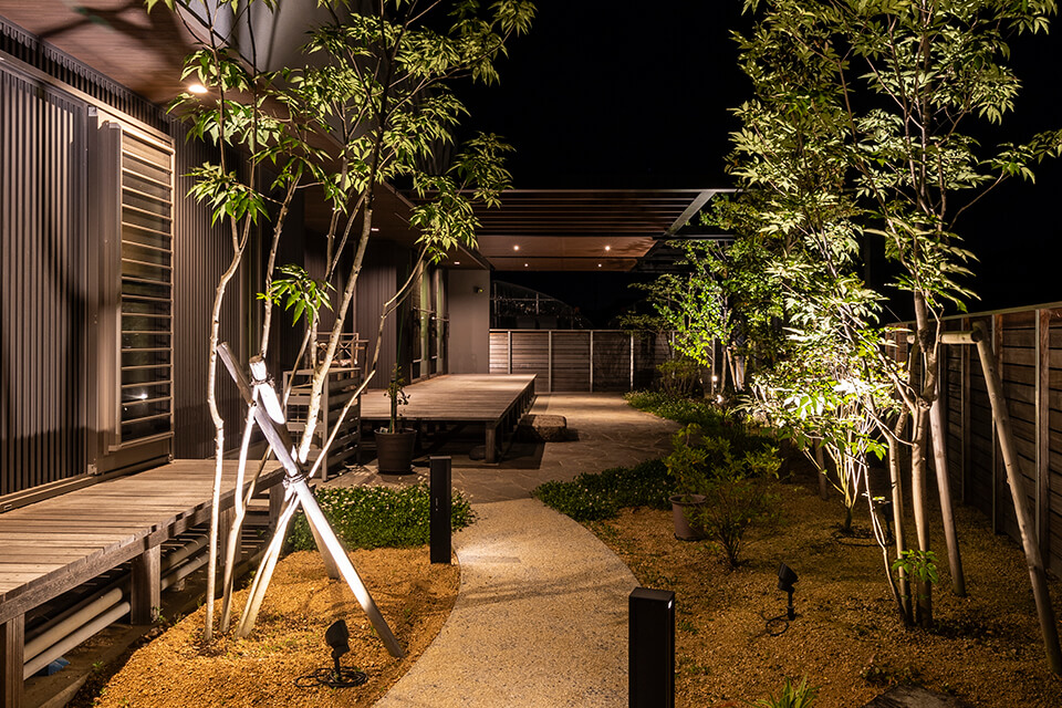 水面に映る光や壁面に投影された樹影が幻想的な美しさを生む庭空間。特に「ガーデンアップライトミオ」の照射方向が工夫されており、植栽や建築、水面に作用してそれぞれの魅力を引き立て、空間全体の価値を高めています。光によって自然の素材がより美しく際立ち、昼間とは違った癒しと安らぎをもたらす非日常感のある空間に。光と水と緑の調和・陰影のバランスが上品で、高級リゾートのような雰囲気に仕上がっています。