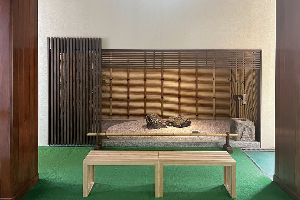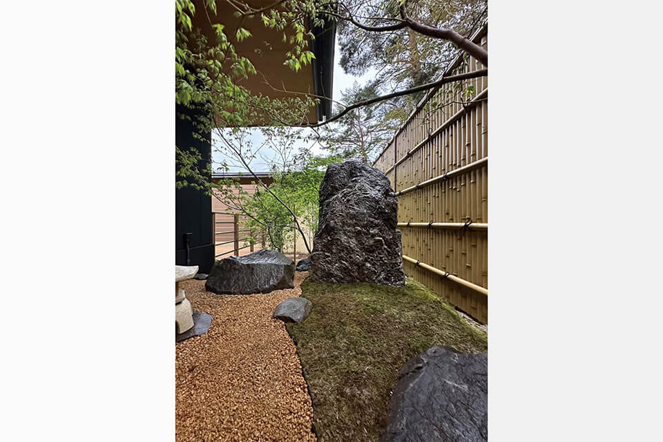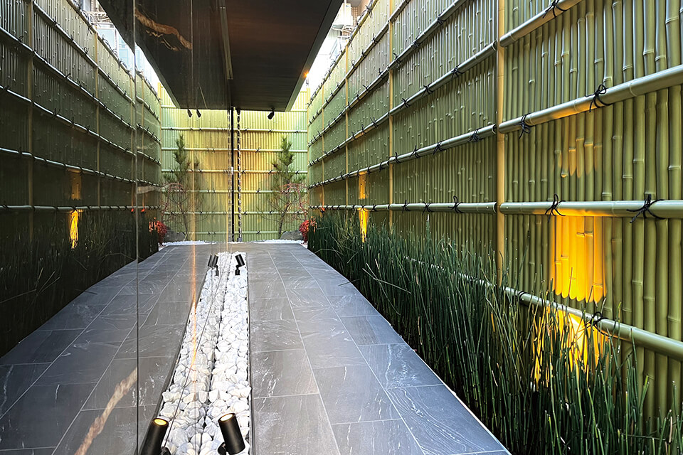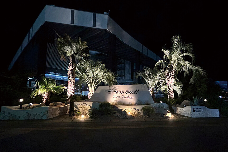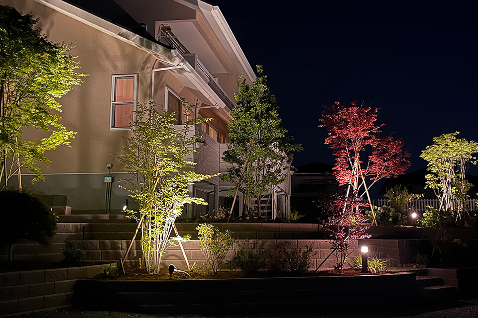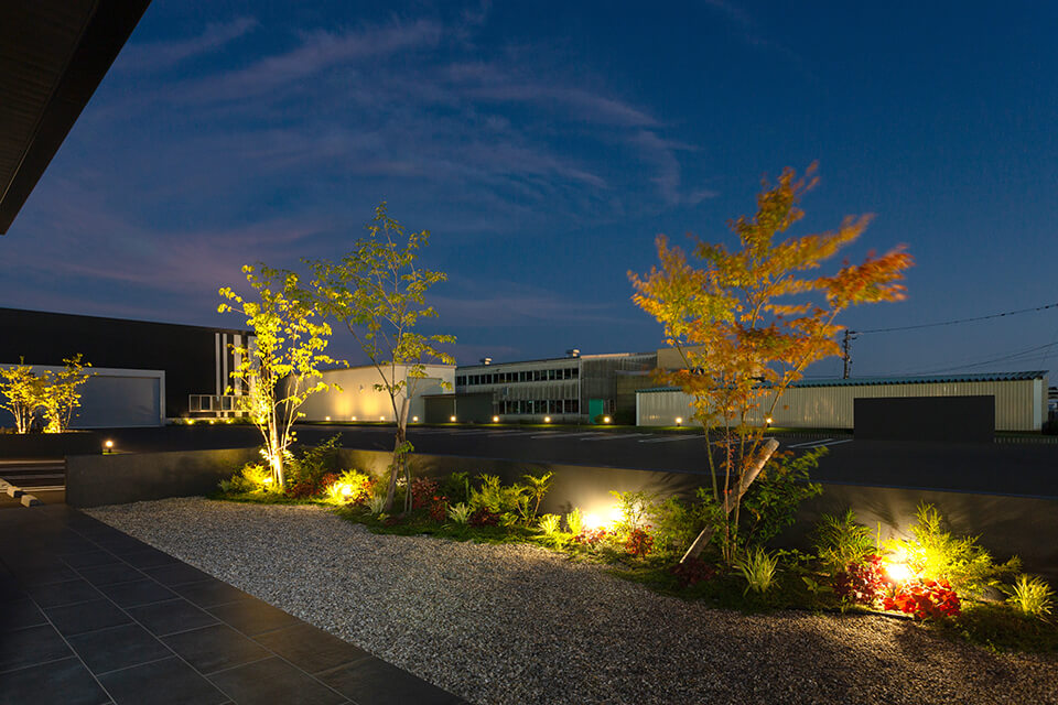 水面に映る光や壁面に投影された樹影が幻想的な美しさを生む庭空間。特に「ガーデンアップライトミオ」の照射方向が工夫されており、植栽や建築、水面に作用してそれぞれの魅力を引き立て、空間全体の価値を高めています。光によって自然の素材がより美しく際立ち、昼間とは違った癒しと安らぎをもたらす非日常感のある空間に。光と水と緑の調和・陰影のバランスが上品で、高級リゾートのような雰囲気に仕上がっています。